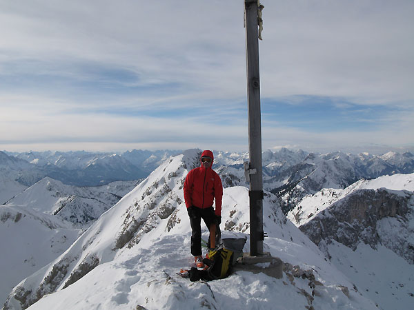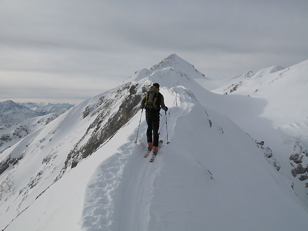 Tourenverhältnisse: Schneemenge völlig ausreichend. Harte Unterlage, darüber Pulver - leider mit Kruste. Dennoch war es mit entsprechender Technik gerade in den flacheren Bereichen ganz gut zu fahren, die Kruste war eher dünn. Eine kurze südseitige Passage war ziemlich harchig. Im Gipfelbereich alles windverblasen. Die Querung im Hasentalgraben war griffig, daher ganz gut zu gehen.