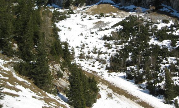 Der Abstieg ging dank Plastiktüte relativ flott. Der Forstweg ist ab der Buchaueralm entweder eine Eisplatte oder völlig schneefrei, also kein Gedanke an eine Abfahrt.