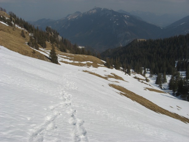 Tourenverhältnisse: Wege waren bis ca. 1200 m aper oder nur etwas schneebedeckt. Beim Weiterweg von Ost nach West wurde der Schnee mehr mit leichter "Einbruchgefahr" (Spur hat nicht immer getragen). Am besten geht man nicht bis zum Joch zwischen Zinnenberg und Klausenhütte, sondern biegt bereits am Südhang nach rechts zur Klausenhütte ab. Der kurze Grataufstieg von der Klausenhütte zum Gipfel war wiederum fast aper.