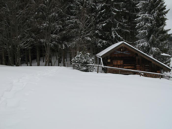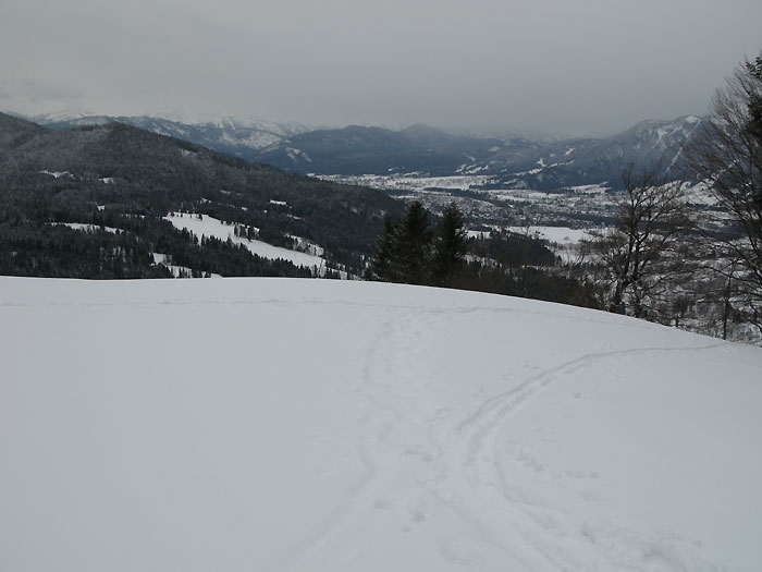 Tourenverhältnisse: Wetter: stark bewölkt, jedoch hohe Bewölkung und damit gute Sicht, eher warme Temperaturen, etwas über 0°. Schnee ausreichend, da Unterlage sehr gut gesetzt. Oben drauf ca. 15 cm Neuschnee, noch völlig unverspurt. Die Unterlage war stark durchfeuchtet, jedoch tragend, so dass das Runterfahren in schwerem, feuchten Pulver Spaß gemacht hat.
