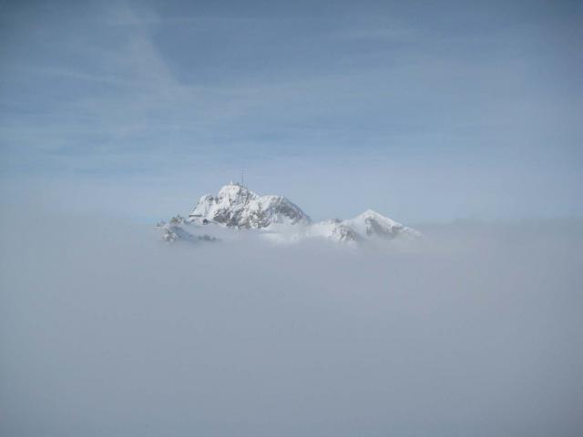 Tourenverhältnisse: neblig, der Gipfel ragte um 5 m aus der Nebelsuppe; Schnee großteils Bruchharsch und etwas Pulver, große Schneehöhe