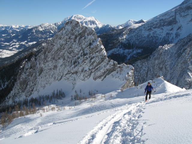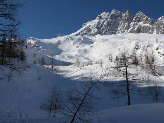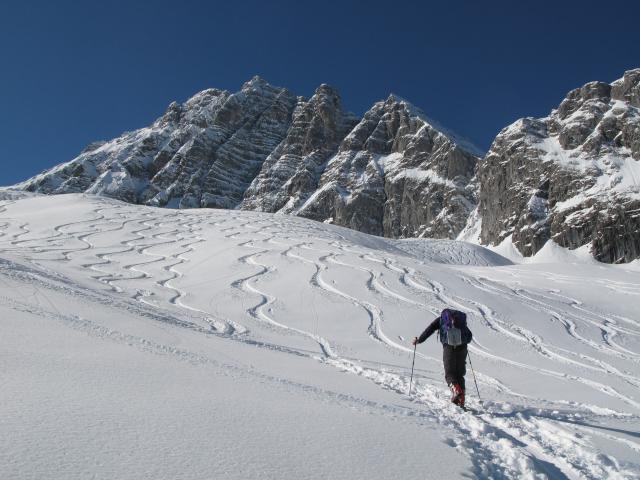 Gefahreneinschätzung: Auf der Hauptroute gering. Die Abfahrtsvariante unter der Schärtenspitze wurde von kleineren Lockerschneelawinen bestrichen, die sich aus den sonnenbeschienen Wänden lösten.