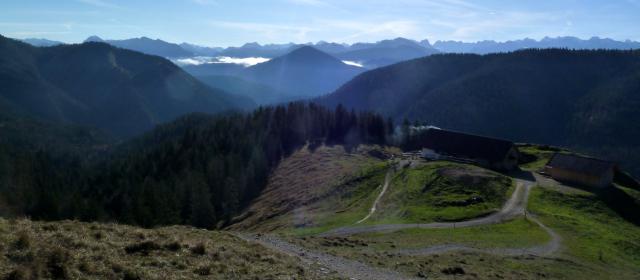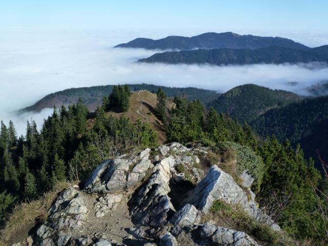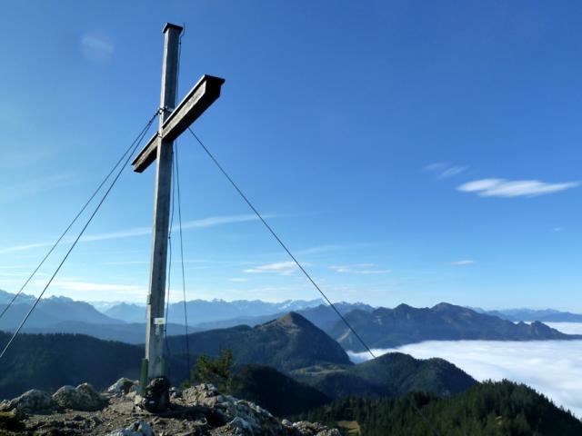 Tourenverhältnisse: Meine alljährliche Reifenwechsel-Autowerkstatt-Tour. Während im Tal gewerkelt wird, heute mit dem MTB zur Staffel-Alm (hat noch geöffnet!), weiter in 25 Min. zu Fuß zum Gipfel (geht problemlos mit Radlschuhen). Alles trocken und (wieder) schneefrei. Heute dort Sonne pur - wenige km weiter nördlich und auch überm Kochelsee westlich unterhalb des Gipfel breitete sich derweil das Wolkenmeer aus.
