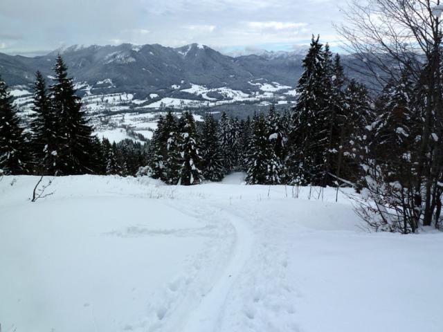 Tourenverhältnisse: Heute noch kein Pistenbetrieb, geht morgen los. Ist alles mal gewalzt worden, sodass man belagschadensfrei runterkommt. Im oberen Teil vom Ahornkessel (da, wo keine Schneekanonen stehen) aber auf einer kurzen Passage gefühlte 300 Steine. Richtung Bachhang wird's dünner, ist für Tourengeher okay - Pistenfahrer würden schimpfen. Im freien Gelände (z.B. am Kotigen Stein / Aufstiegsspur) ca. 40 cm: unten minimal gesetzt, oben Pulver mit Stich.