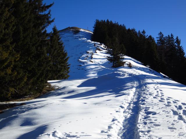 Tourenverhältnisse: Aufstieg über Tegernseer Höhenweg und am beschilderten Abzweig über den Waldwirtschaftsweg zum Gasthof Riederstein/Galaun; dann weiter über die Riederstein-Kapelle zum Gipfel. Bis zur Kapelle war der Weg so gut wie schneefrei. Danach anfangs eine dünne Schneedecke, die teils etwas glatt war. Im weiteren Verlauf etwas mehr Schnee; dafür aber eine gute Spur. Abstieg über den unmarkierten Weg, der gleich unterhalb des Gipfelhangs im Abstiegssinn links (südlich) abzweigt. Anfangs etwas Schnee; gut zu gehen. Im Mittelteil viele batzige Abschnitte und weiter unten dann trocken (der Weg biegt kurz vorm Parkplatz bei dem Schild "Sackgasse" in den Fahrweg zum Riederstein-Gasthof ein).