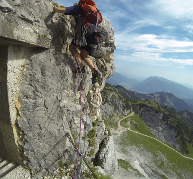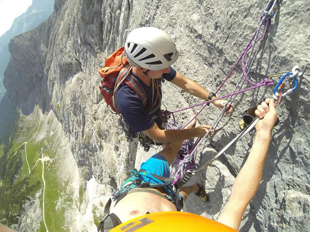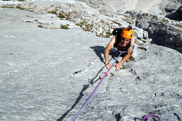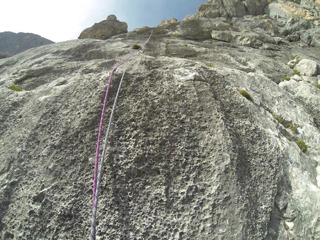 Tourenverhältnisse: Trotz Nordseite und einer Höhenlage von über 2000 m war es bereits am Vormittag sehr warm. Erst als Wolken aufzogen wurde es angenehmer. Ab 14 Uhr hat es zum Regen angefangen, aber da waren wir bereits beim Tourenabschlussbier:-). Die Tour startet direkt beim Tunnelausgang am Nordwandsteig und führt in 4 langen Seillängen durch eine kompakte Plattenzone mit bestem wasserzerfressenem Fels hoch. Wir sind danach über die Tour Pro 3 (3 Längen) ausgestiegen. Die Route ist mit Bohrhaken gut ausgerüstet, in der ersten Länge auch weite Abstände (4 Haken auf 45 m). Schlingen und ein paar mobile Klemmgeräte können nicht schaden. Für den angegeben Schwierigkeitsgrad nicht ohne.