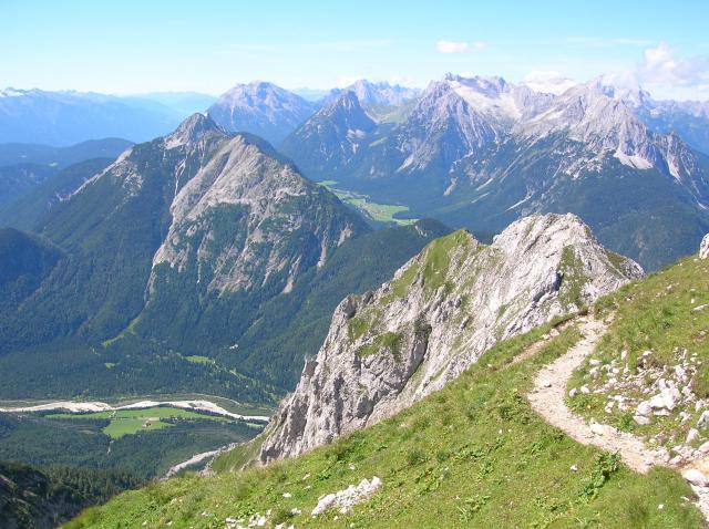 Sonstiges: Das Sonnenwetter gestern genutzt und den Mittenwalder Höhenweg 'in Angriff' genommen. Per Seilbahn von Mittenwald in fünf Minuten rauf zur Bergstation auf 2243m. Oben dann ein kleiner Temperaturschock zu verkraften, denn es hatte gerade mal 3 Grad über Null. Und das im Sommermonat August. Egal, die Sonne wärmte ja angenehm und nach 20Minuten hat man die Masse der Leute die mit Halbschuhen auf dem Berg unterwegs sind hinter sich gelassen und es beginnt der Klettersteig der extrem aussichtsreich und perfekt gesichtert über die Grate Richtung Süden verläuft.