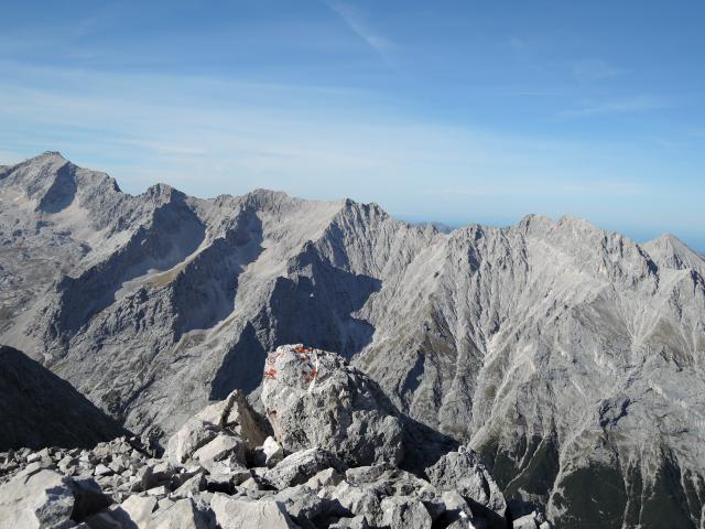 Gestern mit meinem Bergkameraden Michael mit den Mountainbikes im Auto früh aufgebrochen Richtung Leutasch/Gaistal. Haben uns als Ziel den wenig bekannten Hochwanner ausgesucht, dem man sich zudem prima 700hm per MTB nähern kann um dann die restlichen ca.800hm zu Fuß zu bewältigen. Parken beim hintersten PP in der Leutasch wo die Touren um das Gaistal starten. Nach recht flachen Radlkilometern zu Anfang geht es ab der Gaistalalm dann doch ordentlich bergauf. Der obere Teil ist dann auch grobschottrig und steil aber noch problemlos fahrbar. Bei einer kleinen Hütte, wo der Fahrweg nach rechts zur neuen Rotmoosalm weiterführt sperrt man die Räder ab. Zu Fuß weiter auf den Sattel unterhalb des Predigtsteins und von dort immer ungefähr auf gleicher Höhe rüber Richtung Mitterjöchl. Bevor der Weg wieder bergab führt, verlässt man diesen und quert gerade oder auch leicht ansteigend hinüber bis man die Pfadspuren des Aufstiegs vom Mitterjöchl kreuzt. Nun steil aufwärts, den ersten Felsaufbau links umgangen, weiter über eine Schuttreiße, erreicht man einen weiteren Felsaufbau, den man mittig über einen Kamin (markiert mit einem großen W) in einfacher Kletterei durchsteigen kann. Nun zieht der Weg nach rechts (mit Steinmännern markiert) weiter bevor man über sehr lange und steile Schuttreißen zum Gipfel gelangt. Der Gipfel bietet unglaubliche Ausblicke auf Zugspitze, Jubiläumsgrat, Alpspitze sowie das Tal um Garmisch. Kaum zu verstehen dass sich hier kaum jemand rauf verirrt (gestern haben wir ganze 4! weiter Wanderer getroffen) und das Garmischer Gebiet mit Zugspitze, Alpspitze bei dem Wetter gestern von Wanderern wohl wieder überrant wurde. Andererseits ist es ganz gut so, dass so ein schönes Ziel kaum jemand begeht. Den zweithöchsten Gipfel Deutschlands.