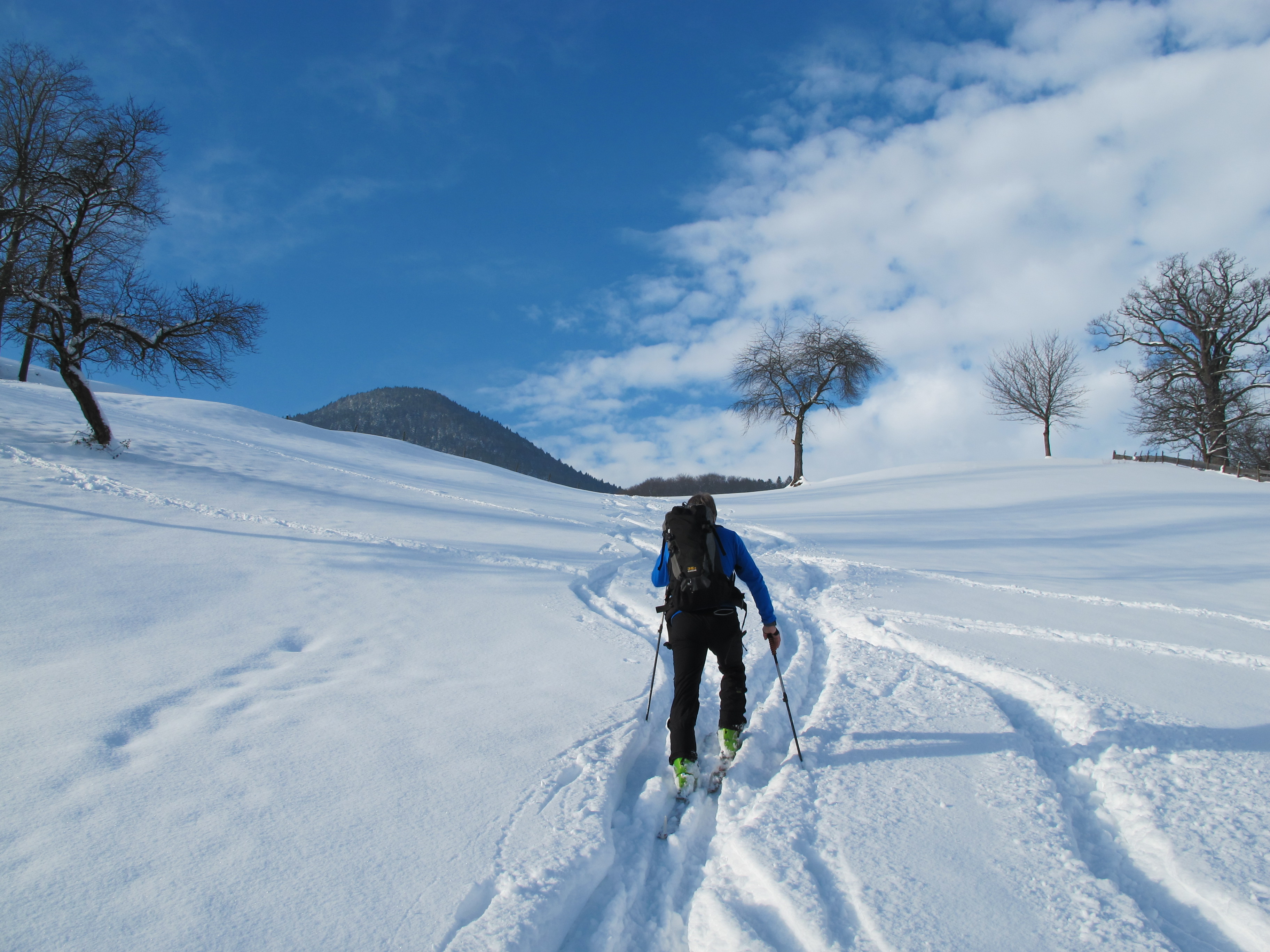 Tourenverhältnisse: Wir sind nicht vom üblichen Wanderparkplatz (Schuhbräualm) gestartet, sondern schon unten im Tal. Die Bauernwiesen waren so schön verschneit, dass wir uns diese makelosen Wiesenhänge nicht entgehen lassen wollten. Dann über die gut eingeschneite Forststraße zur Schuhbräualm und weiter auf dem kleinen Hohlweg zur Schlipfgrubalm. Die Hänge um die Rampoldalm waren dann entweder ziemlcih abgeblasen oder stark eingeweht und nicht ungefährlich. Ich hatte also bedenke was die Abfahrt anging. Am Gipfel eröffnet sich dann jedoch eine Direktabfahrt nach Norden und die bot erstaunlich tolle Schneeverhältnisse.