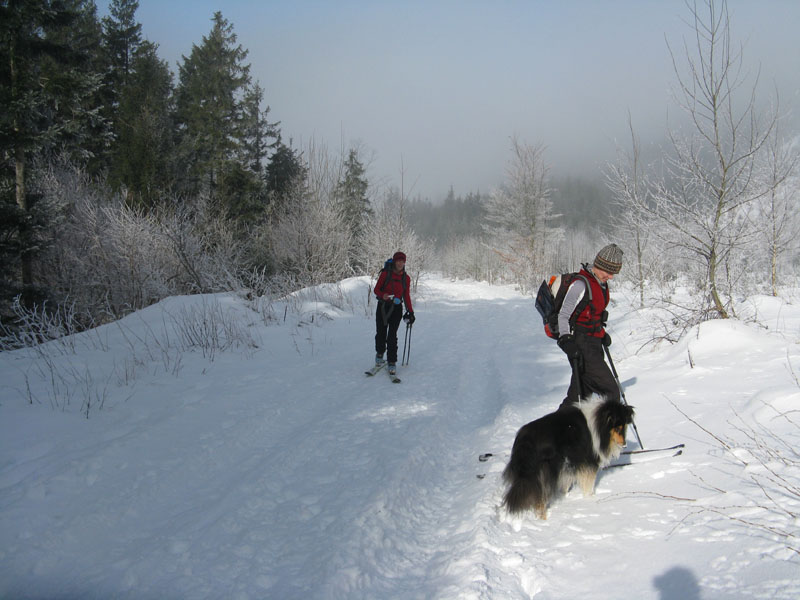 Unser urspüngliches Vorhaben war, vom Farrenpoint den Westhang runterzufahren (sehr schön), dann bei der Wegekreuzung auf 1042m, den nach rechts oben führenden Forstweg 30 hm hochzugehen, und dann ganz gemütlich um den Farrenpoint rum auf dem Forstweg nach unten zu gondeln. Man kommt unten dann am Talschluss (790m) raus, und kann noch über die flachen Hänge nach Litzldorf rausgleiten.