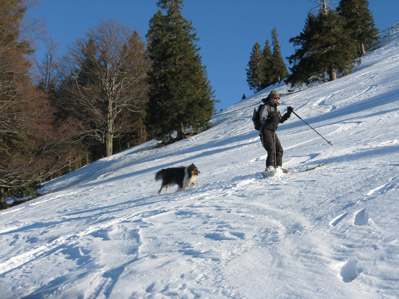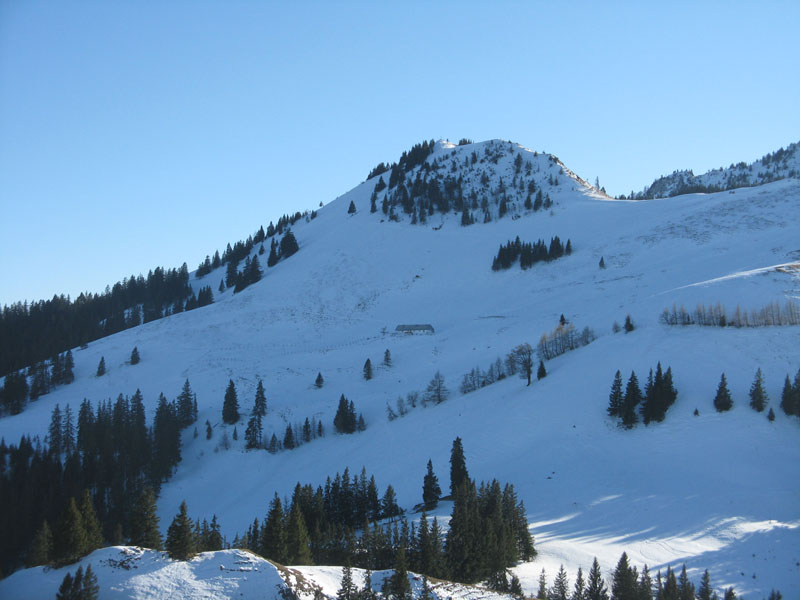 Sonstiges: Eigentlich wollten wir Farrenpoint und Mitterberg machen, aber der Farrenpointsüdhang wäre in ein Schneesuchspiel ausgeartet. Wir sind nicht den üblichen Aufstieg von Brannenburg gegangen sondern mal von Litzlbach hoch. Von Feilnbach kommend direkt nach der Kirche rechts rein in die Sulzbergstraße. Beim Abzweig "Zementwerk" parken (drei bis vier Parkplätze). Auf dem Forstweg ins Tal des Litzldorfer Bachs hinein. Am Talschluss nicht den Hauptweg weiter (der dreht um), sondern an der Beschilderung Farrenpoint / Schlipfgrubalm folgen (790m). Es geht etwas steiler auf einem schmalen Weg die Waldstufe hoch (nicht von den querenden vermeintlichen Forstwegen verleiten lassen; das sind nur kurze Wegstücke, die immer im Nichts enden). An der Hangkante (900m) dann trotz des Apfelstrudels nicht zur Schlipfgrubalm runter, sondern rechts Richtung Farrenpoint ca eine halbe Stunde durch den Wald auf einem breiten etwas ruppigen Fuhrweg zum Sattel zwischen Farrenpoint und Mitterberg (1105m). HIer könnte man dann rechts hinauf auf den Farrenpoint (1273m), der war aber ziemlich aper, daher sind wir nur rechts auf den Mitterberg (1214m).