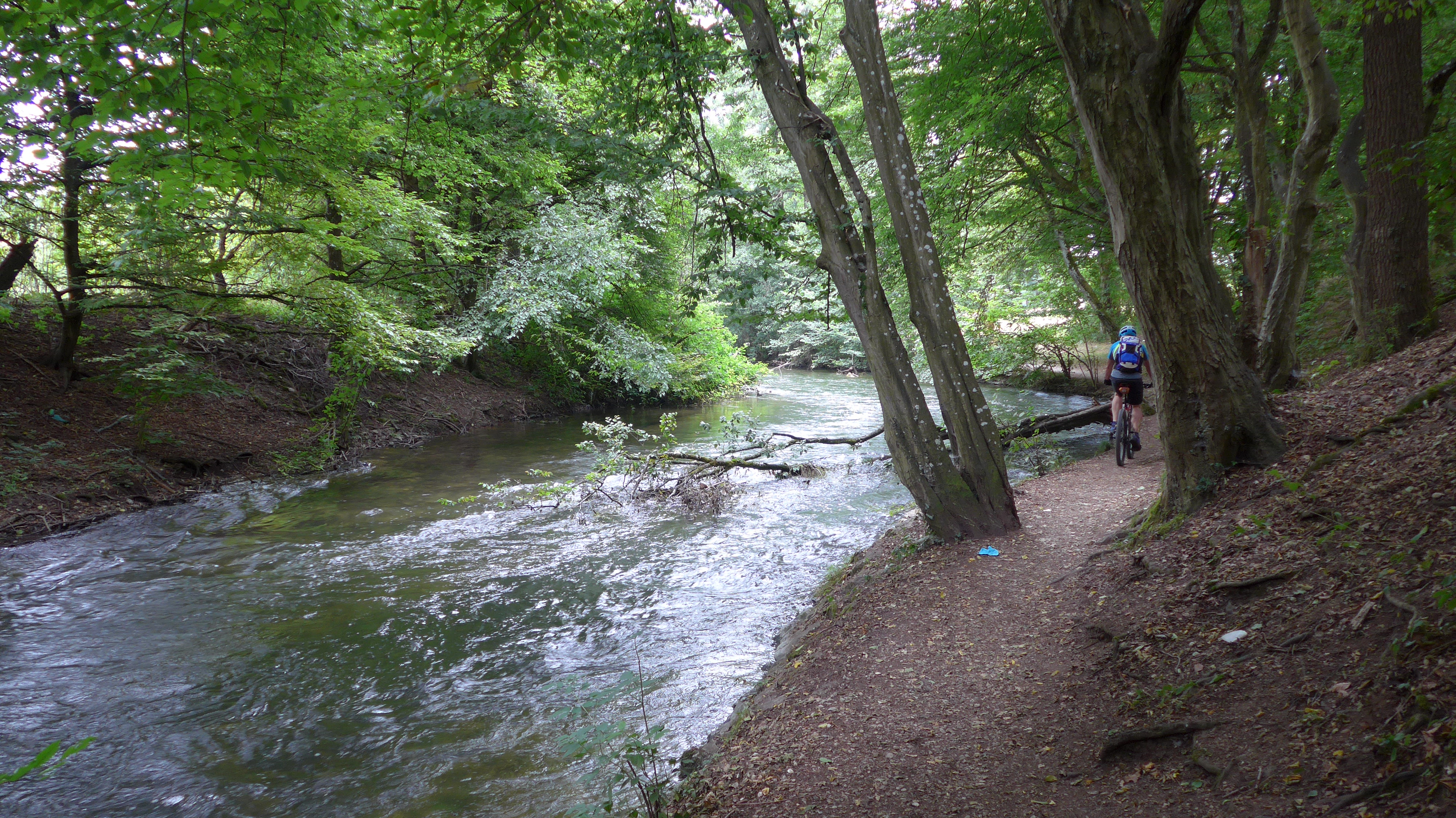 Nach ein paar Meter rollen fährt man Richtung Süden immer der Würm - ein Eiszeitjuwel - entlang. Es war meist trocken und fein zu fahren. Sehr abwechslungsreiche leichte Trails in zauberhafter Umgebung. Bis zum Biergarten in Leutstetten. Die Arme kommen bei der Fahrt auch nicht zu kurz - es liegen zahlreiche große Bäume auf dem Weg.