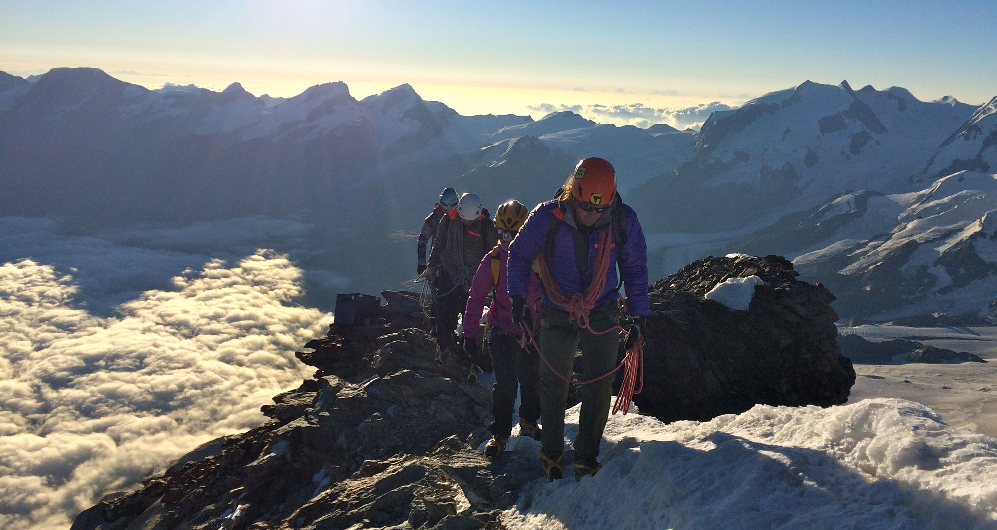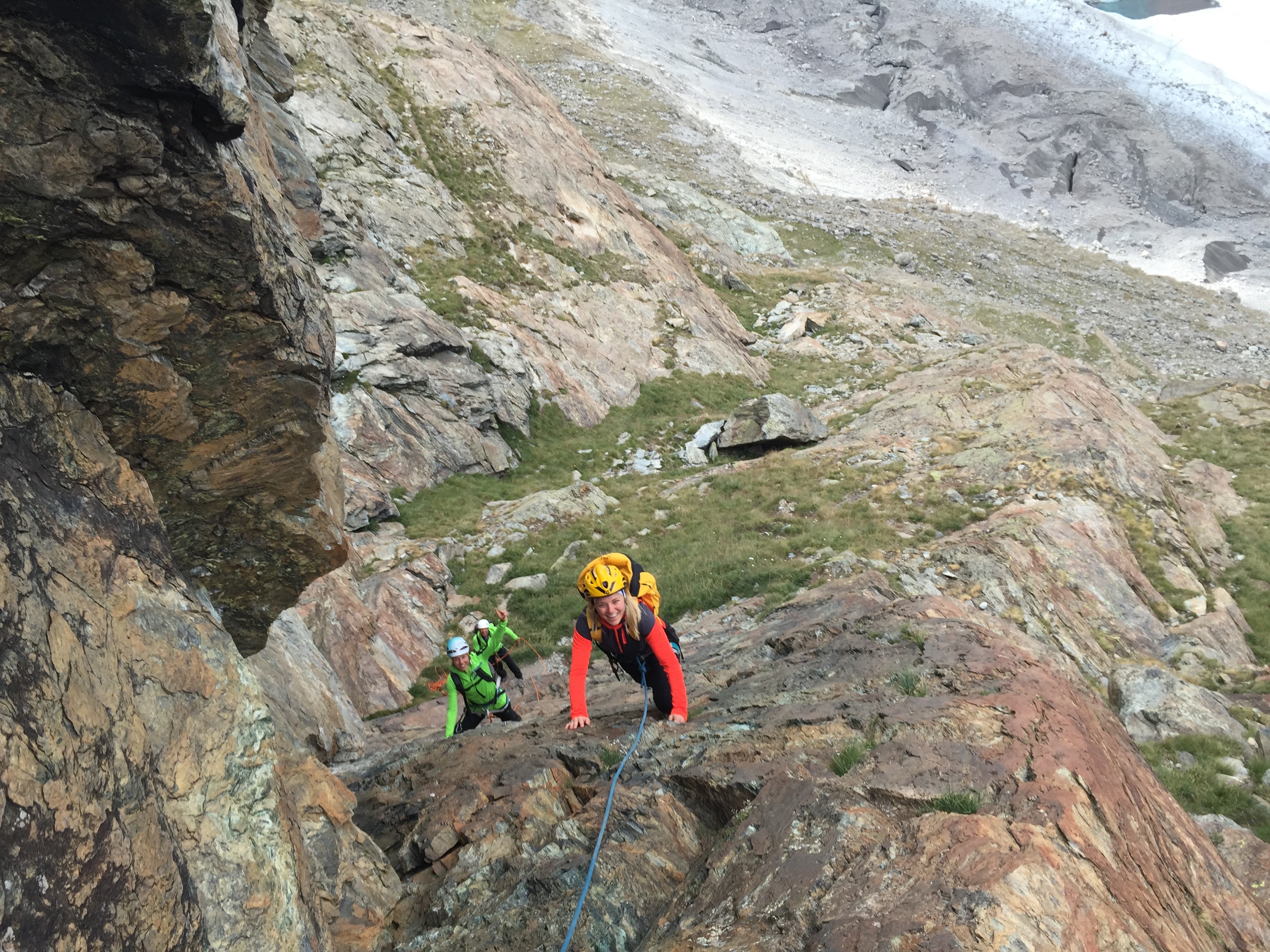 Das Warm-Up fand am nahe gelegenen Riffelhorn statt. Die Gruppe gewöhnte sich beim Plaisirklettern an die dünne Höhenluft.