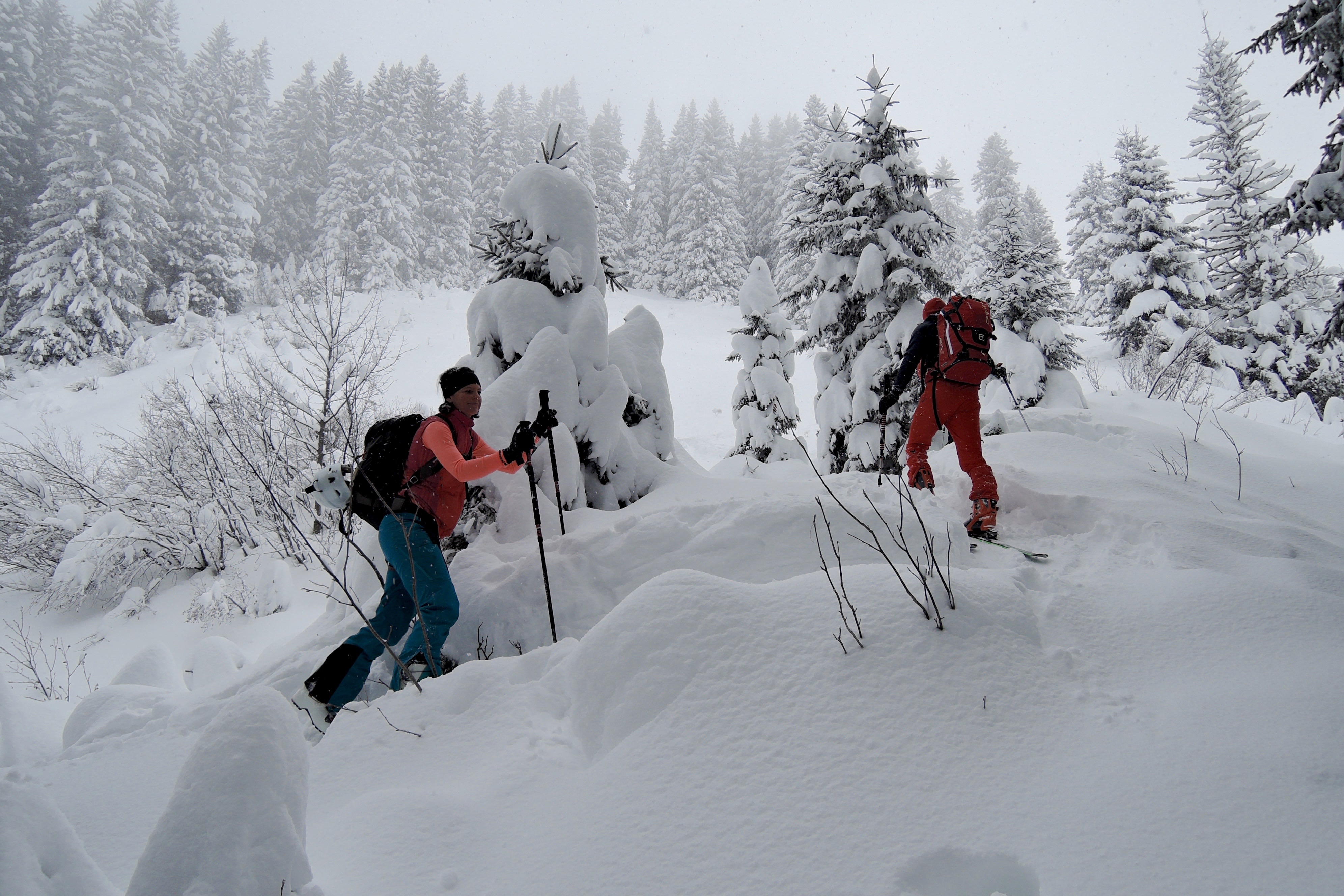 Tourenverhältnisse: Unten bereits 25cm cm Neuschnee, weiter oben in Lee noch mehr. In Luv jedoch Rücken abgeblasen.