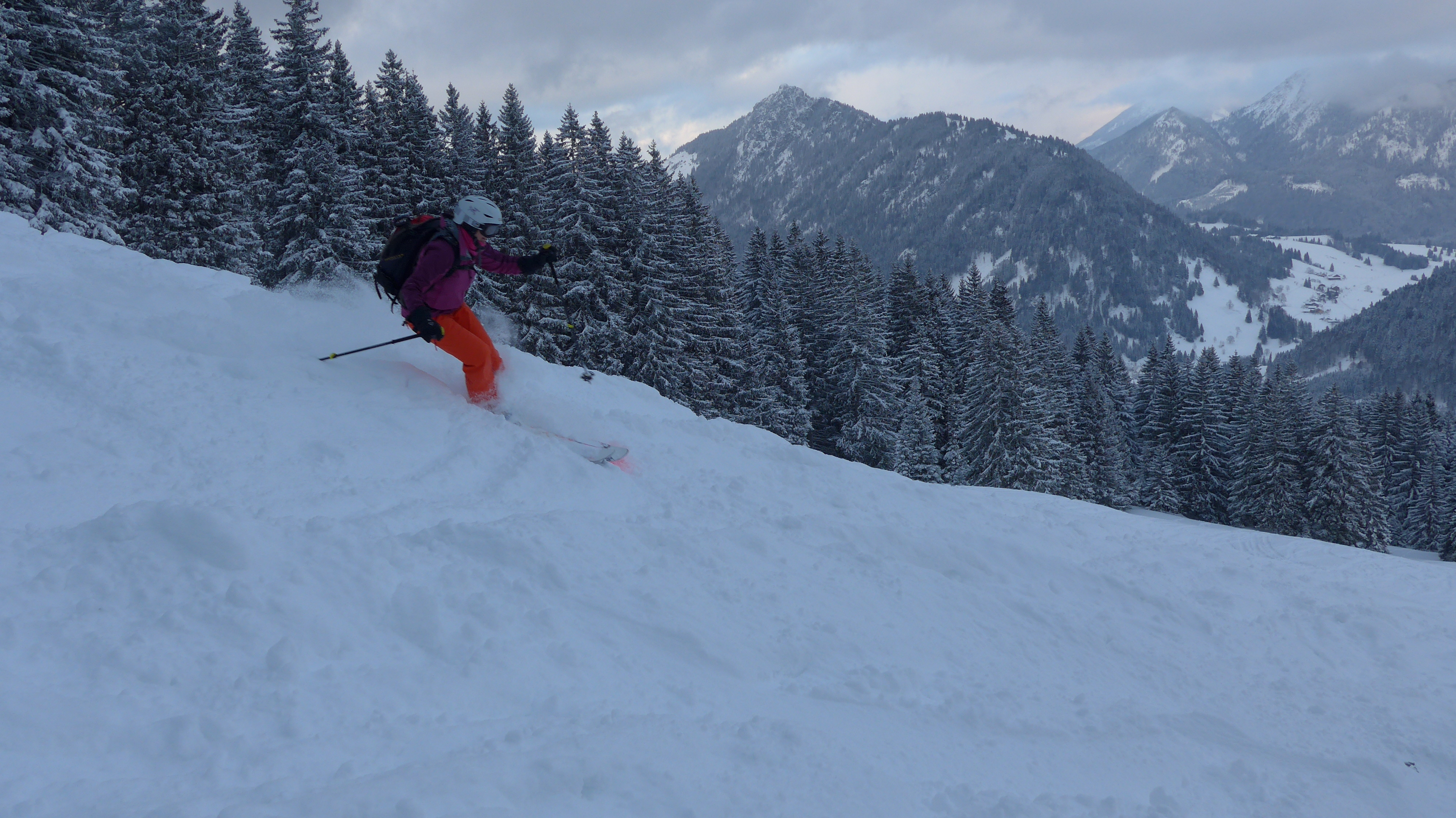 2. Abfahrt nahe der östlichen Aufstiegsvariante durch lichten Wald (unverspurt). Normalabfahrt verspurt, trotzdem fluffig.