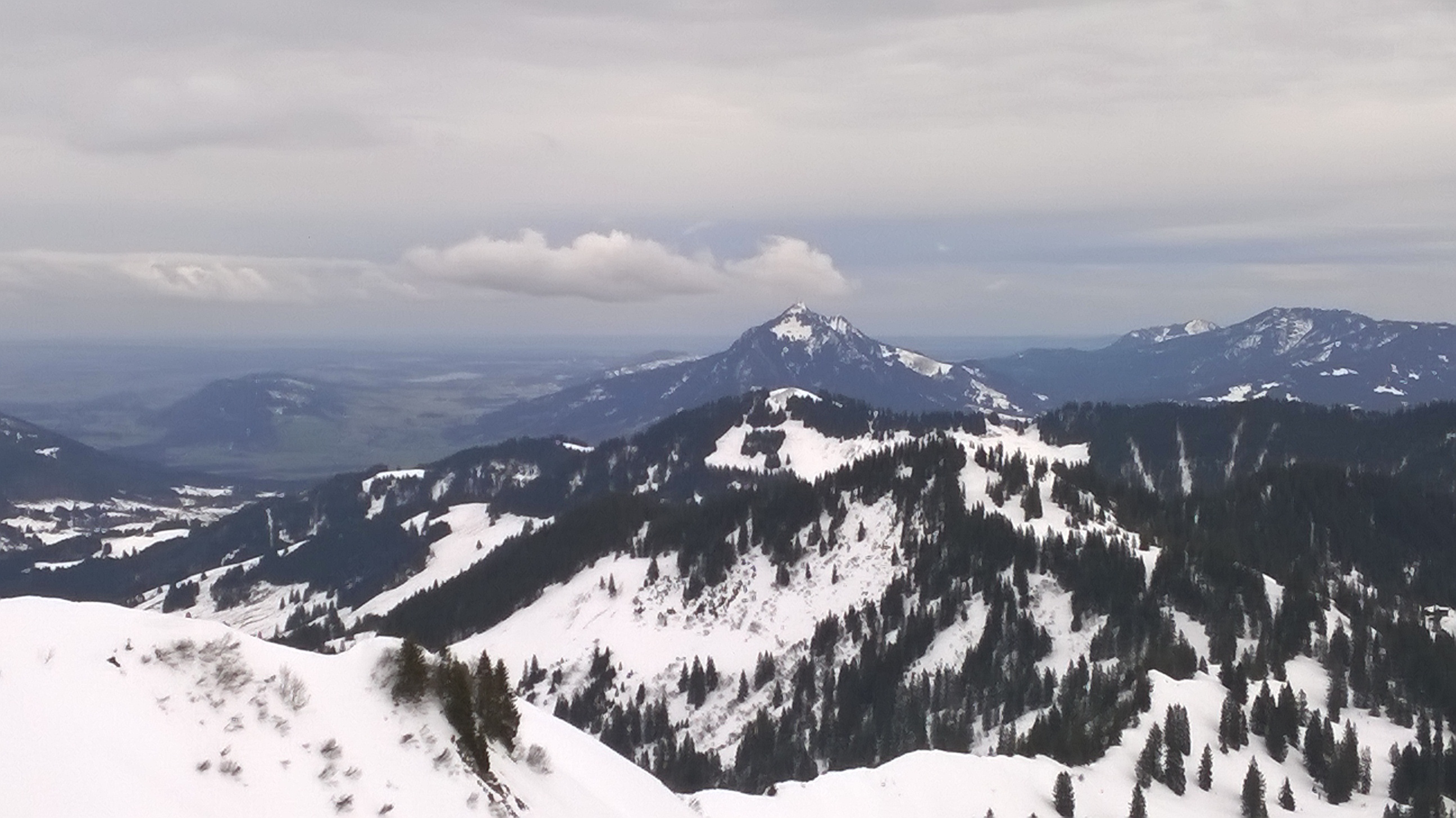 Tourenverhältnisse: Parkplatzsuche am späten Vormittag am Skigebiet Grasgehren sehr schwierig. Sobald man den Liftbereich verlässt lässt man Trubel hinter sich und man kann die herrliche Landschaft im baumfreien Gelände hinauf zum Riedberger Horn genießen. Obwohl viele Schneeschuh- und Tourengeher unterwegs sind lohnt die Route. Entweder rauf über den Ostgrat oder linker Hand über Familienabfahrt und den südlichen Grat hinauf. Super Aussicht rundum, Allgäuer Hauptkamm, Bregenzerwald. Die heranziehende Front mit Nebel und Schneefall hat einen Abstecher ins Bolgental verhindert. Gut dann denn direkten Weg über schöne freie Hänge zurück zum Startpunkt. Verzeichnete Wildschutzgebiet hier unbedingt meiden. Der Schnee war nord und ostseitig gerade noch pulvrig um angenehm abzufahren. Weiter unten eher schwerer. Schließlich starker Schneefall und null Sicht zurück im Skigebiet.
