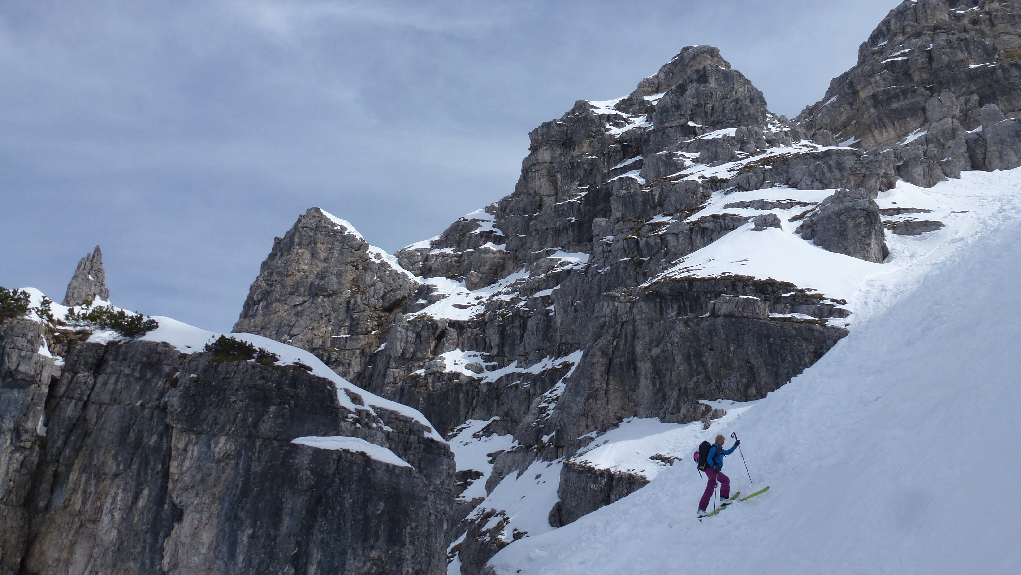 Den leicht überwächteten Grat zur heiklen Querung kurz unterhalb der Schöttelkarspitze begangen. Die Querung war uns zu spannend, bei dem Absturzgelände und der aufgeweichten Schneeauflage. Wendepunkt!