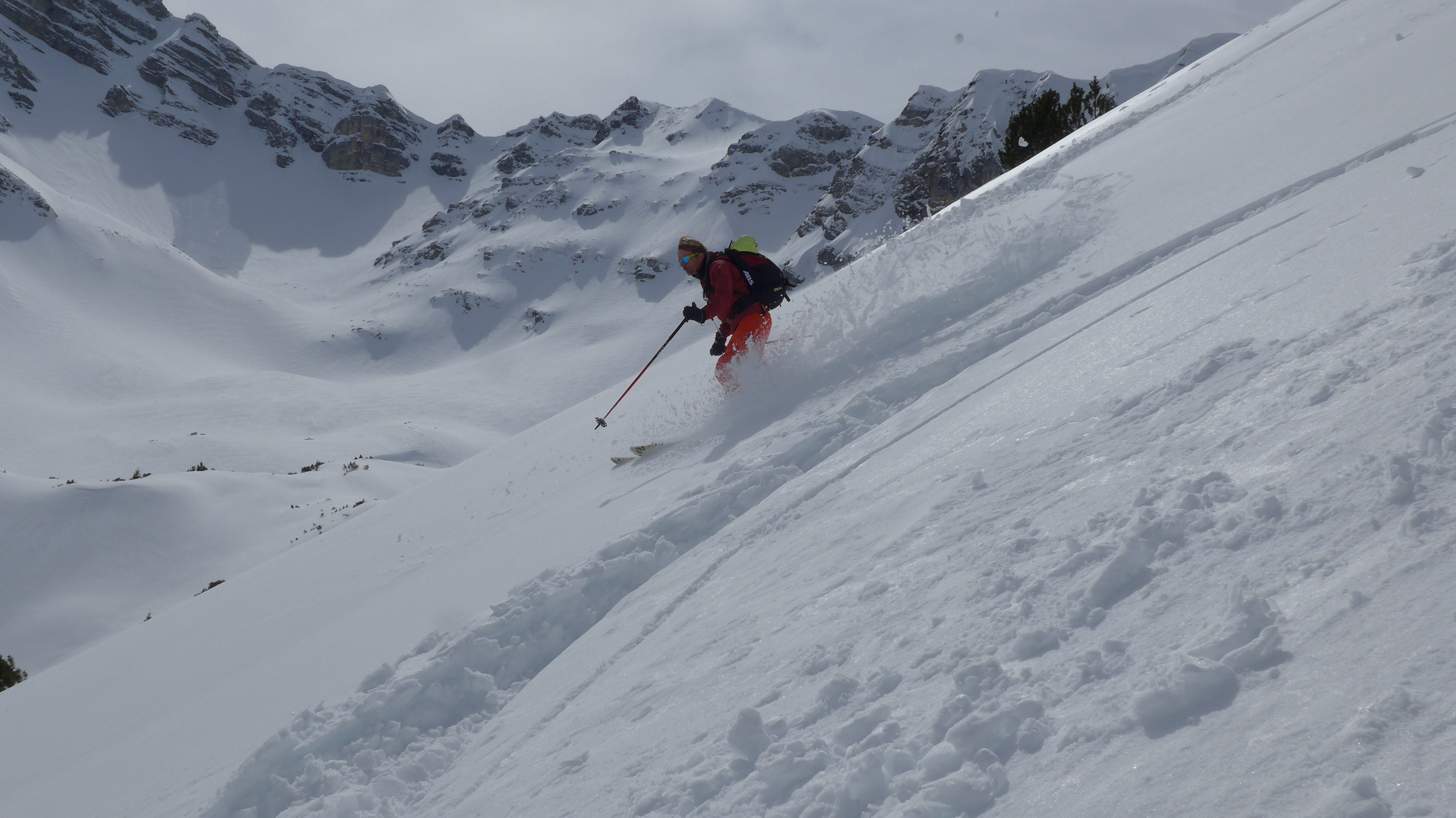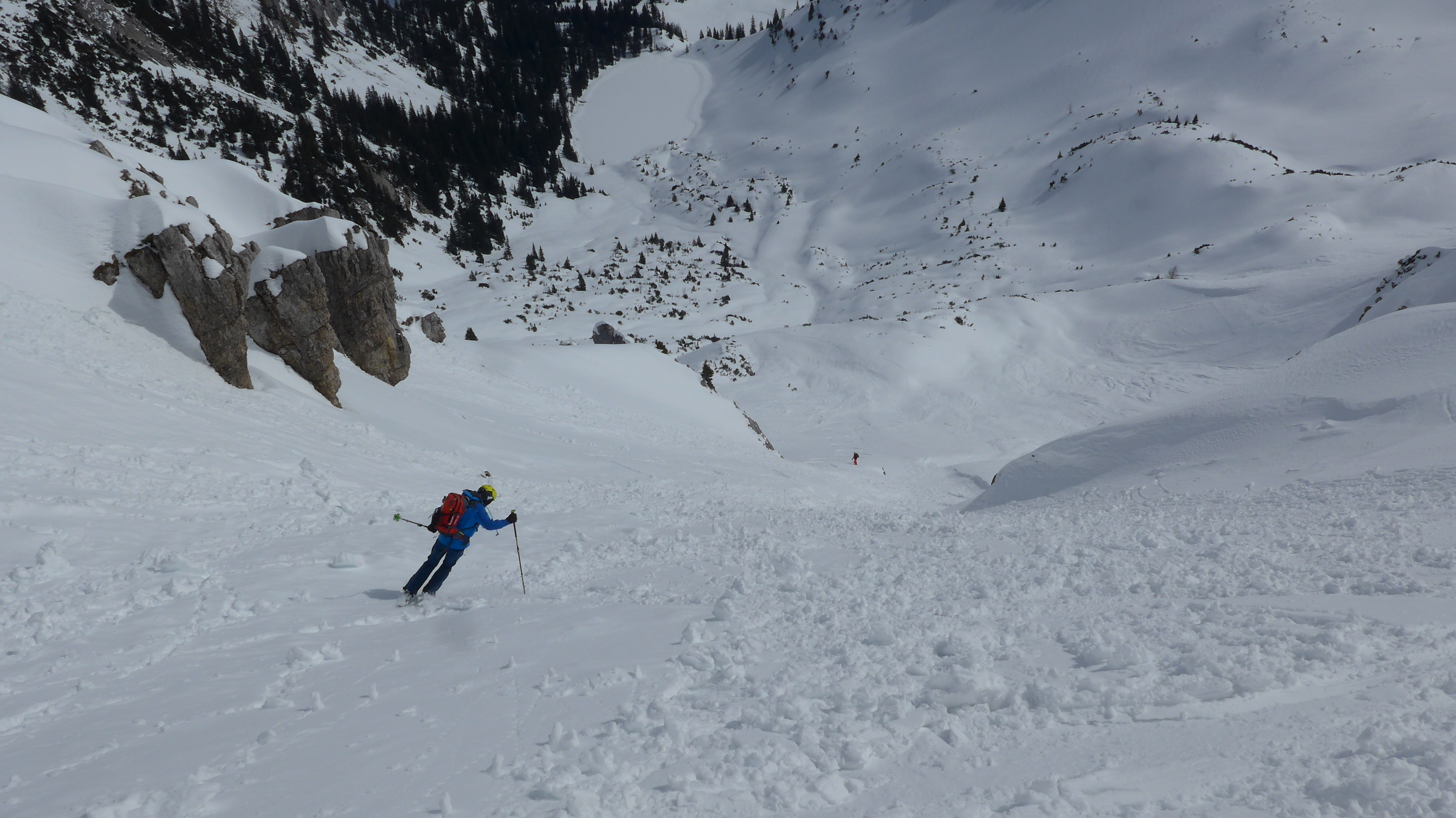 Umdisponiert! Die Ostabfahrt lockte mit einer schönen steilen Abfahrt im "Smoothie"-Schnee (noch kein Firn) zu den Soiernseen (recht windig). An der Bergwachthütte ein toller Rastplatz mit phenomenalem Ausblick.