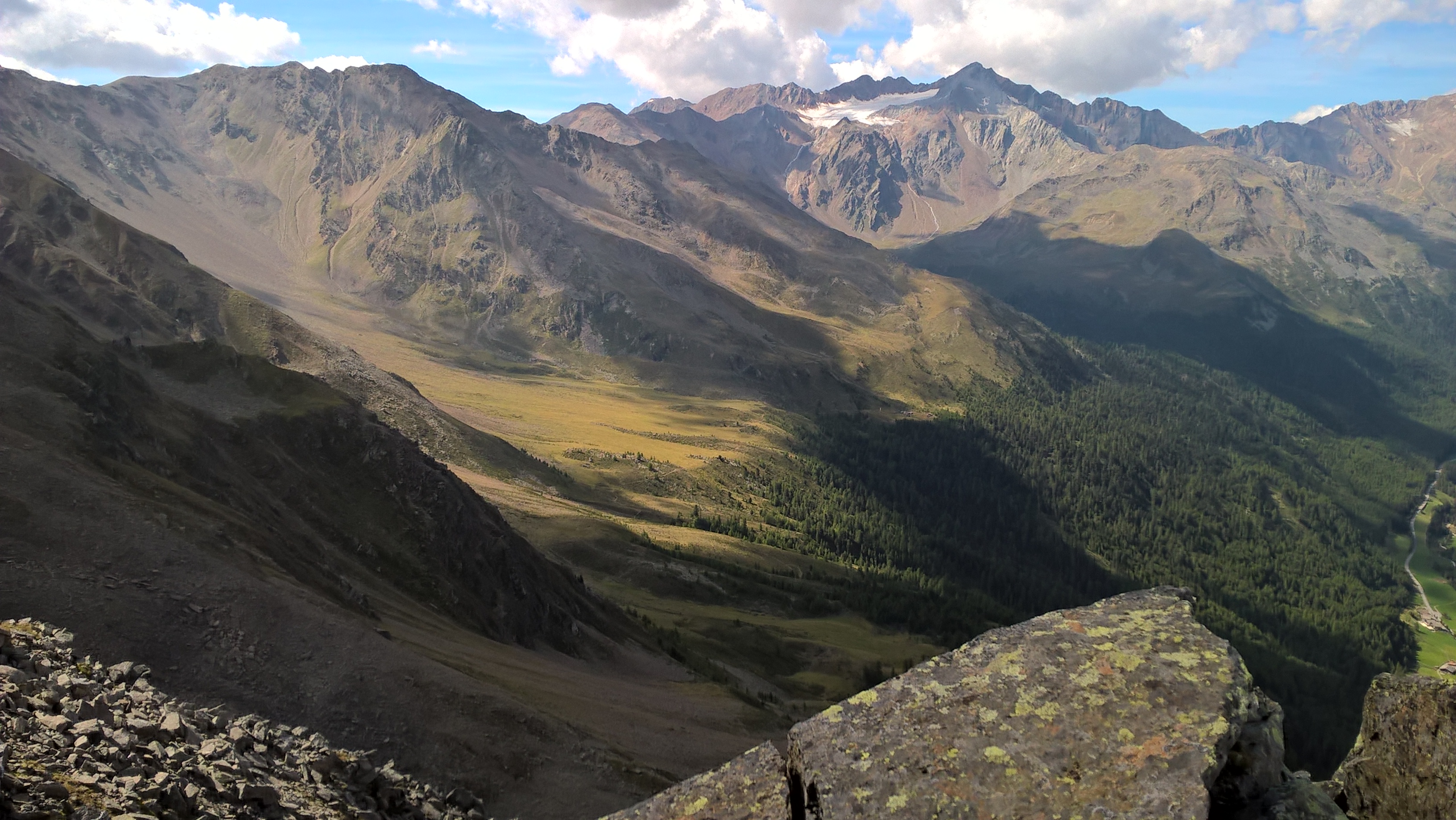 Tourenverhältnisse: Ein Tipp aus Alpenvereinaktiv hat uns auf diese einfache und schöne Bergtour im Schnalstal gebracht. Kondition ist erforderlich für 1200hm und ca. 6 Stunden Gehzeit. Die hervorgehobene Lage dieses Berges bietet ausgezeichnete Ausblicke auf Similaun, Fineilspitze, Weißkugel mit Gletschern. Ab dem Ort Unsere Frau in Schnals unterhalb des Vernagtstausees geht es durch herrliche Lärchen- und Zirbenwälder unschwer hinauf über Almgebiet ehe man die Baumgrenze erreicht. Spannend war ob man etwas von einmalig blauen Vernagtstausee von oben zu sehen bekommt. Was wir gesehen haben war mehr als was wir uns erhofft hatten. Der ganze tiefblaue See unter einem und keine Wolke am Himmel die den Blick trüben könnte. Die Stelle mit Tiefblick markiert ein markanter Steinturm. Genau hier treffen Weg 17 und 16 zusammen Richtung Gipfel (noch 1 Stunde zum Gipfel). Unter dem Gipfel kurz über Felsblöcke und leicht ausgesetzt aber nie schwierig. Von oben hat man dann wie schon geschrieben die hohen Ötztaler Gipfel im Blick. U.A. sieht man den langen Südaufstieg zur Similaunhütte. Der Abstieg führt südwärts auf gutem Weg in langen Serpentinen hinab ehe man auf 1800m die schöne Mastaunalm erreicht. Eine schöne und lohnende Einkehr nach dieser langen Tour. Von hier noch gut 30Minuten in Tal.