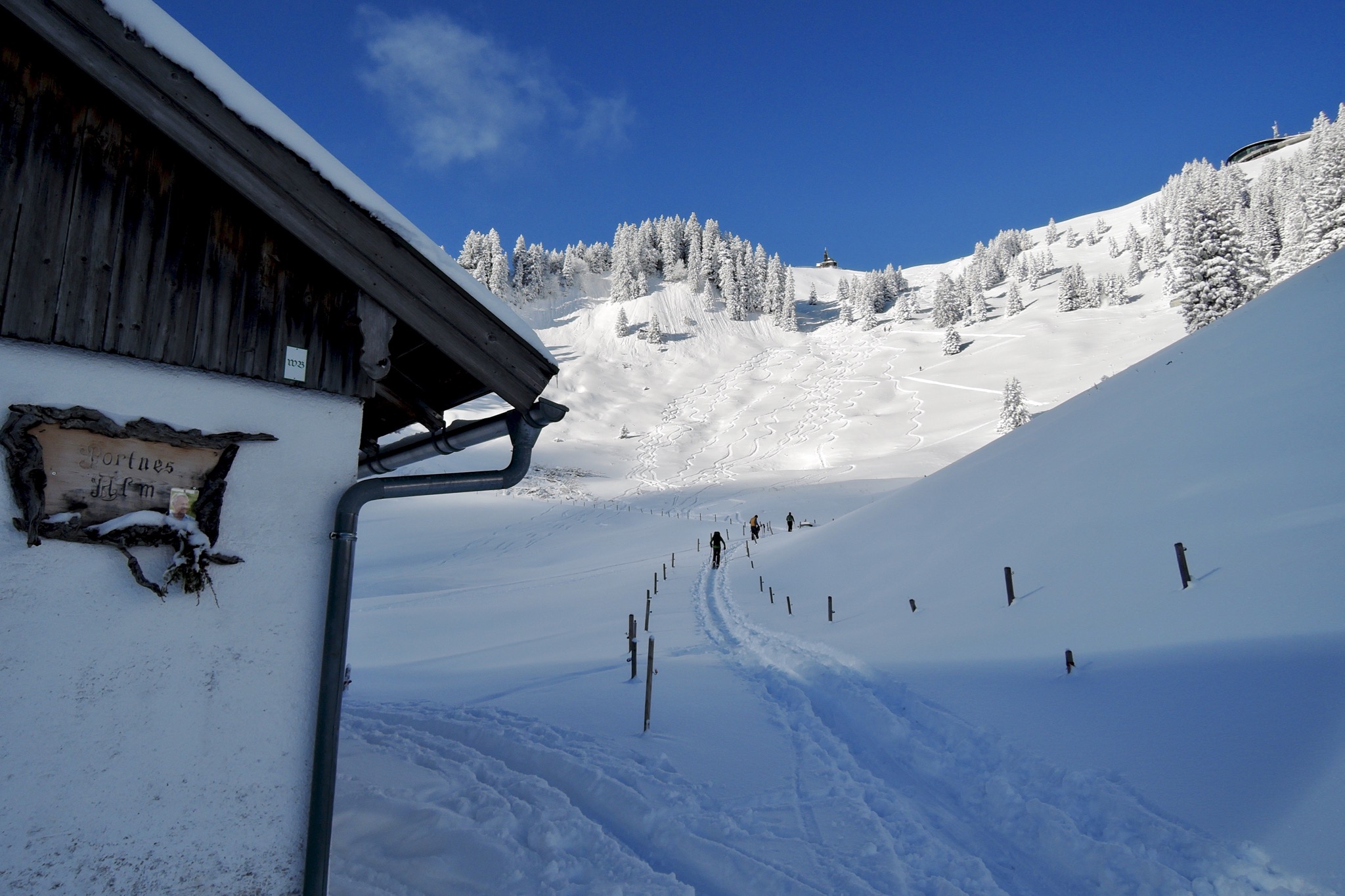 Sonstiges: Am Freitag von der Blankensteinhütte (1214m) Richtung W über den Schiffbach, dem Fahrweg zum Wallberghaus folgend an der Rottachalm (1211m) und der Portnesalm (1410m) vorbei in den weiten Kessel. Zuletzt Richtung NW steil zum Wallbergkircherl (1580m) hinauf. Viele von uns gehen noch auf den Wallberg (1722m) rüber, mich zeiht es aber, da man mit Ski nicht ans Gipfelkreuz geschweige denn runter kommt, ins Berghotel Altes Wallberghaus (1512m).