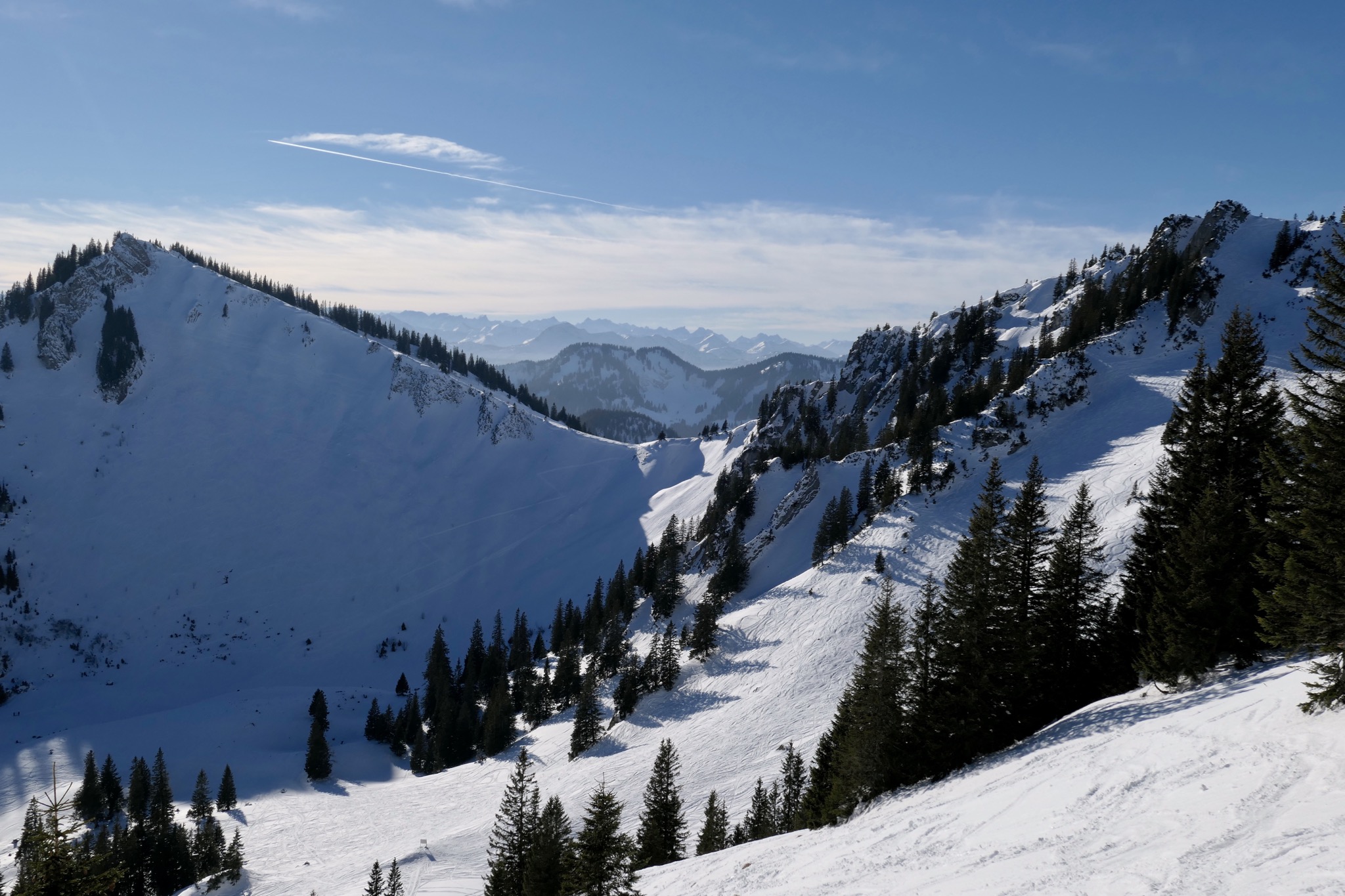 Runter i.W. wie beim Aufstieg, sonnseitig entweder kaum Schnee oder Bruchharsch, erst in der Hochmiesing-Nordrinne gibt es für 80Hm richtig guten Powder – zu wenig für die Hatscherei… Auf der Forststrasse läuft es dann, mit etwas Anschieben in den Flachstücken, bis Geitau zurück.