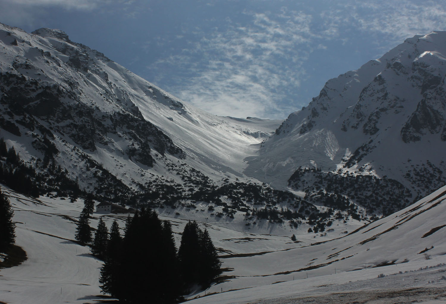 Tourenverhältnisse: Die nordseitigen Touren im Tannheimer Tal haben noch Schnee. Insgesamt Verhältnisse heute besser als erwartet: Keine Tragestrecken, untere Latschenzone gut zu durchqueren gut gesetzte Unterlage und weiter oben endlich viel Schnee.