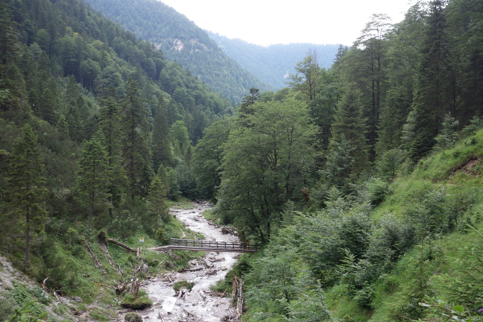 In der Hoffnung auf einen sonnigen Nachmittag später Start mit dem Radel von Fall ins S ins Dürrachtal und nach 1,5 km rechts hinauf ins Krottenbachtal. Nach 7,5 km ist auf 1000m Ende der fahrbaren Strecke. Zu Fuß durch das einsame und wildromantische Tal auf schmalem, sehr schön angelegtem Steig an zahlreichen Wasserfällen vorbei zum Delpsee 1590m. Das hohe Gras ist vom nächtlichen Regen tropfnaß und sorgt für feuchte Hosen und Schuhe, die Bäche haben sehr viel Wasser und sind nur mühsam zu durchqueren. Wegen der immer noch starken Bewölkung am Delpsee entfällt der geplante Anstieg zum Stierjoch, stattdessen geht's zur Knödelsuppe auf die Tölzer Hütte. Leider auch am späteren Nachmittag keine Wetterbesserung , aber zum Glück weiterhin kein Regen. Viele Gemsen unterhalb der Tölzer Hütte.