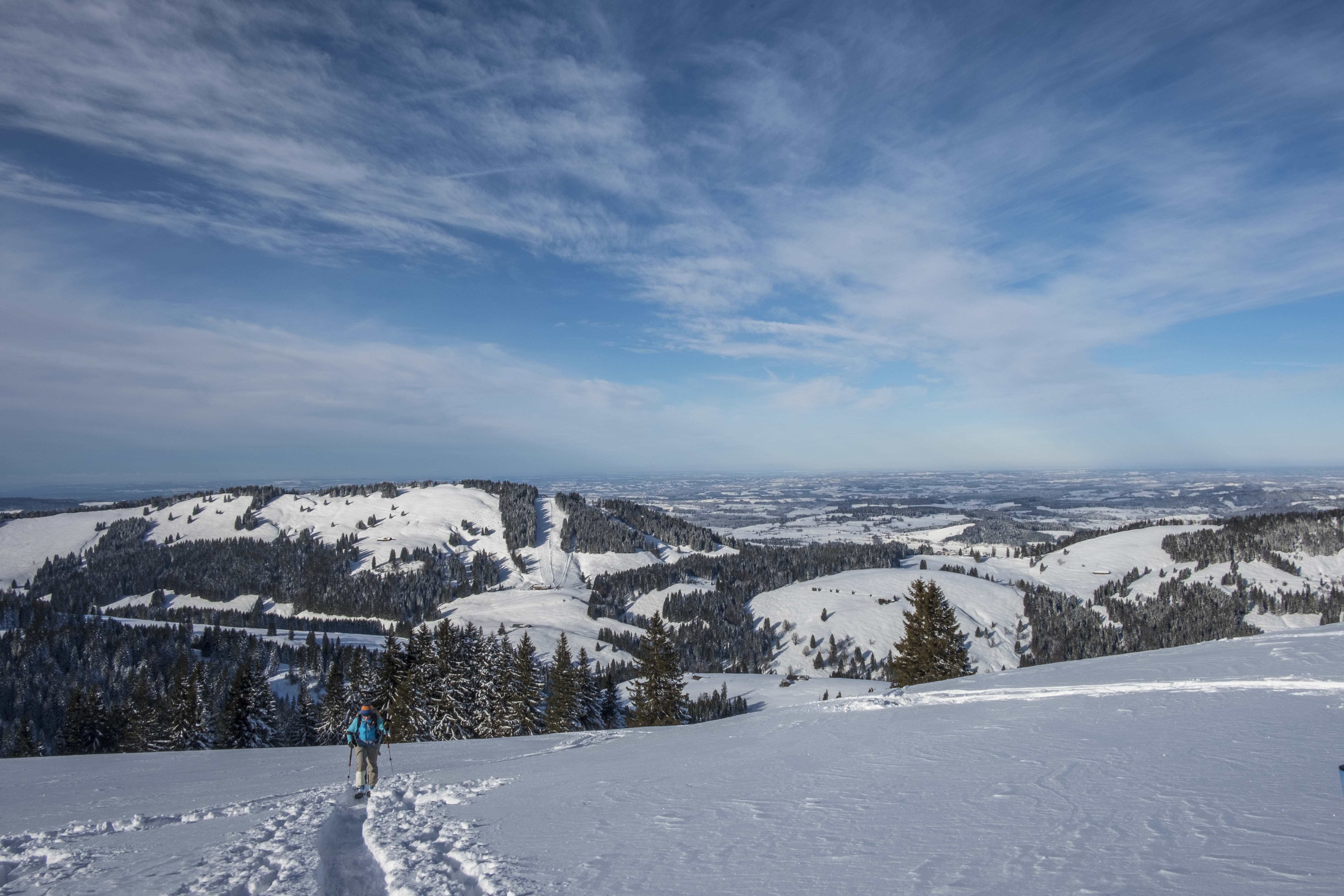 Tourenverhältnisse: Über Nacht gab es viel frischen Pulver in den Allgäuer Alpen. Wir folgten kurz der Rodelbahn in Richtung Hochgrat, gingen dann auf einem Alpweg zur Oberstiegalpe. Weiter auf Spur in langer Hangquerung durch Wiesen und Waldstücke bis es steiler in Richtung Falkenhütte ging. Zum Schluss auf der planierten Piste vom Hauslift zum Gipfel.