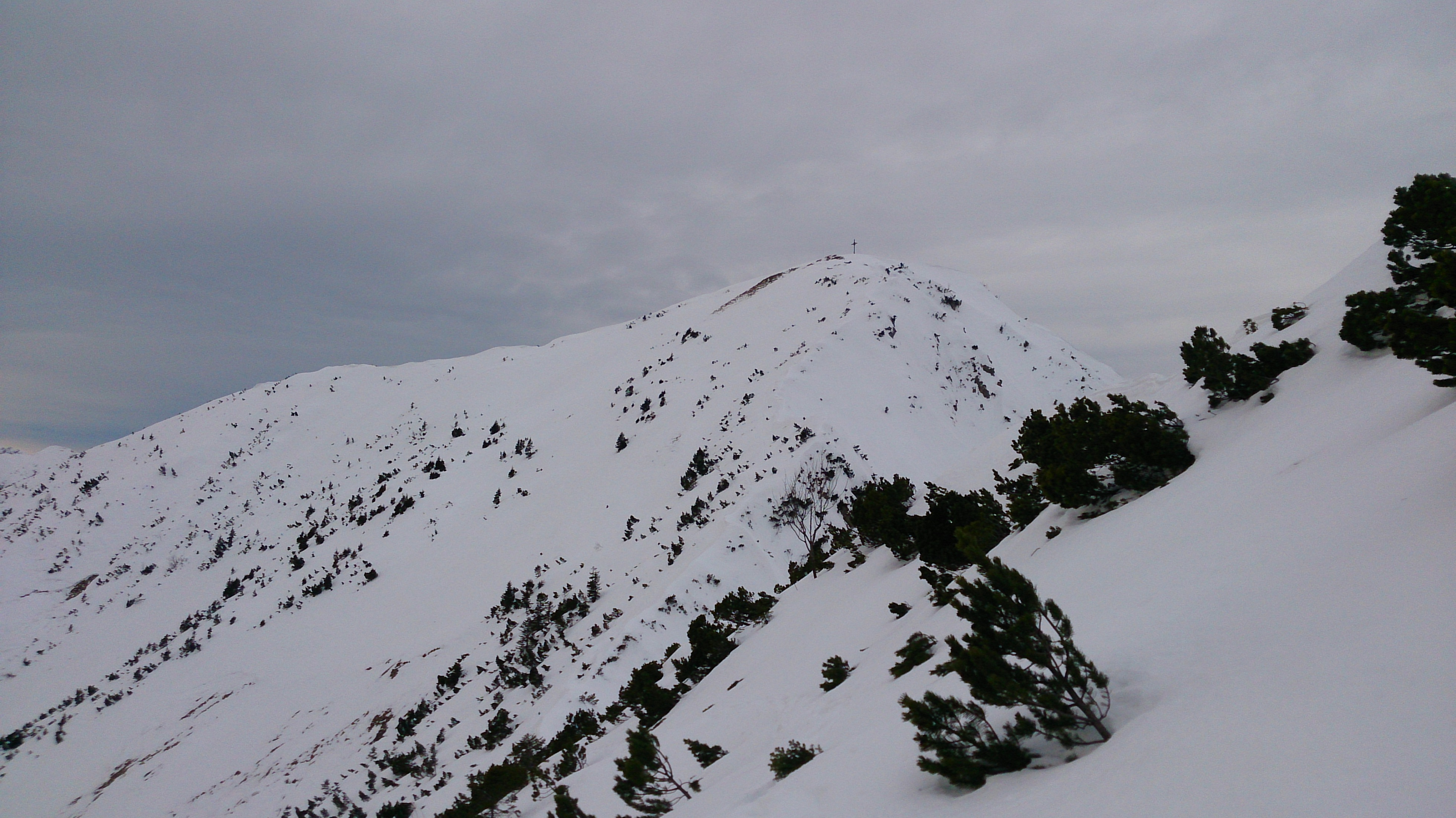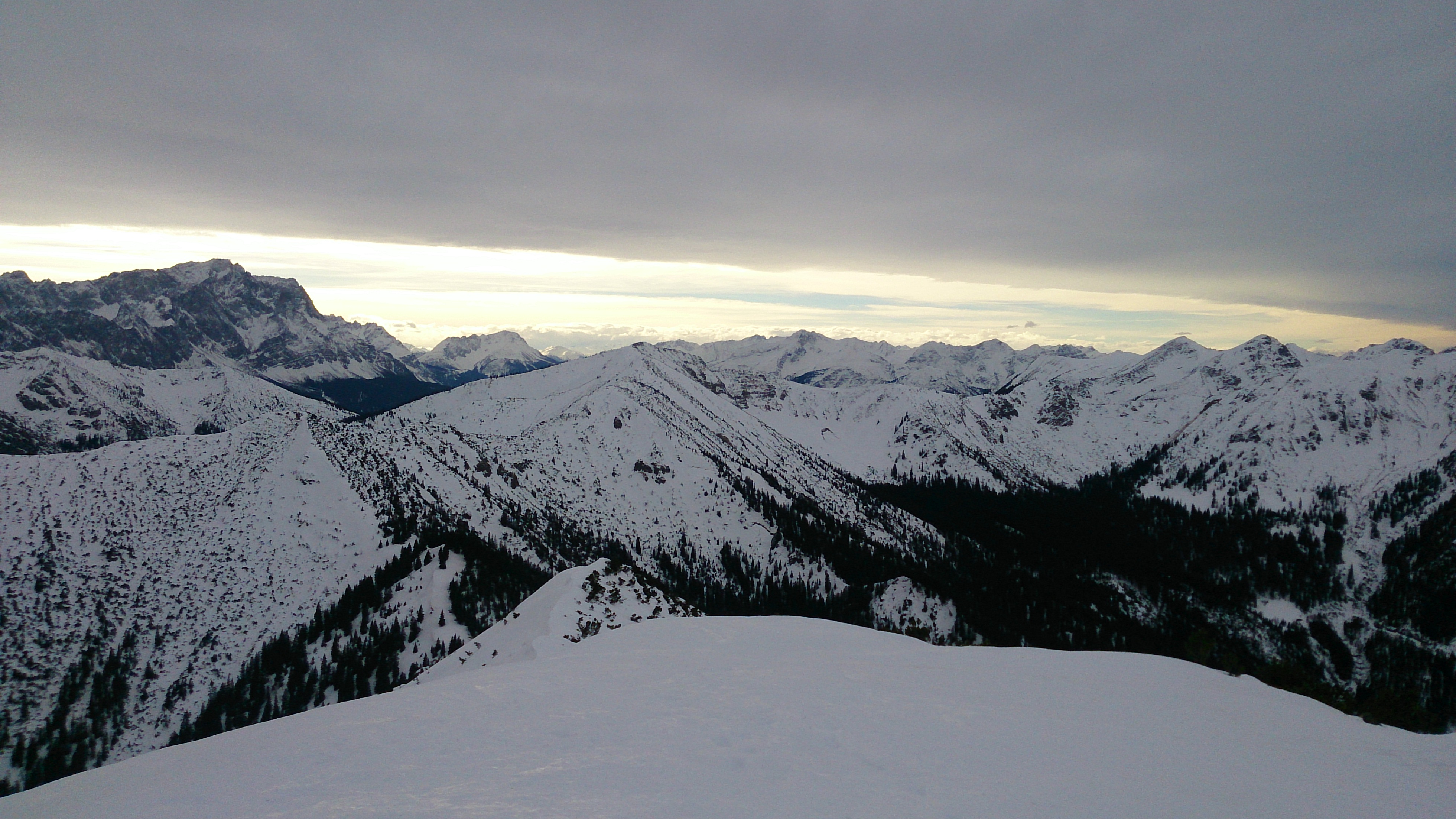 Sonstiges: Die Notkarspitze ist ja nicht gerade als Skitourenberg verschrien, aber meine letzten Besuche (im Sommer) lagen auch schon wieder über 15 Jahre her und so wollte ich es mal ausprobieren. Der Start passt noch, aber schon nach wenigen Minuten hört die Schneedecke auf. Letztlich sind es min. 400 Hm Skier tragen am Weg über den Kamm. Dann erst nasser Schnee, dann zumeist tragender Harsch, ab Ziegspitz zum Teil auch sehr hart (Absturzgefahr!). Am Gipfel sehr windig und daher wenig einladend.