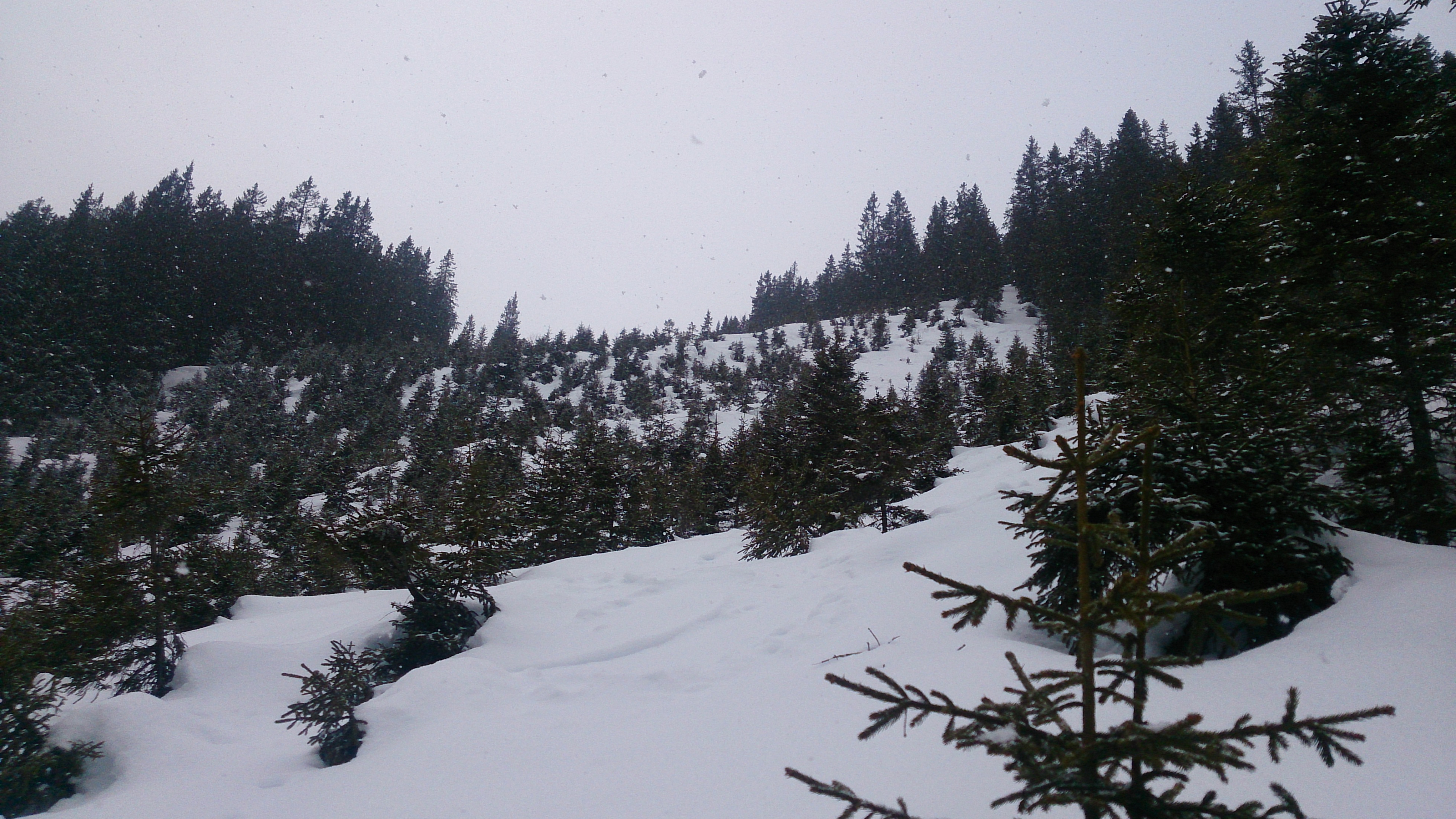 Tourenverhältnisse: genügend Schnee vom Tourbeginn weg; oben allerdings verblasen, mittlerer Teil schöner Pulver, im Waldbereich abrutschender Pulver auf Harsch (unangenehm insbesondere im Aufstieg)