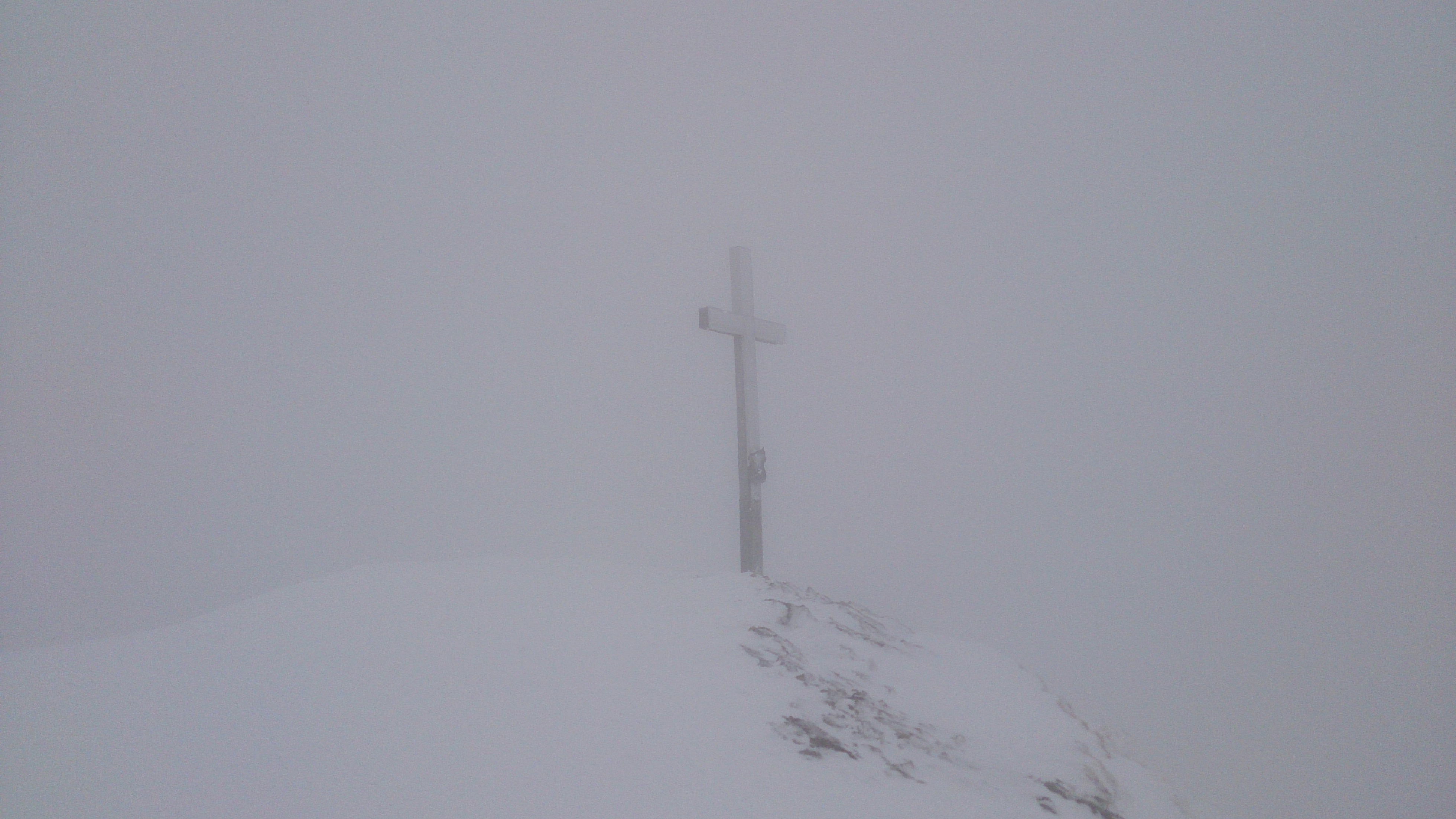Am Gipfelkreuz leider sehr garstige Witterung: