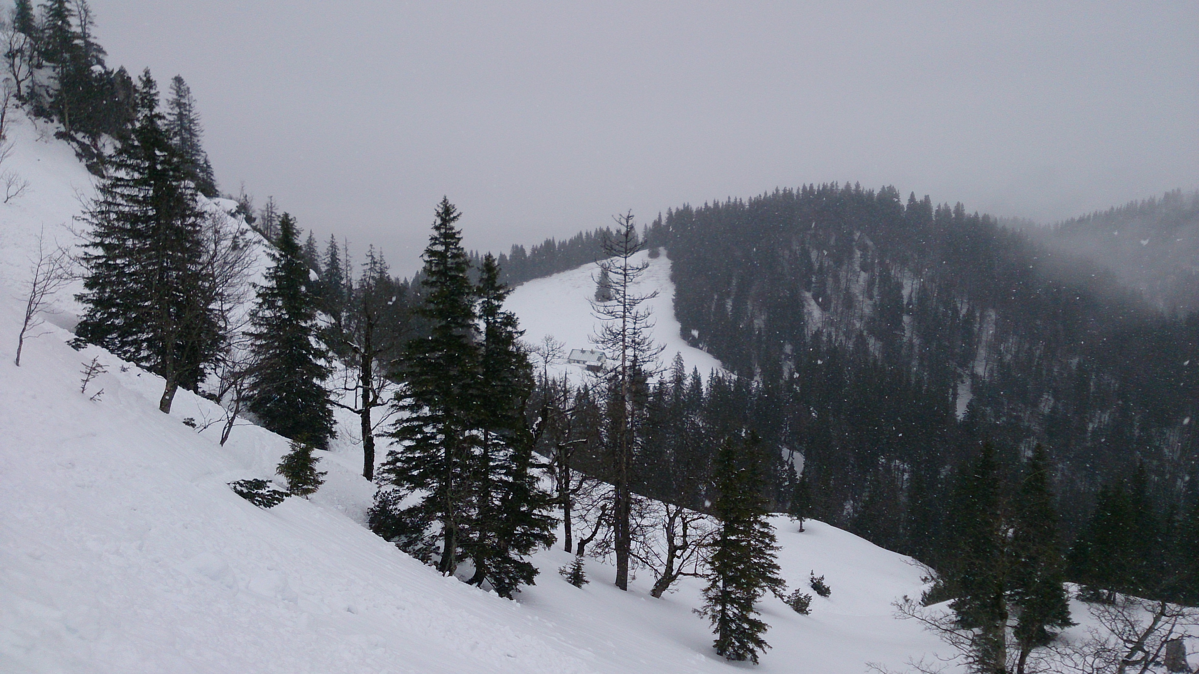 Bei der Abfahrt war leider wieder Nebel aufgezogen und so gab es einen ziemlichen Blindflug im zwar schweren, aber durchaus passablen Schnee. In dem Lawinenstrich vor der Käser-Alm lag schon einiges unten. Ca. ab der Alm ging der Schnee leider in Regen über. Auf der Forststraße nach Ohlstadt wird der Schnee ab ca. 1.000 m schnell knapp, mit den Steinski ging es aber noch bis ca. 840 m herunter, unten allerdings leider mit Steinbremse.
