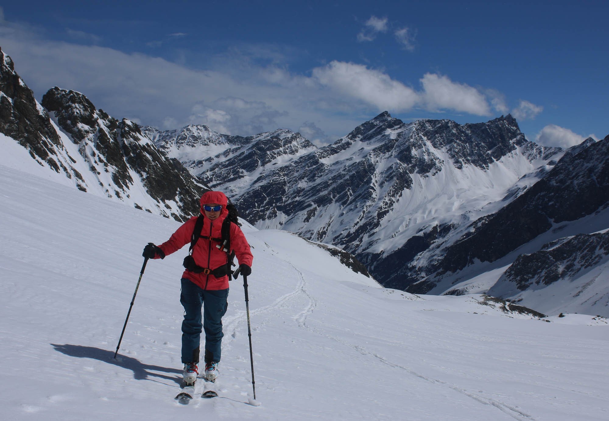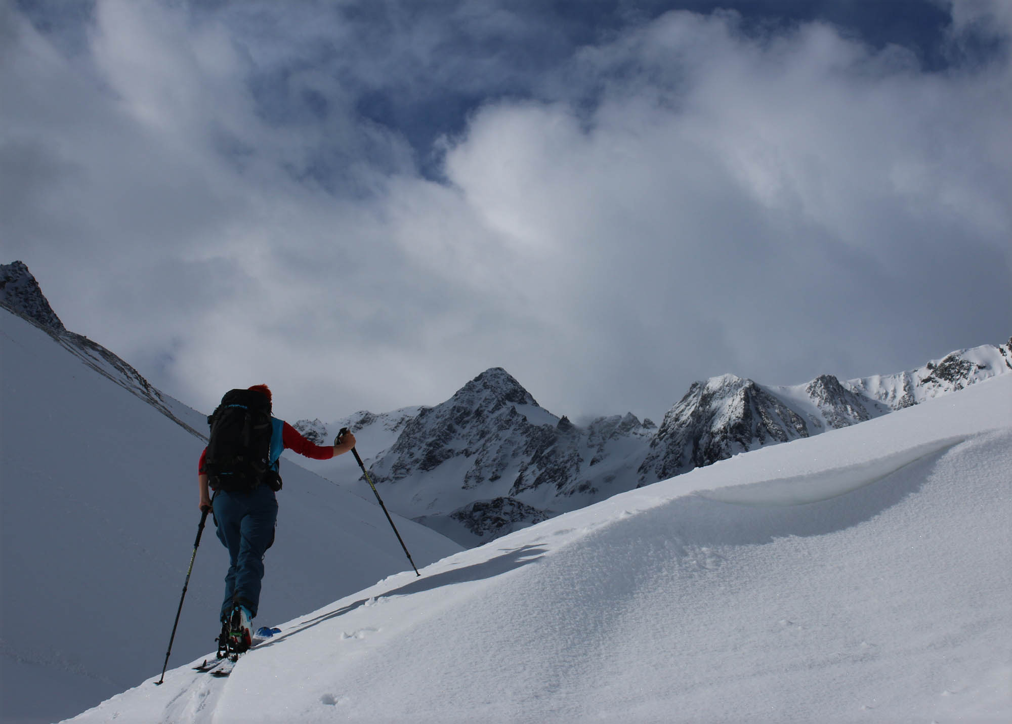 Tourenverhältnisse:Ab Lüsens noch ausreichend Schnee. Altschnee war trotz fehlender Abstrahlung in der Früh gut durchgefroren. Bis Westfalenhaus geringe Neuschneeauflage, ab Winnbeachjoch 10 am Gipfelhang bis zu 20 cm lockerer Pulverschnee. In ungünstigen Expositionen auch etwas Triebschnee. Die Abfahrt von der Hütte war selbst um 15:30 noch gut möglich, MitteltieferSulz auf fester Unterlage.