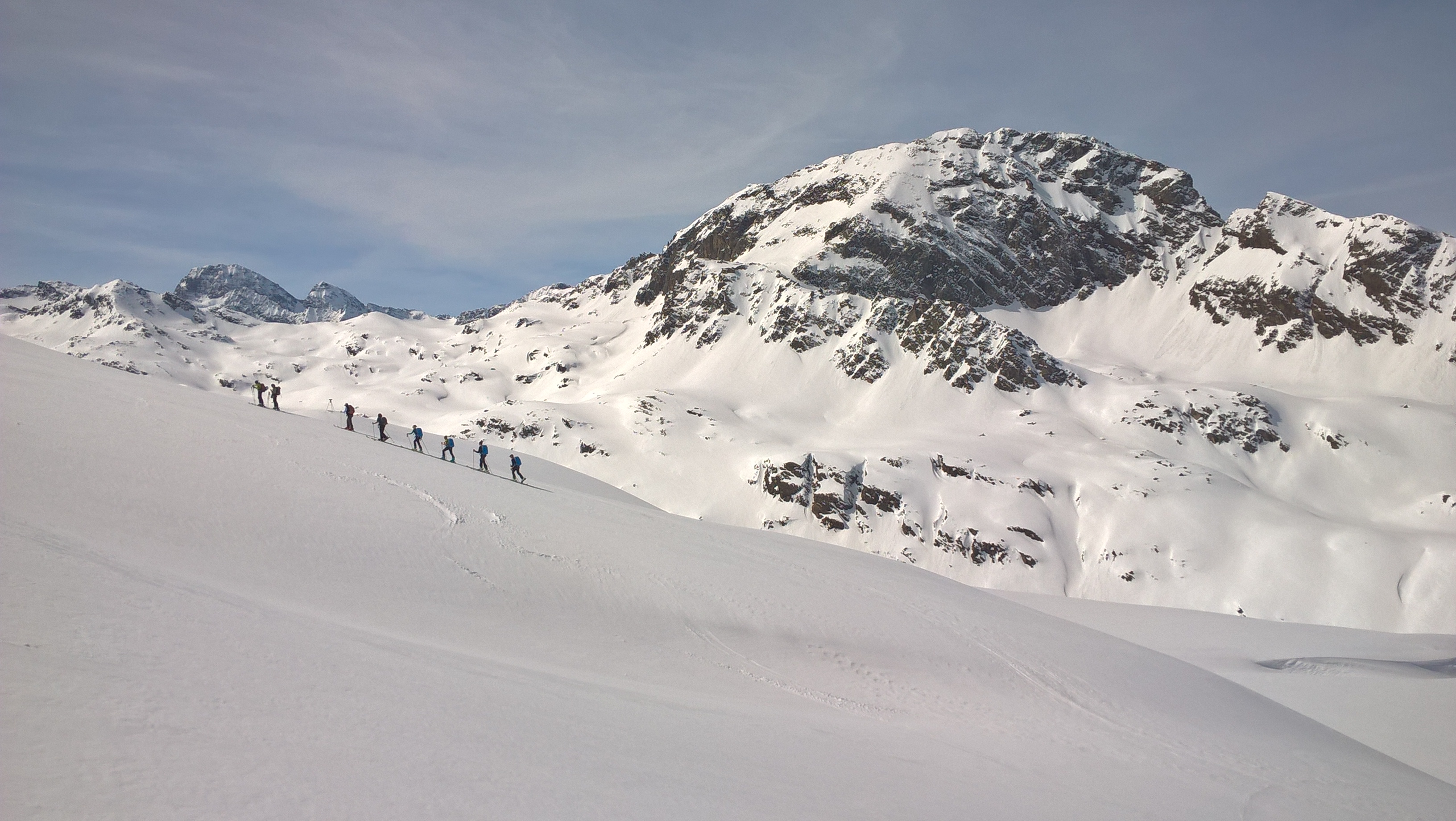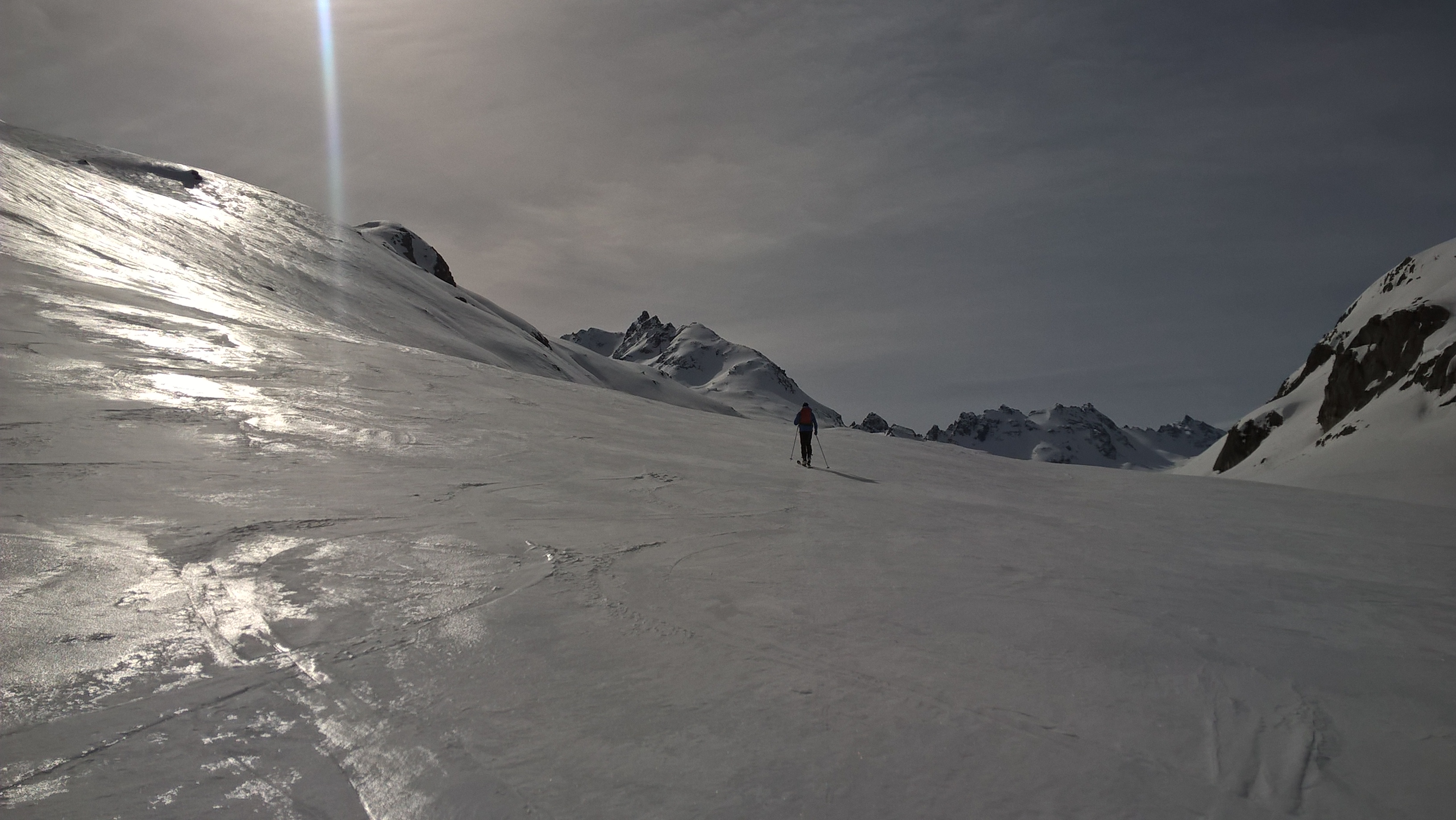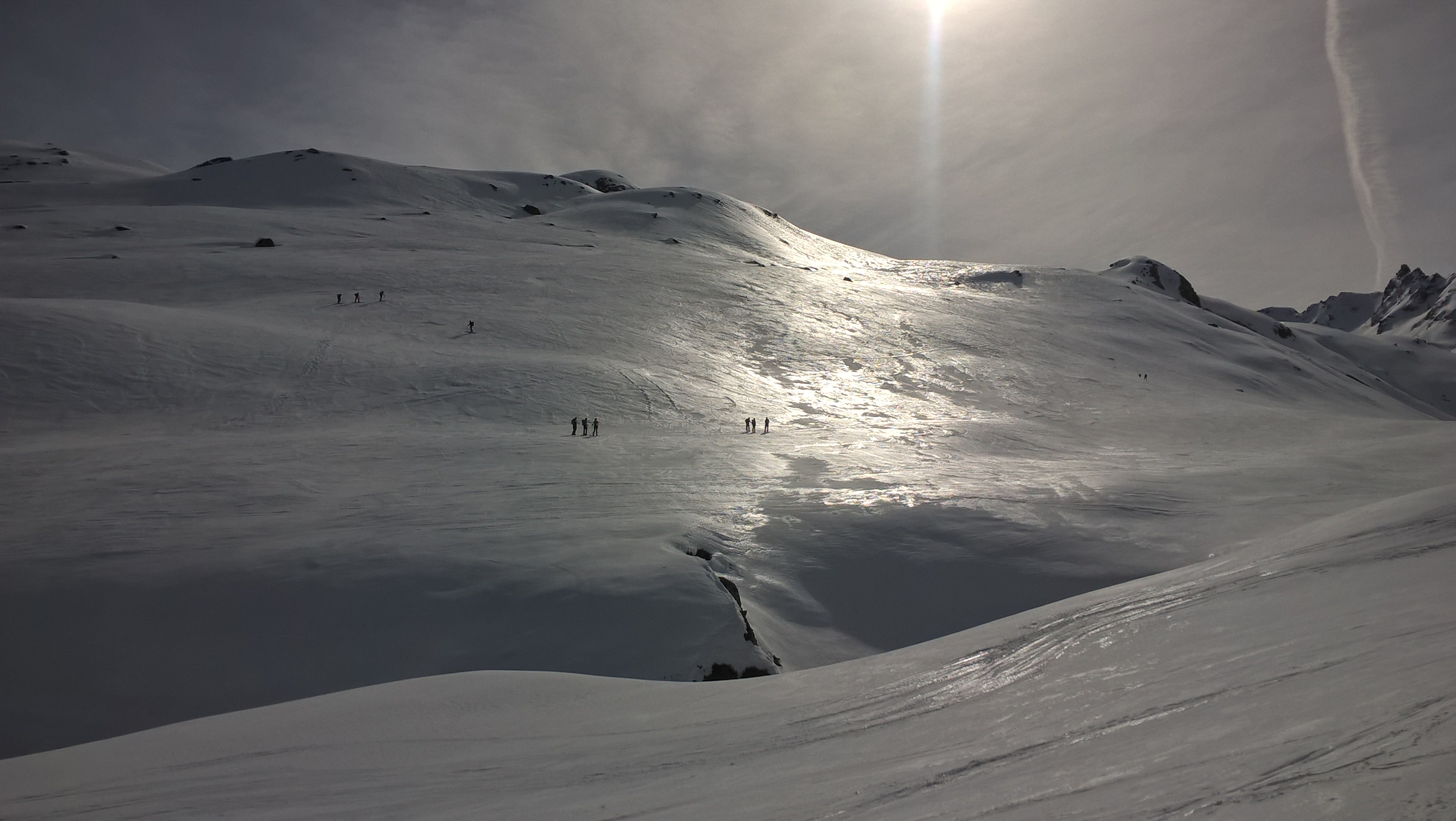 Tourenverhältnisse: Sind gegen Ende der Tourensaison aufgrund der Lawinenlage in den mittleren und niedrigen Lagen auf die Bielerhöhe gefahren (Vermuntbahn ab Partenen und Tunnelbus ab Bergstation). Und es wurde ein wunderbarer Tag dort oben. Über Nacht hat es fest durchgefroren und die Lawinenwarnstufe sank damit auf 1 am Vormittag. Ab dem Gasthof Piz Buin geht es 100hm bergab ehe man anfellt. Es war heute sehr angenehm zum Aufsteigen da die Schneeoberfläche trotz dem Frost griffig war. Harscheisen hilfreich aber nicht unbedingt nötig. Die Aussicht dort oben ist sowieso perfekt und da es windstill war, war die Gipfelrast einfach nur wunderschön. Die Abfahrtsbedingungen waren heute ein Traum. Perfekter Firn! Traumhaft zum fahren. Bis unten kein Sulz. Perfekter Firn bis mindestens 13Uhr.