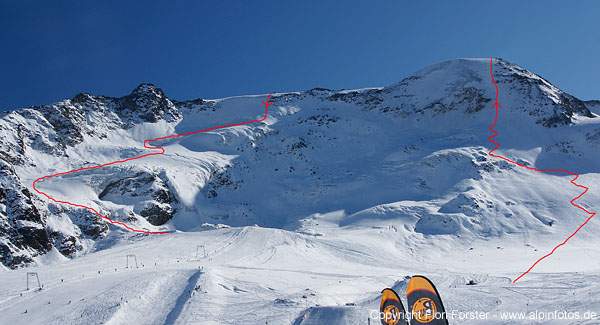 Skipiste bis 2900m, dann über steilen Hang bis auf 3200m. Zu Fuß weiter, bis