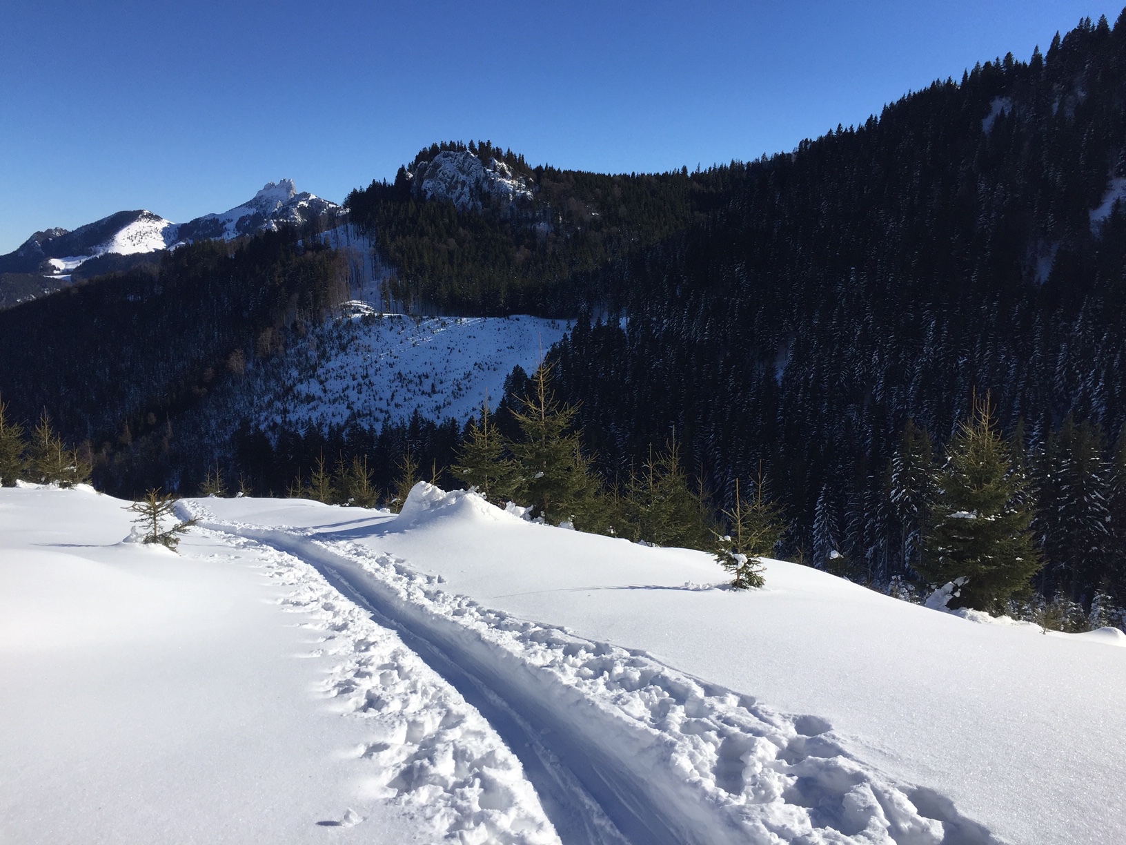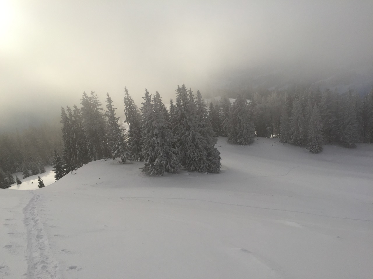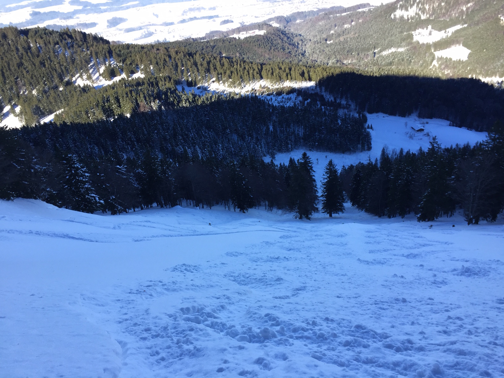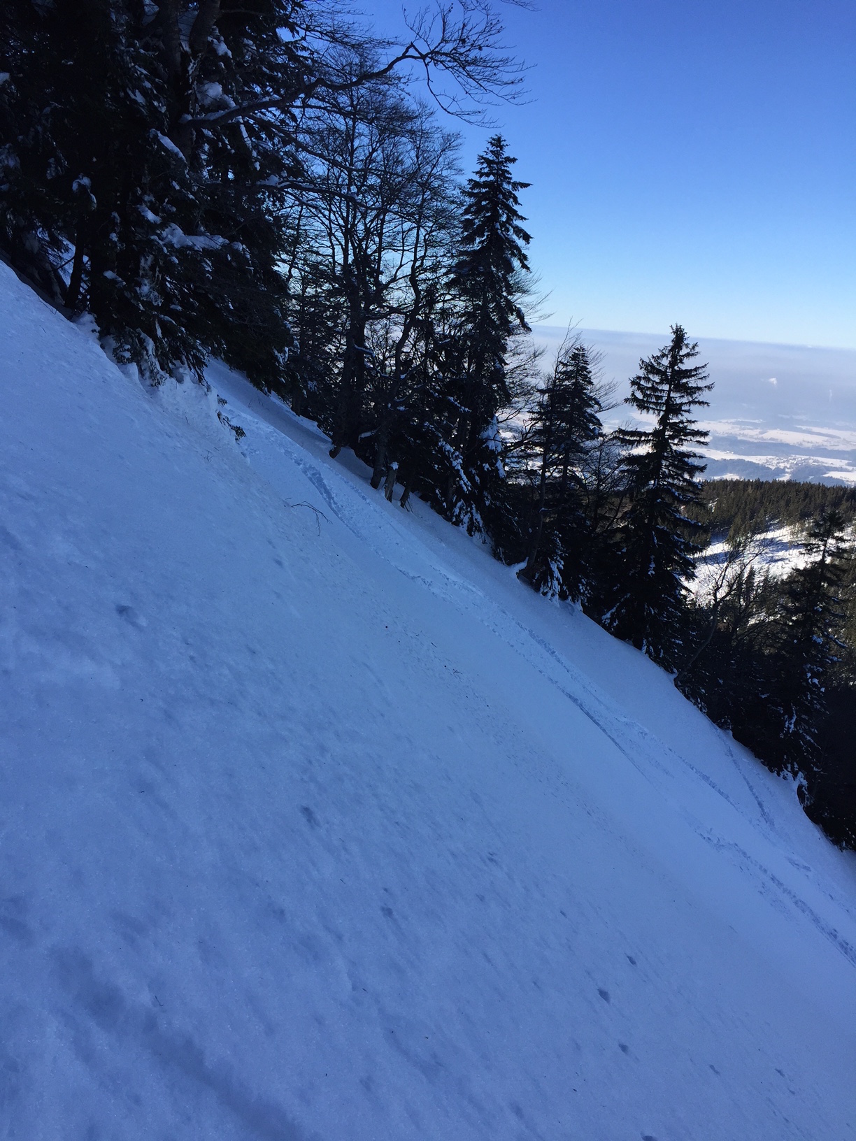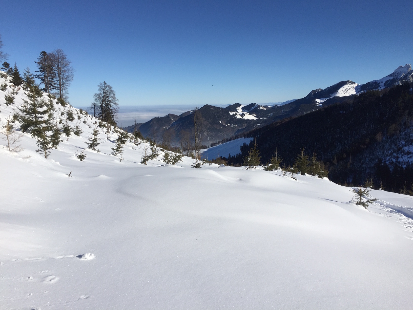 Tourenverhältnisse: Nachdem der Parkplatz an der Lederstube um 10 Uhr schon mehr als voll war habe ich mich statt Laubenstein/Aberg kurzfristig umentschieden und bin nach Soilach gefahren. Von dort dann über die WInterstube Richtung Paradies. Nachdem der Nordhang der Riesen mich schon sehr angelacht hat habe ich entsprechend mein Ziel geändert. War sicher auch eine gute Entscheidung weil fast alle anderen Tourengeher Richtung Laubenstein und Aberg gespurt sind. Die Spur zum östlichen Bereich des Riesenbergs war ganz gut angelegt aber teilweise schon etwas glatt. Der Schnee dort in der Südseite hat schon einen ziemlichen Stich und es war bei weitem nicht mehr so kalt wie im Tal. Die ersten Meter der Abfahrt gehen etwas 50 meter durch ein Waldstück. Generell ist die Nordabfahrt insgesamt schon eher steil und auch anspruchsvoller. Die Bedingungen waren aber echt Top. 40cm Pulver und darunter auch schon gesetzter Schnee. Dadurch auch kein Feindkontakt. Der Hang hatte auch noch Platz für eigene Spuren somit also ein absoluter Traumtag.