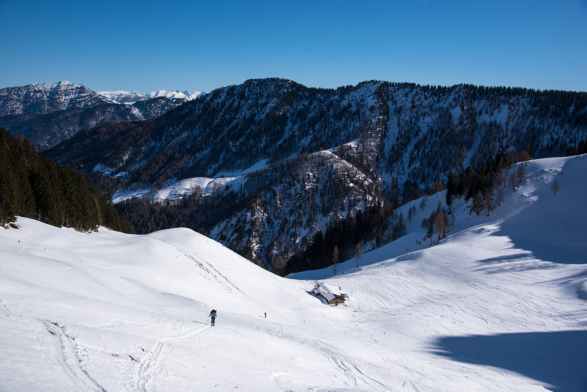 Abfahrt ansonsten oft noch mit schönem Pulverschnee, aber auch schon reichlich Spuren. Fast immer muss man aber auf der Hut sein und mit Feindkontakt, Felsen, Löchern und anderen Hindernissen rechnen. Sehr gut gingen die Hänge oberhalb und unterhalb der Hageralm (mit Zusatzanstieg) und die flachen Abschnitte im unteren Teil und sogar Richtung See. Das letzte Stück zum Forstweg hinunter nur zu Fuss und auch davor arg wenig Schnee und viel Vegetation. In der Sonne oben Sumpf bzw. am Nachmittag angefrorener Acker...