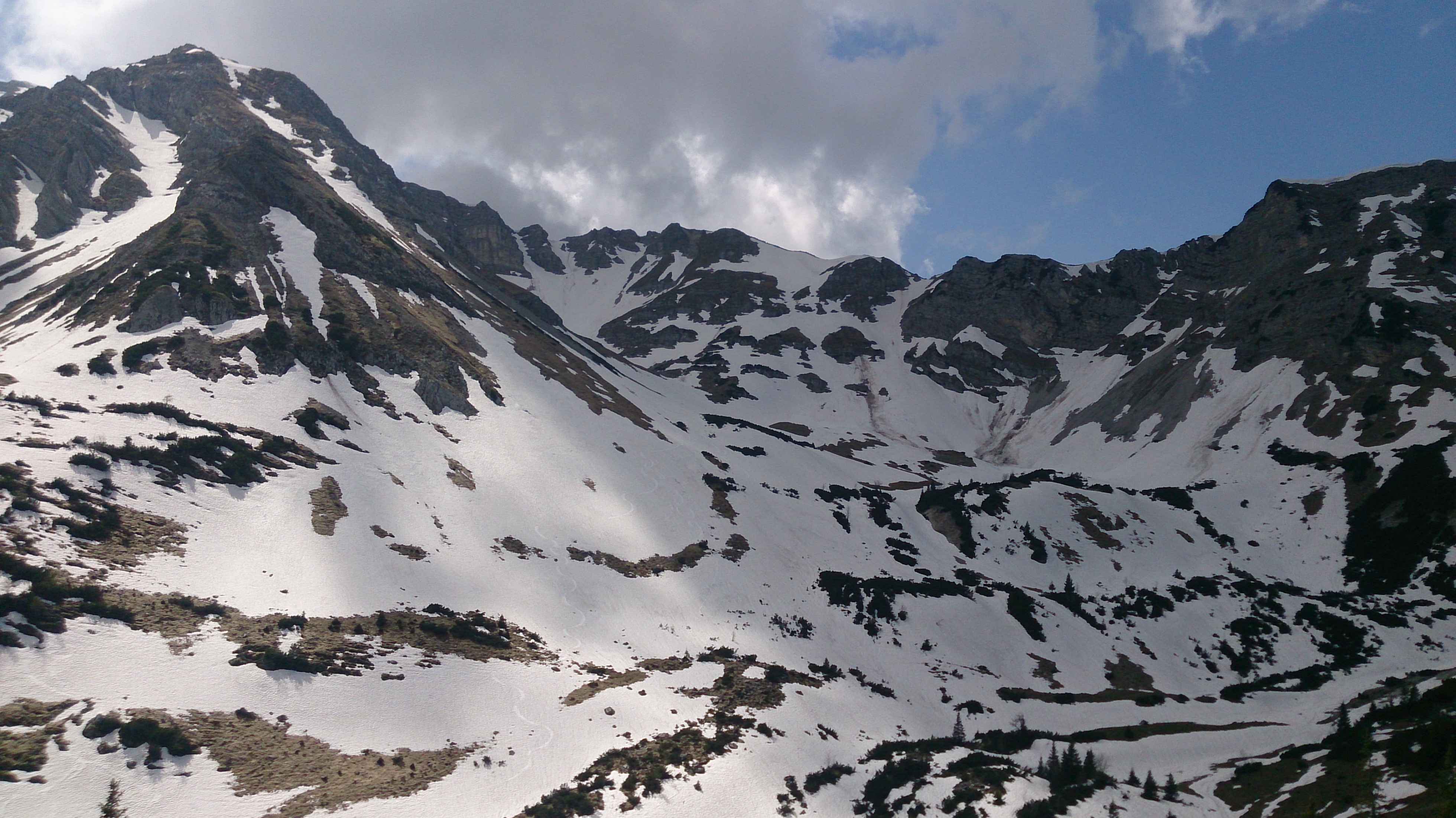 Prognose: im Soiernkessel sollte es auf den nordexponierten Hängen schon noch ein paar Tage gehen; Schöttelkarspitze mit Skiern im Prinzip nicht mehr lohnend