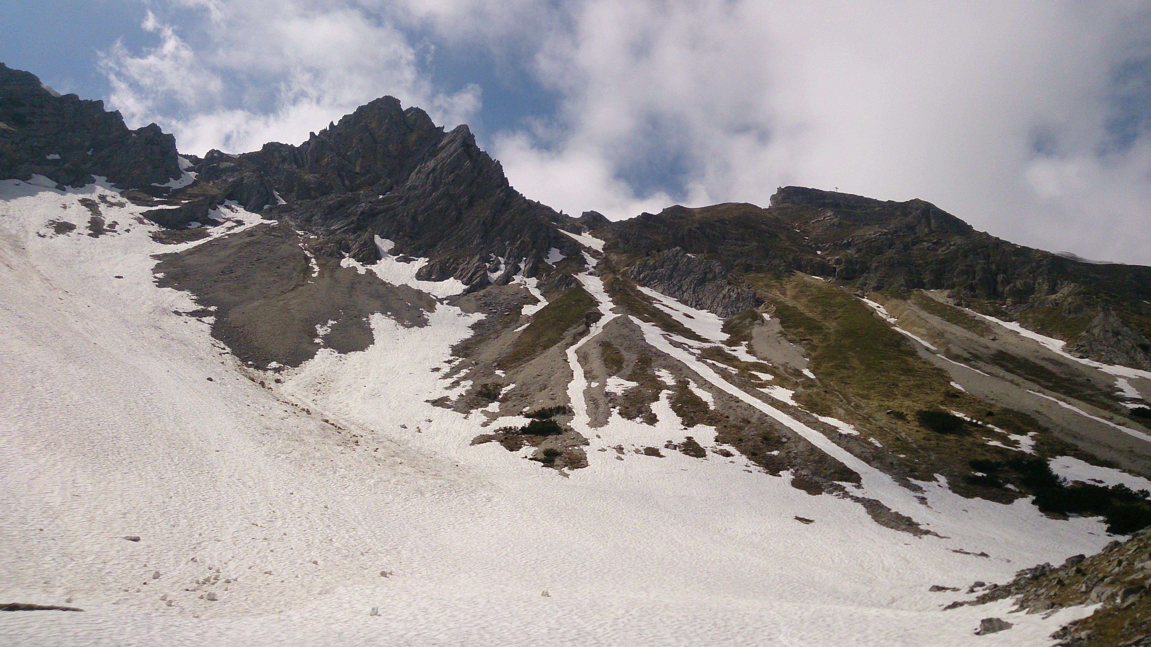 Gefahreneinschätzung: relativ gering, steile Schneefeldquerungen an der Schöttelkarspitze
