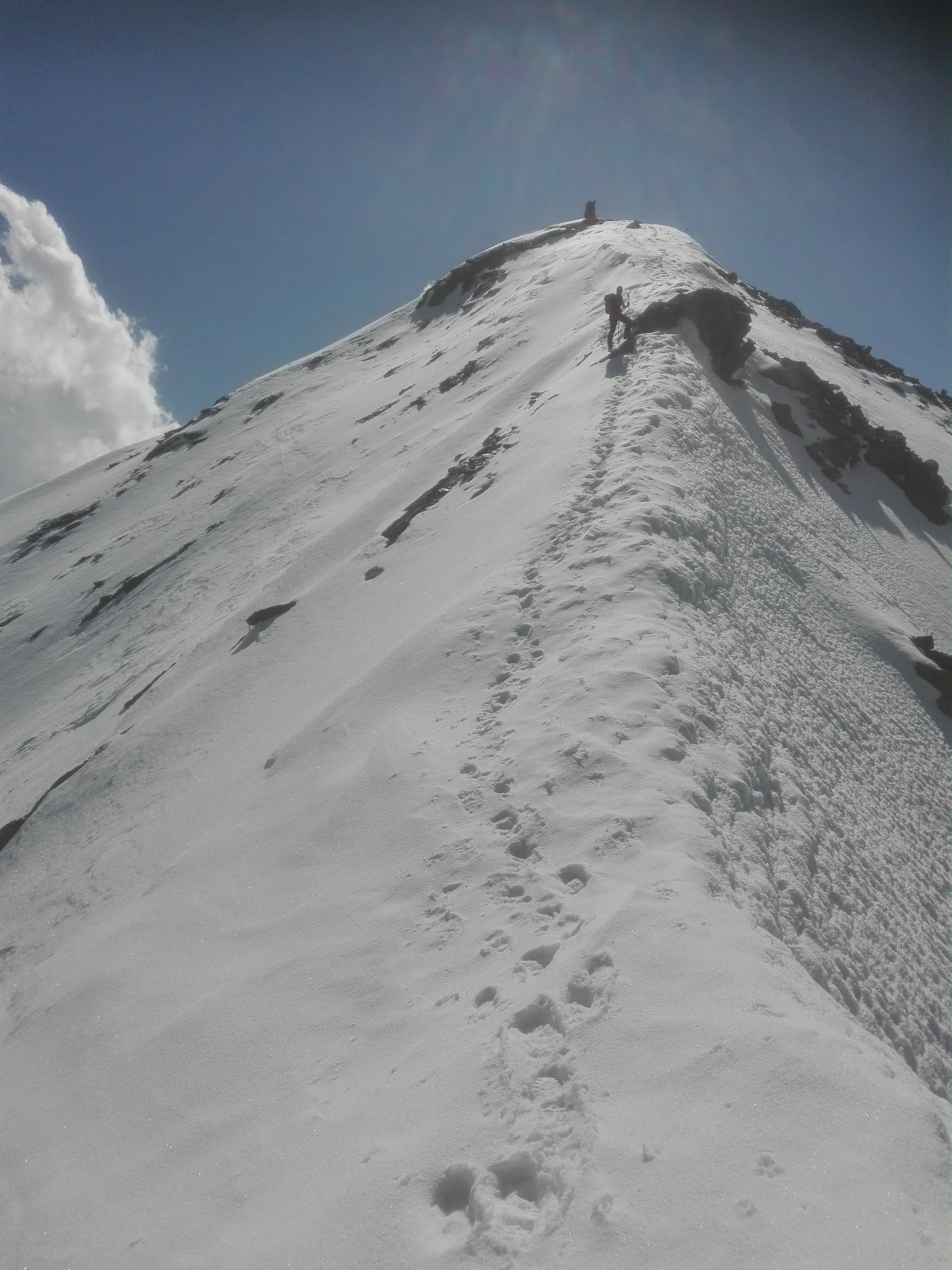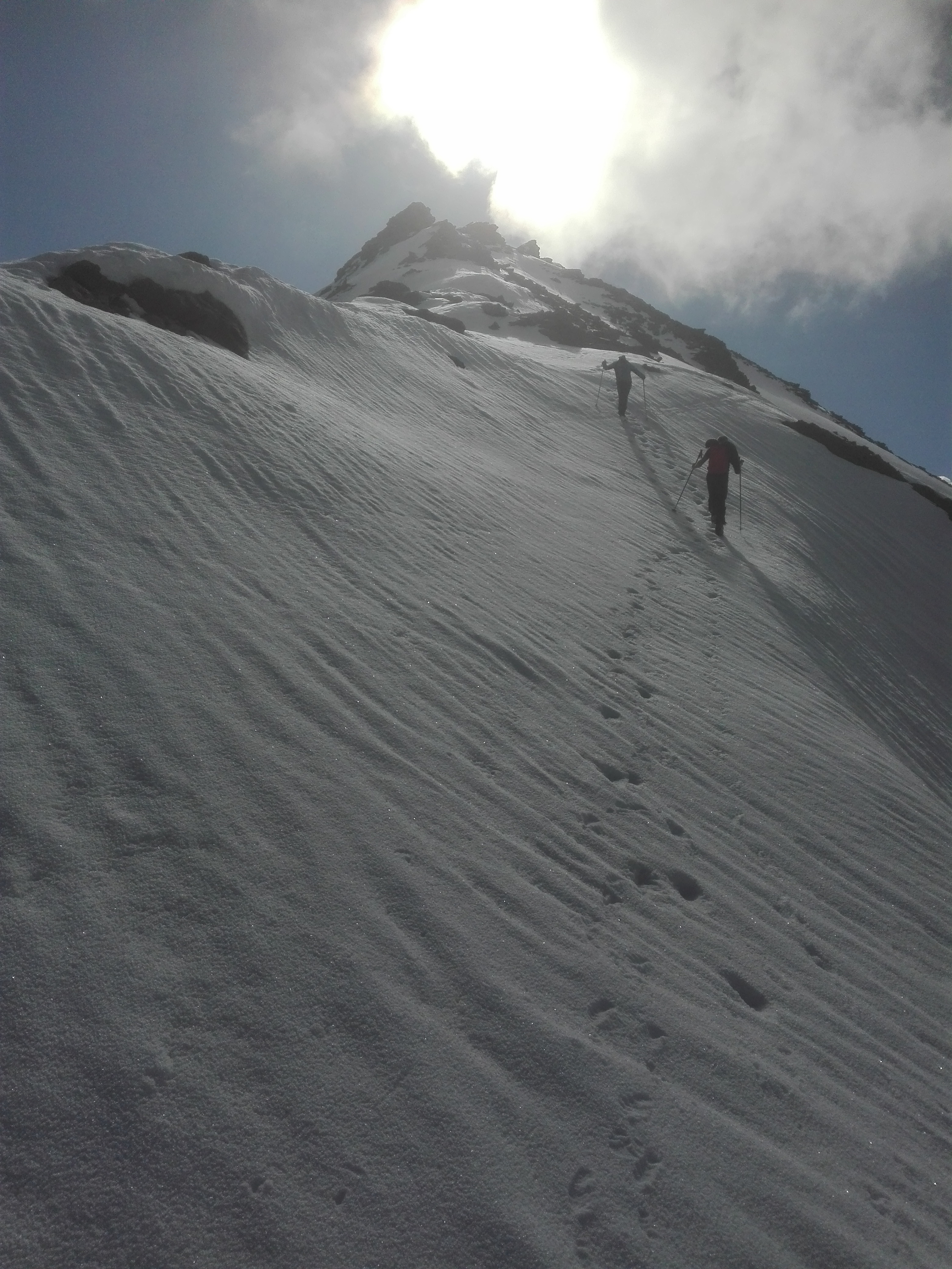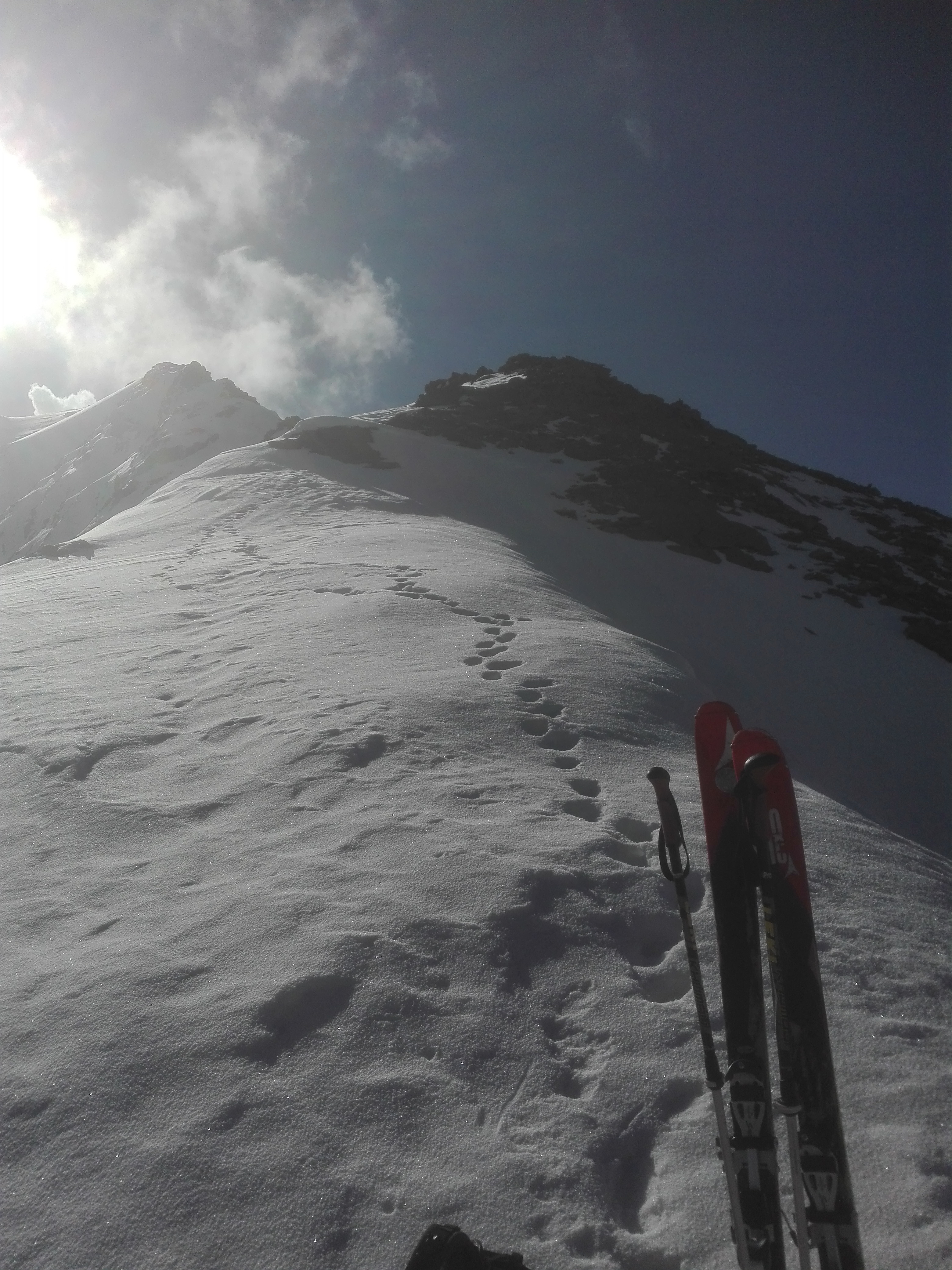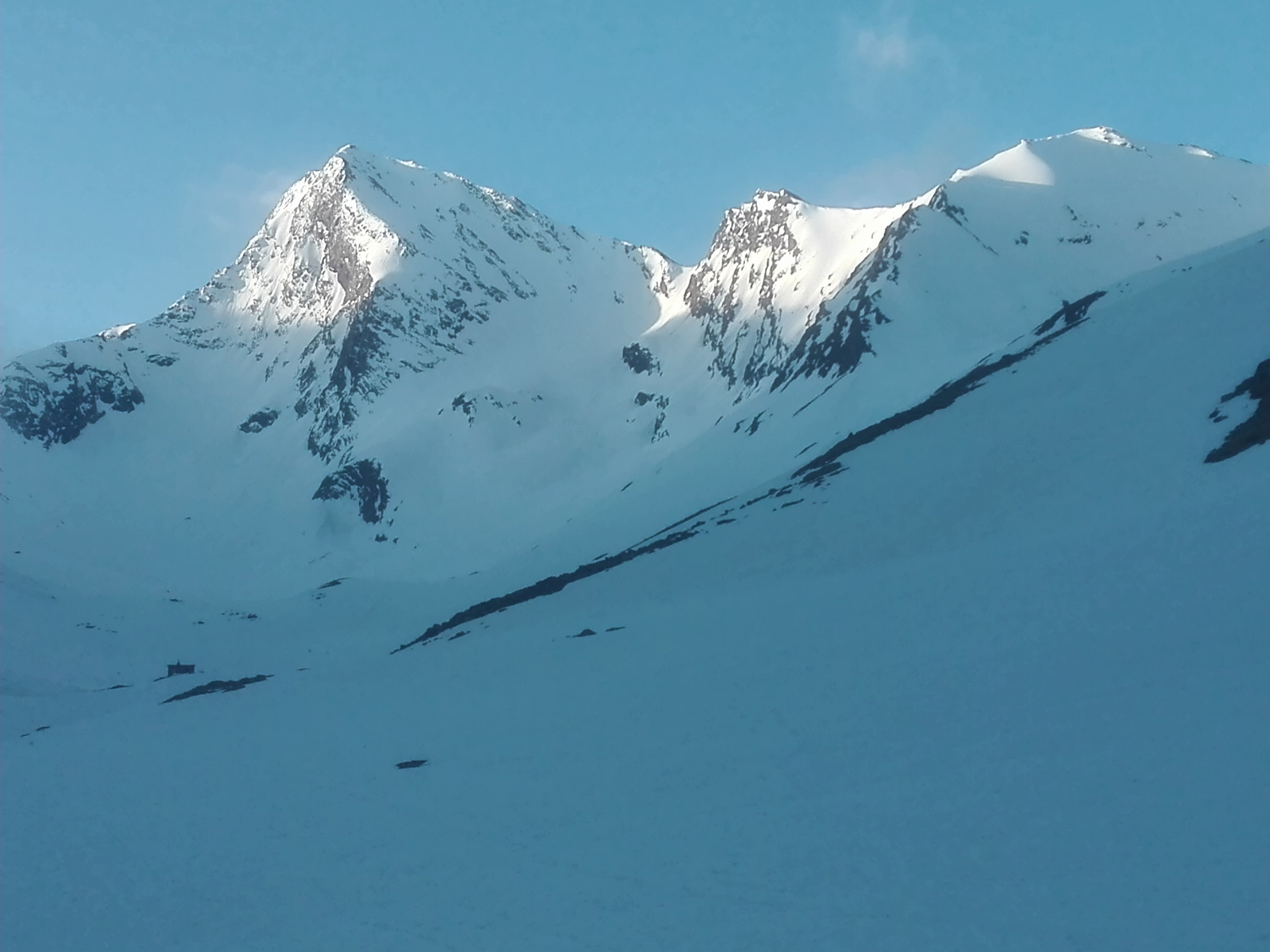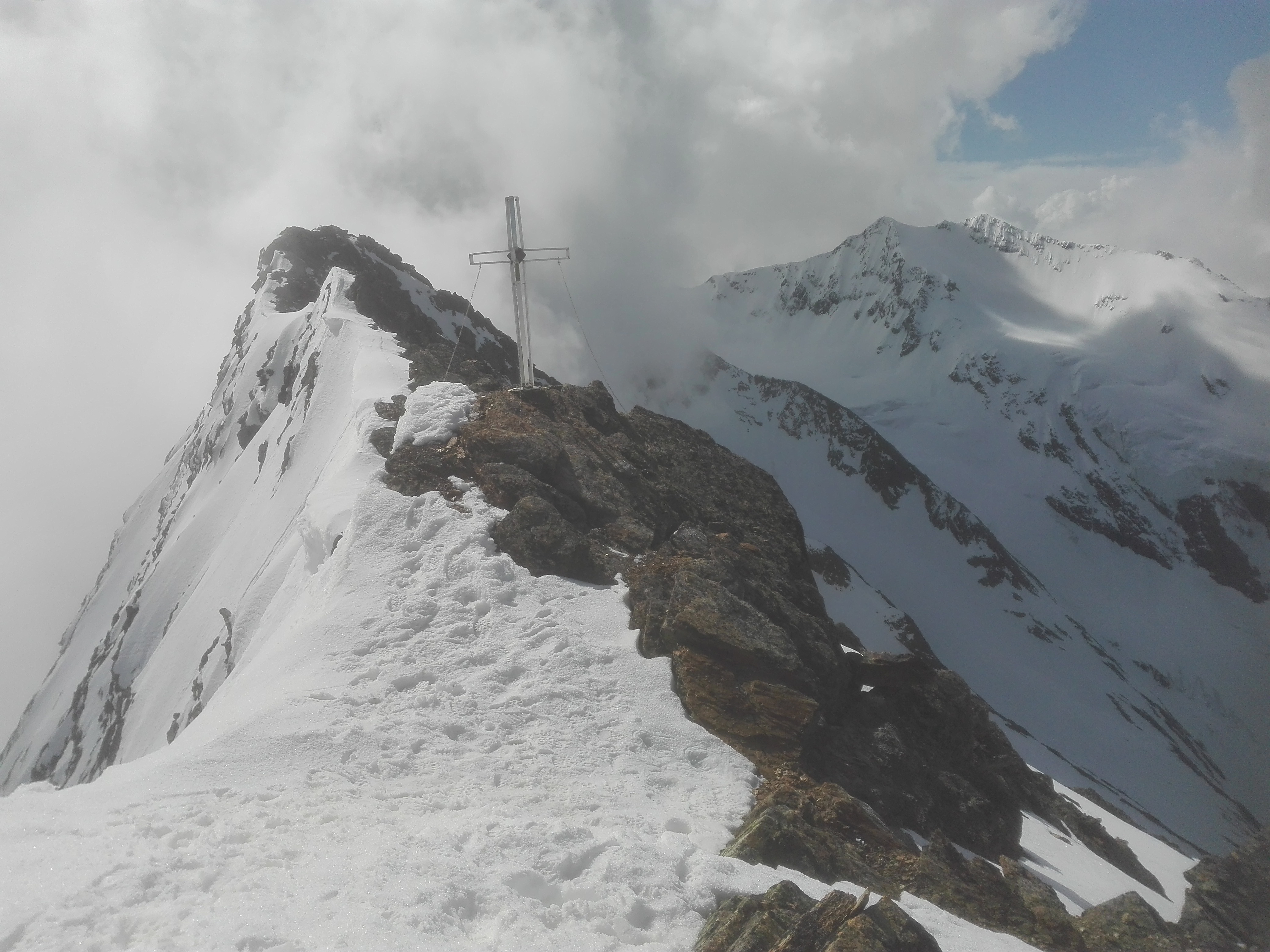 Tourenverhältnisse: Vom P nur 2-3 Minuten Ski tragen, dann über die Piste mit ein Mal 20m Ski tragen zum Beginn des Ferwalltal. Durch dieses an einer Zollhütte vorbei und danach genau nach Süden über immer steiler werdende Hänge in die Scharte P. 3076m, zum Schluss wohl ca. 40 Grad. Im Steilhang ziemlich hart und auch ruppig durch zusammengefrorene Nassschneerutsche aus den Felsen oberhalb. Ein etwa kopfgroßer Stein löste sich aus den Felsen oberhalb und flog wenige Meter an uns vorbei. Die letzten ca. 30 Hm zur Scharte zu Fuß. Es ging zwar ohne Steigeisen, diese oder ein Pickel wären aber auch kein Luxus gewesen. Gleiches gilt für den Gipfelanstieg, der zu Fuß auch über längere Strecken über morgens noch harten Schnee in der Flanke knapp unterhalb des Grates führt. Abstieg wieder über den Gipfelgrat und Abfahrt von der Scharte ins Ferwalltal. Der oberste, steilste Hang (etwa 100-150 Hm) war um 10.30 noch harschig, danach schöner Firn bis auf etwa 2550m. Ab dieser Höhe lief es in weichem Schnee ohne Schieben das Tal raus, kein Sumpf. Zum Schluss über die aufgefirnte Piste zum Parkplatz.