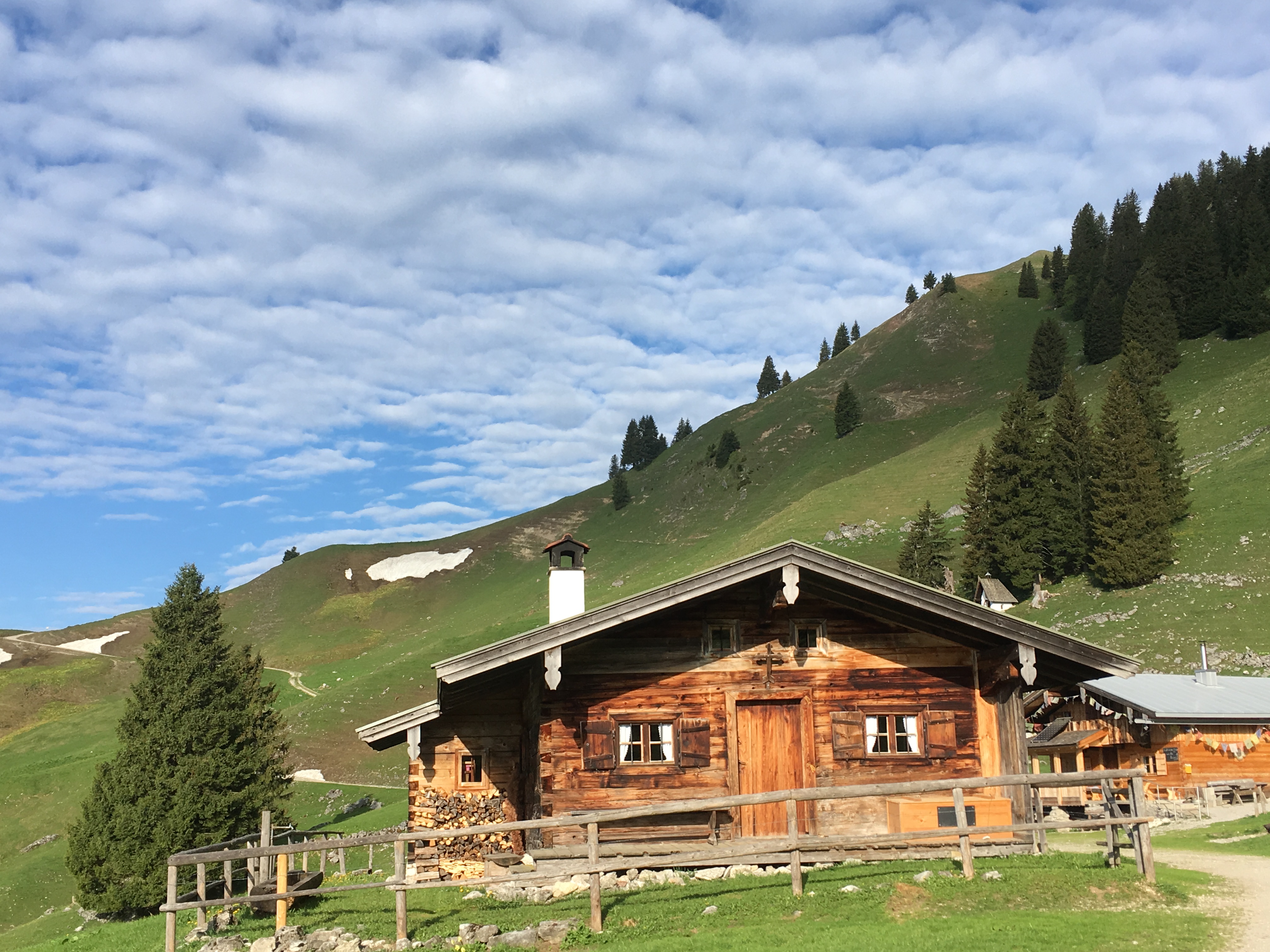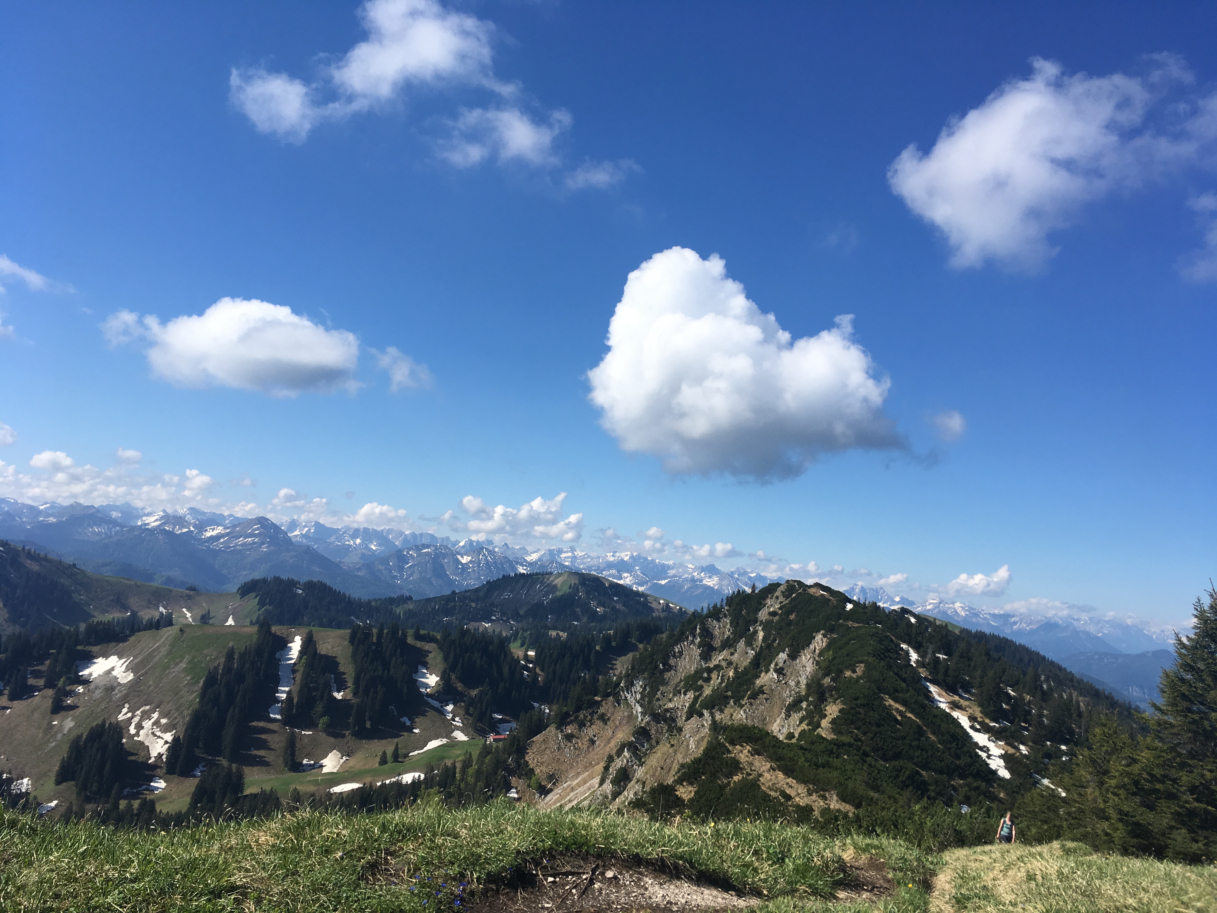 Sonstiges: Der frühe Vogel fängt den Wurm! Der Start um 6:00 Uhr bescherte mir heute eine sehr einsame Tour. Mit dem Radl ging es vom Parkplatz Sonnbichl zunächst auf der Teerstraße am Zeiselbach entlang, bis dann nach ca. 10 Min. rechts der Forstweg in Richtung Aueralm abzweigt. Der Kreislauf kommt gleich ordentlich in Schwung - die ersten beiden Rampen sind nicht ohne. Danach geht's angenehm steil die ca. 500 hm bis zur Aueralm. Die habe ich links liegen gelassen und bin bis zur Neuhüttenalm weitergeradelt. Dort hab ich mein Radl abgestellt. Rundherum traumhaft blühende Almwiesen. Eine wahre Augenweide. Ich bin dann zu Fuß über den Hirschbachsattel zum Ochsenkamp aufgestiegen. Durch die Latschen ist der Aufstieg sehr schattig. Oben am einsamen Gipfel konnte ich eine Traumsicht genießen und mir mein Gipfelbier schmecken lassen. Überall ringsrum sieht man noch kleine Schneefleckerl, was die Landschaft ganz besonders reizvoll macht. Spontan entschied ich, noch zum Spitzkamp hinüber zu wandern. Auch hier sind noch einige Schneepassagen zu durchqueren. Ansonsten ist diese Querung ganz besonders schön zu gehen. Am Spitzkamp-Gipfel war es nicht mehr ganz so einsam, das geniale Wetter hat doch sehr viele Wanderer in die Berge gelockt. Der Abstieg und Rückweg über den Hirschbachsattel zu meinem Radl war ratzfatz vorbei. Auf der Aueralm gabs noch a Stückerl Kuchen zur Belohnung und dann bin ich - vorbei an den Massen, die alle noch zur Aueralm hinauf wanderten - zurück nach Wiessee gedüst. Schee wars!