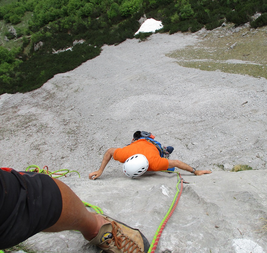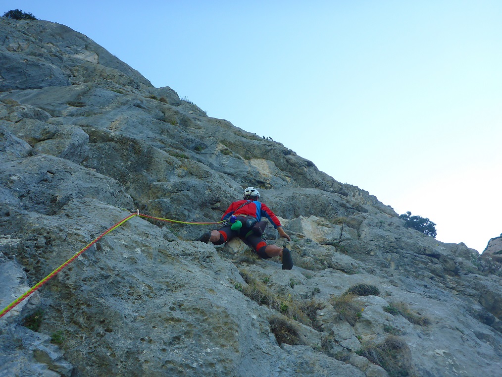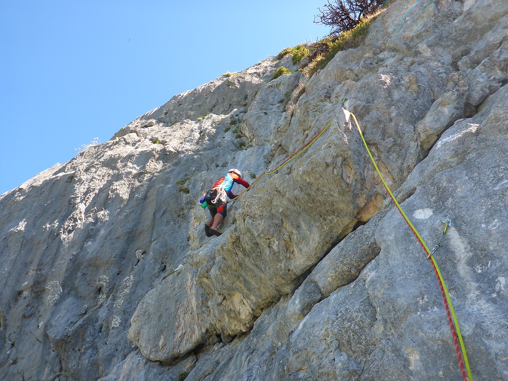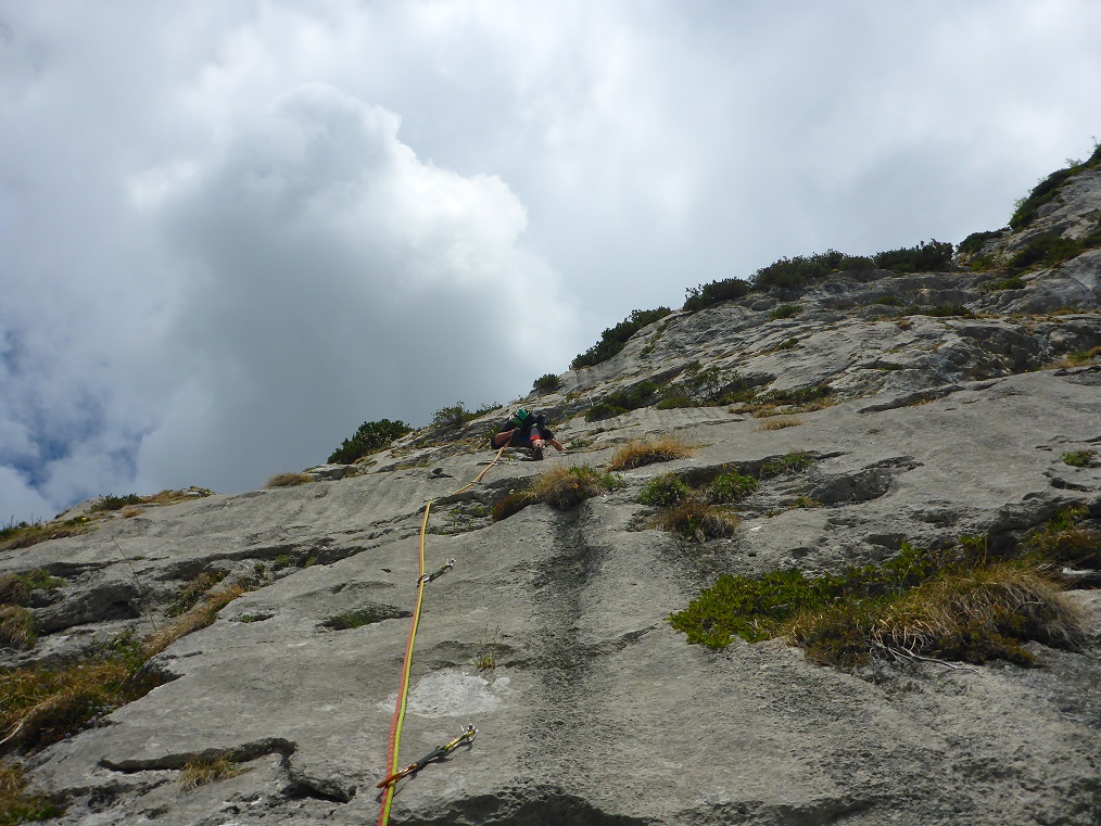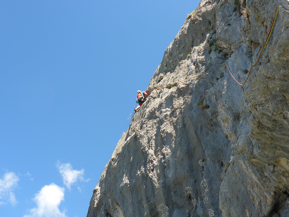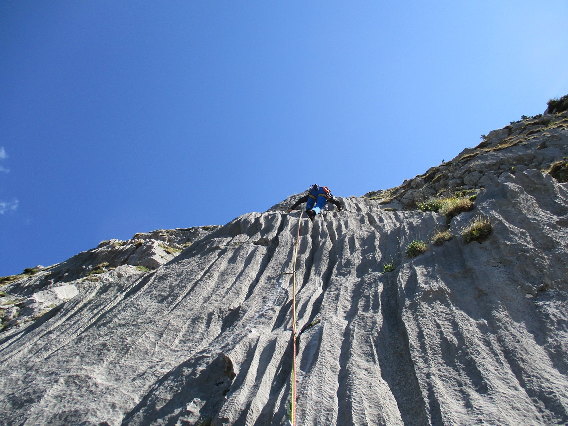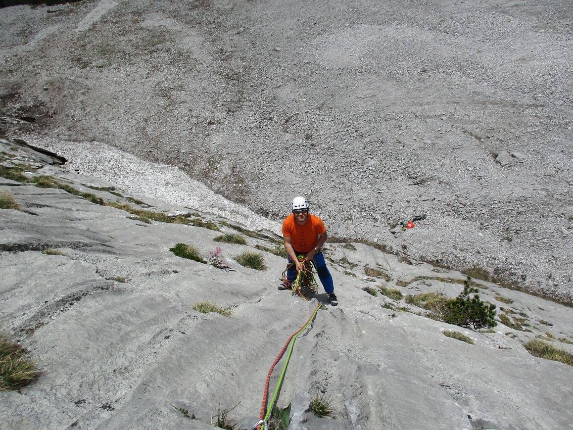 Tourenverhältnisse: Sehr gut / alles strohtrocken / nur noch kleine, nicht störende Schneefelder am Wandfuß / Bohrhakentour / Abstieg über Abseilpiste