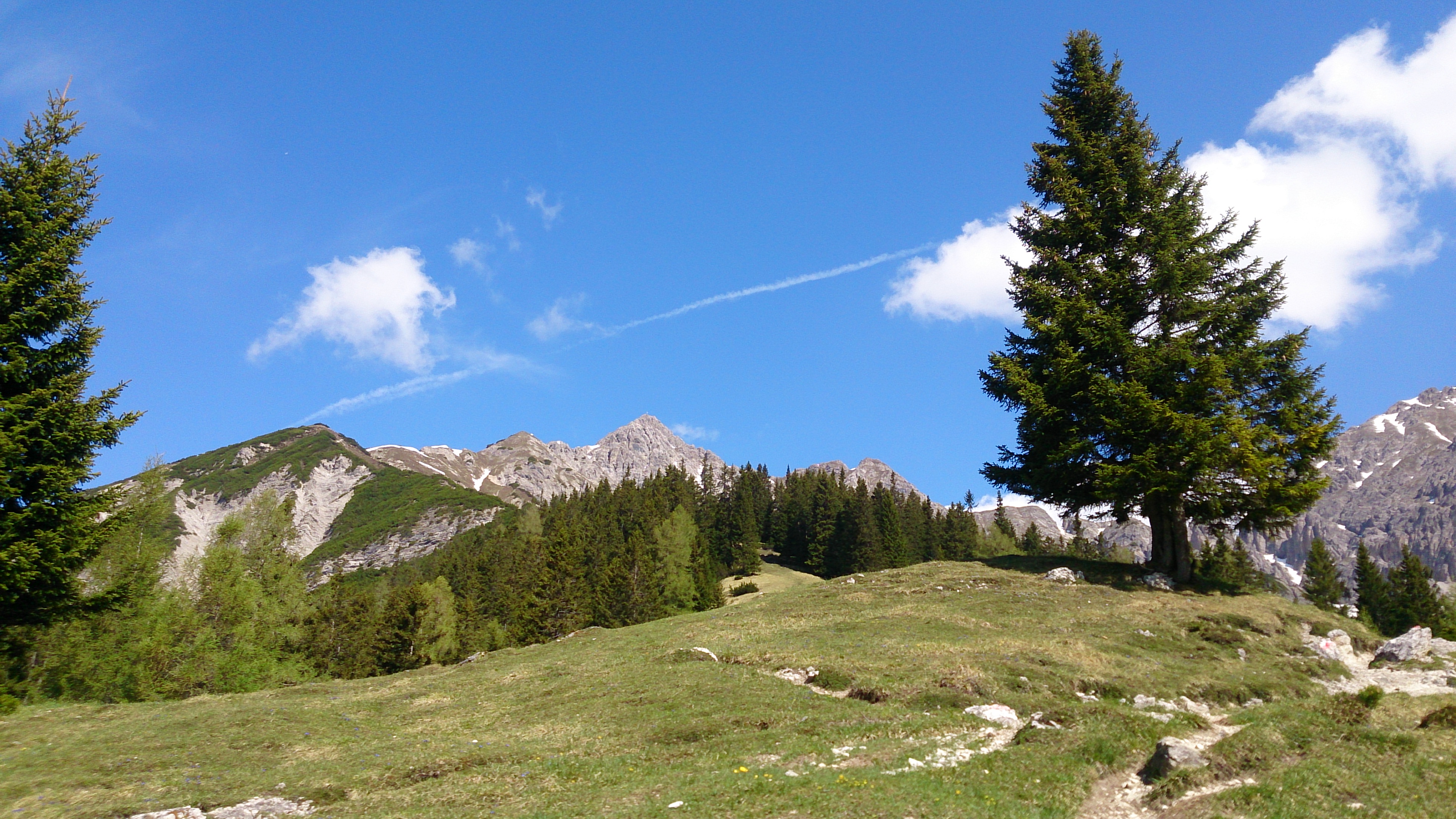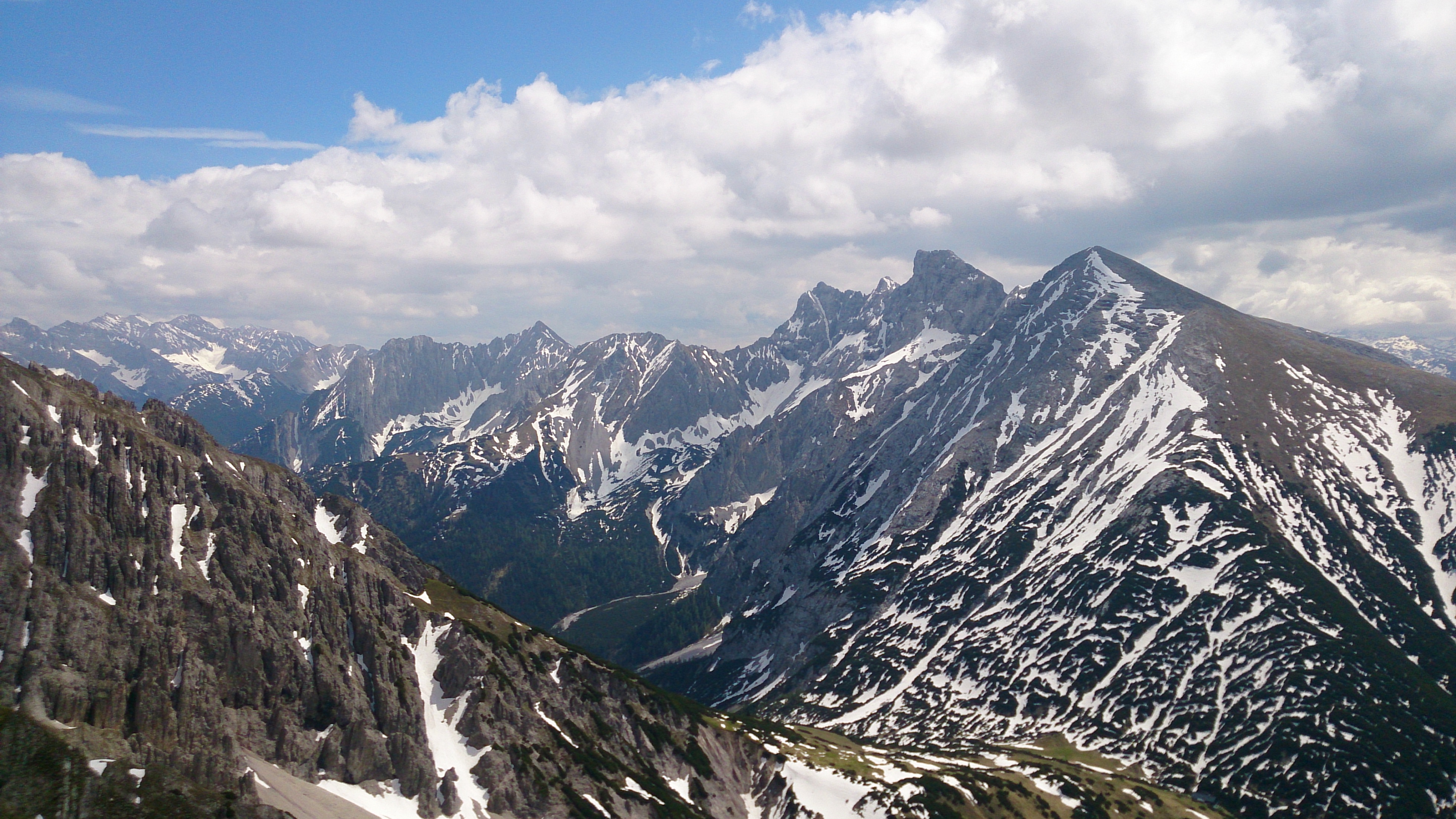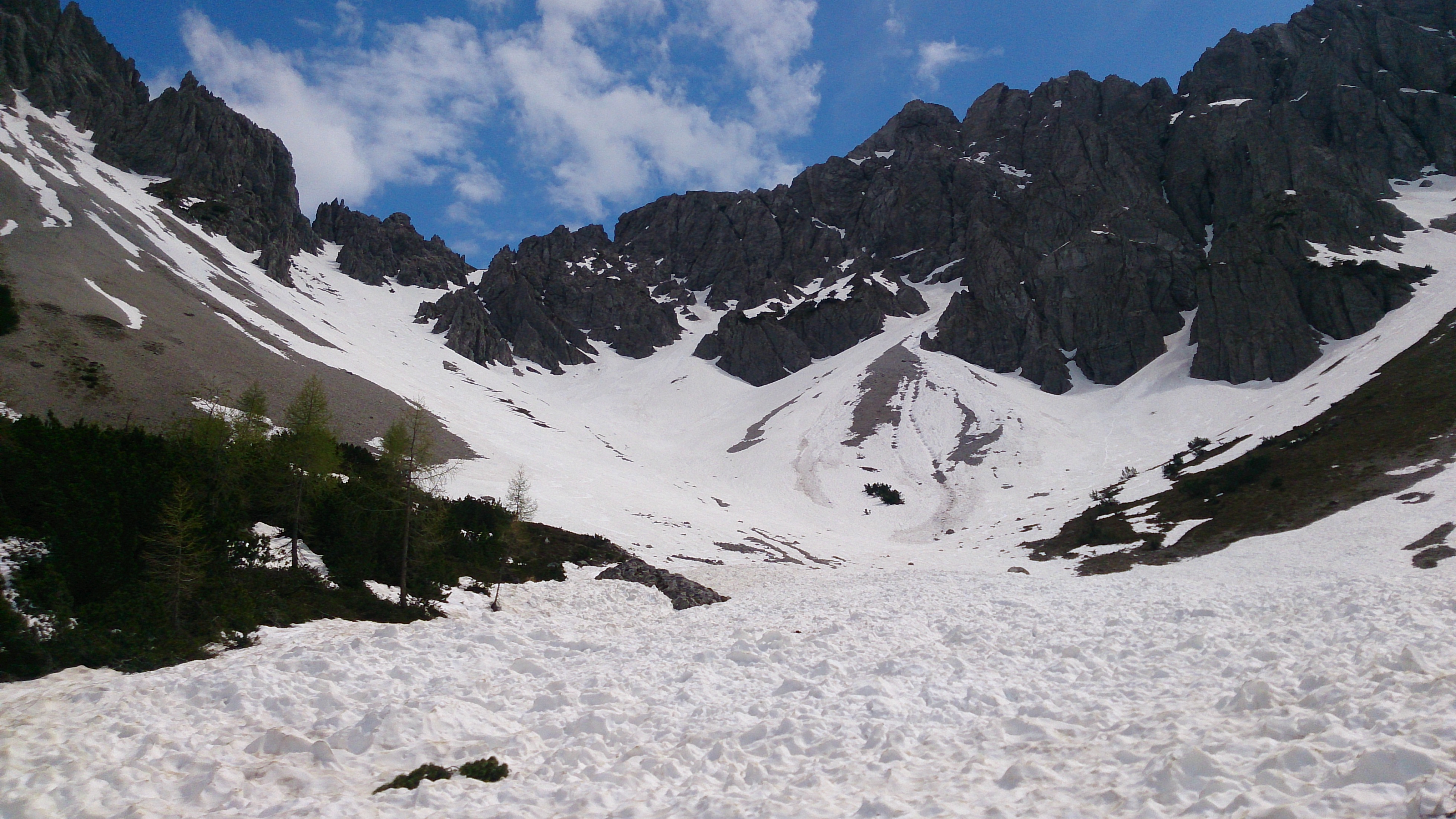 Eigentlich war noch die Erlscharte geplant (und es gäbe im Gebiet noch mehrere andere Scharten), aber angesichts der angekündigten Gewitter und einer zwischenzeitlichen Verdunkelung des Himmels entschied ich mich für den direkten Weg ins Tal. Der Hang wäre aber ohnehin schon recht ausgeapert gewesen. Allerdings war der Wetterbericht mal wieder viel zu pessimistisch, um 16 Uhr sogar wieder strahlender Sonnenschein.