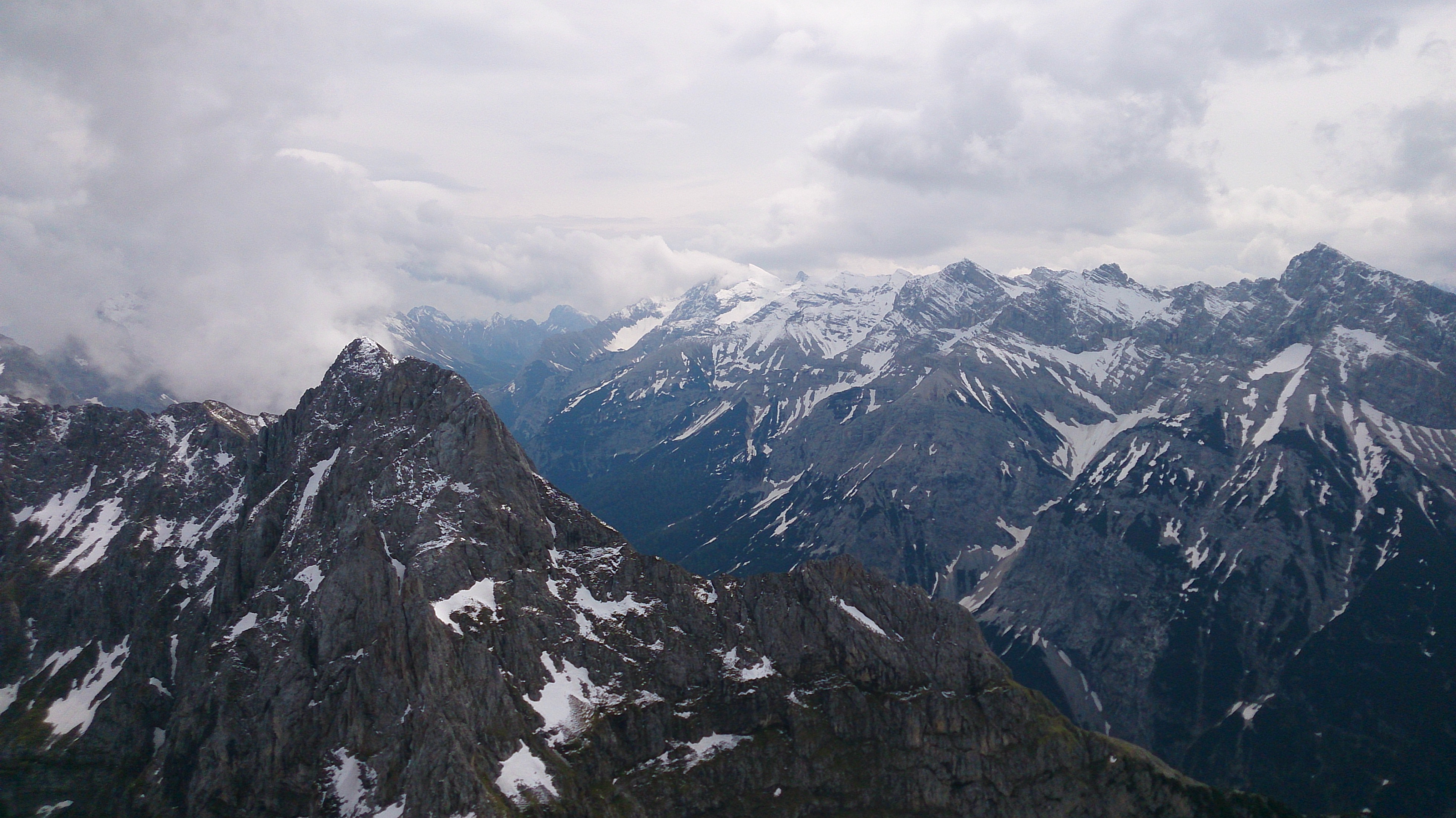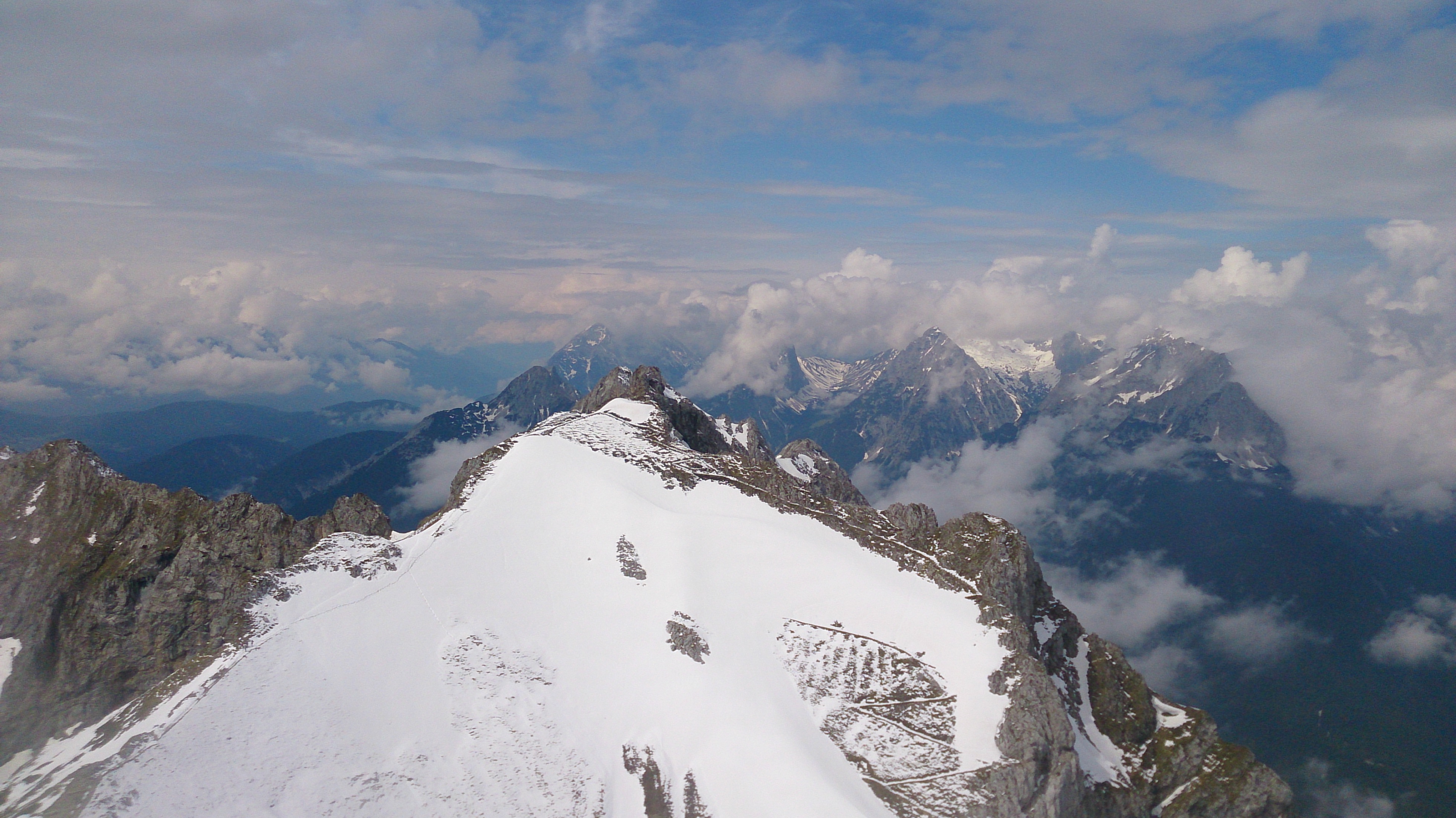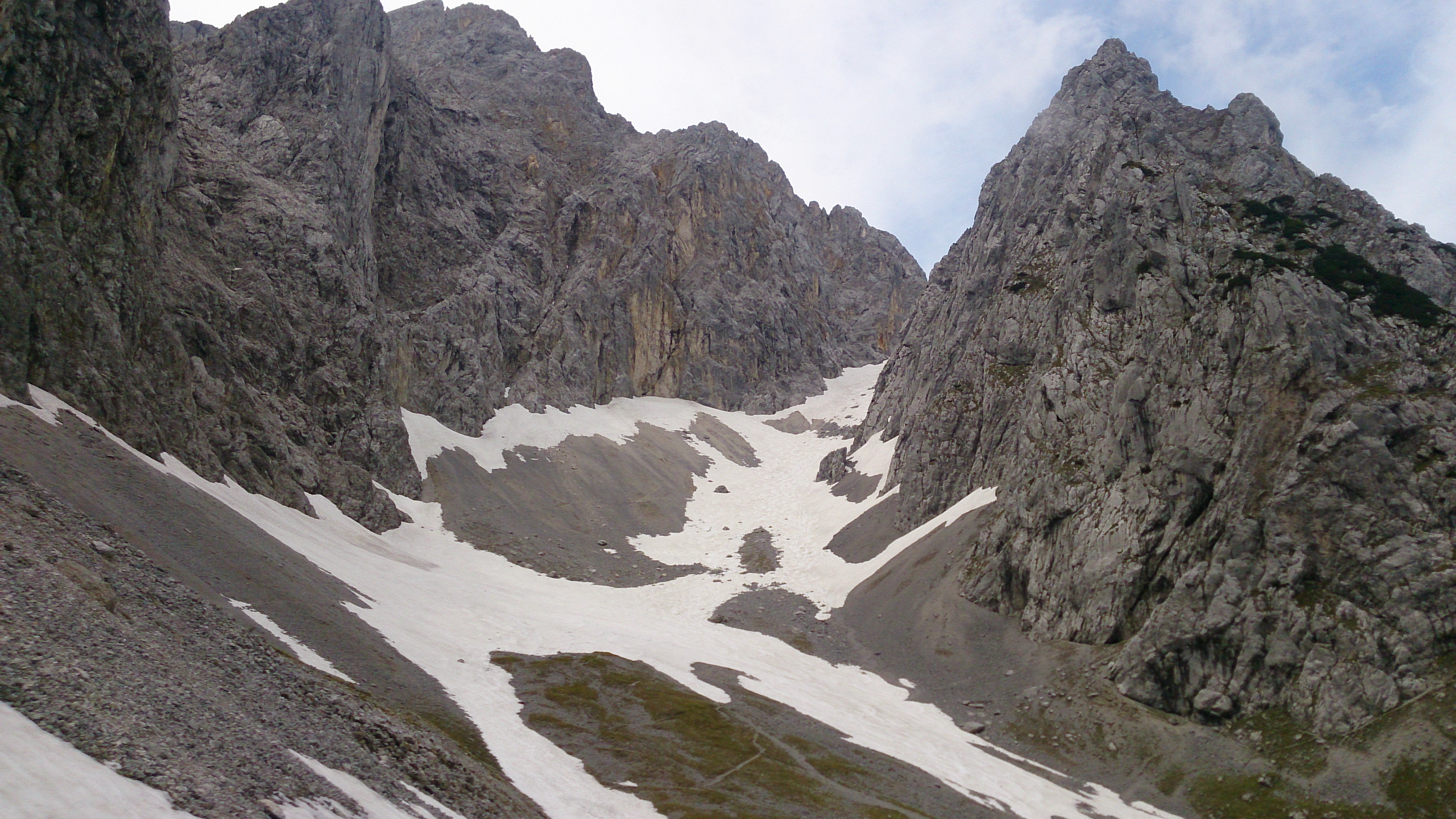 Immer wieder überraschend finde ich, dass es derart viele Touristen dazu drängt, das noch überwiegend schneebedeckte Dammkar im Abstieg oder auch im Aufstieg zu Fuß zu begehen. Mit Skiern ist man da zur Zeit sicher noch im Vorteil. Ob jedem der teilweise nicht sehr sicher wirkenden Begehern wirklich bewusst ist, welche Geschwindigkeit sie aufnehmen, wenn sie auf den steilen Schneefeldern ins Rutschen kommen (heute weicher Schnee, aber das kann ja auch mal anders sein)? Wer es wirklich machen will, sollte auf jeden Fall gute Bergschuhe haben und Gamaschen sind sicherlich auch sinnvoll. Insgesamt gibt es aber bestimmt schönere Wanderungen, und v.a. schneefreie. Eine Bitte an alle, die es nicht lassen können: Bitte lauft die Schneehänge doch nicht auf voller Breite - die tiefen Stapfen sind bei der Skiabfahrt nicht besonders schön. Etwas gegenseitige Rücksicht wäre einfach nett.