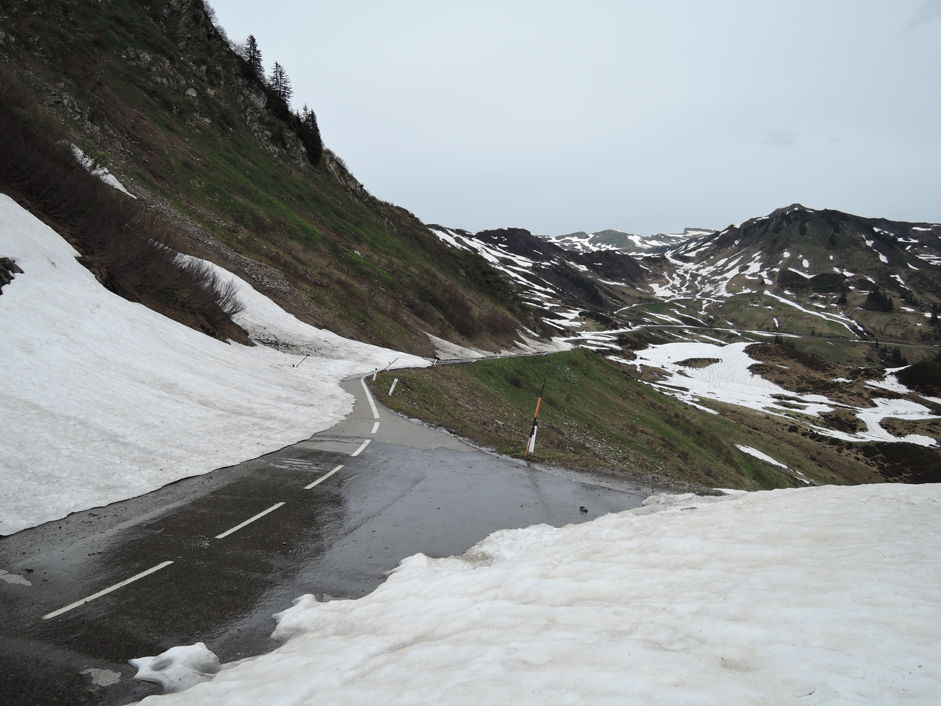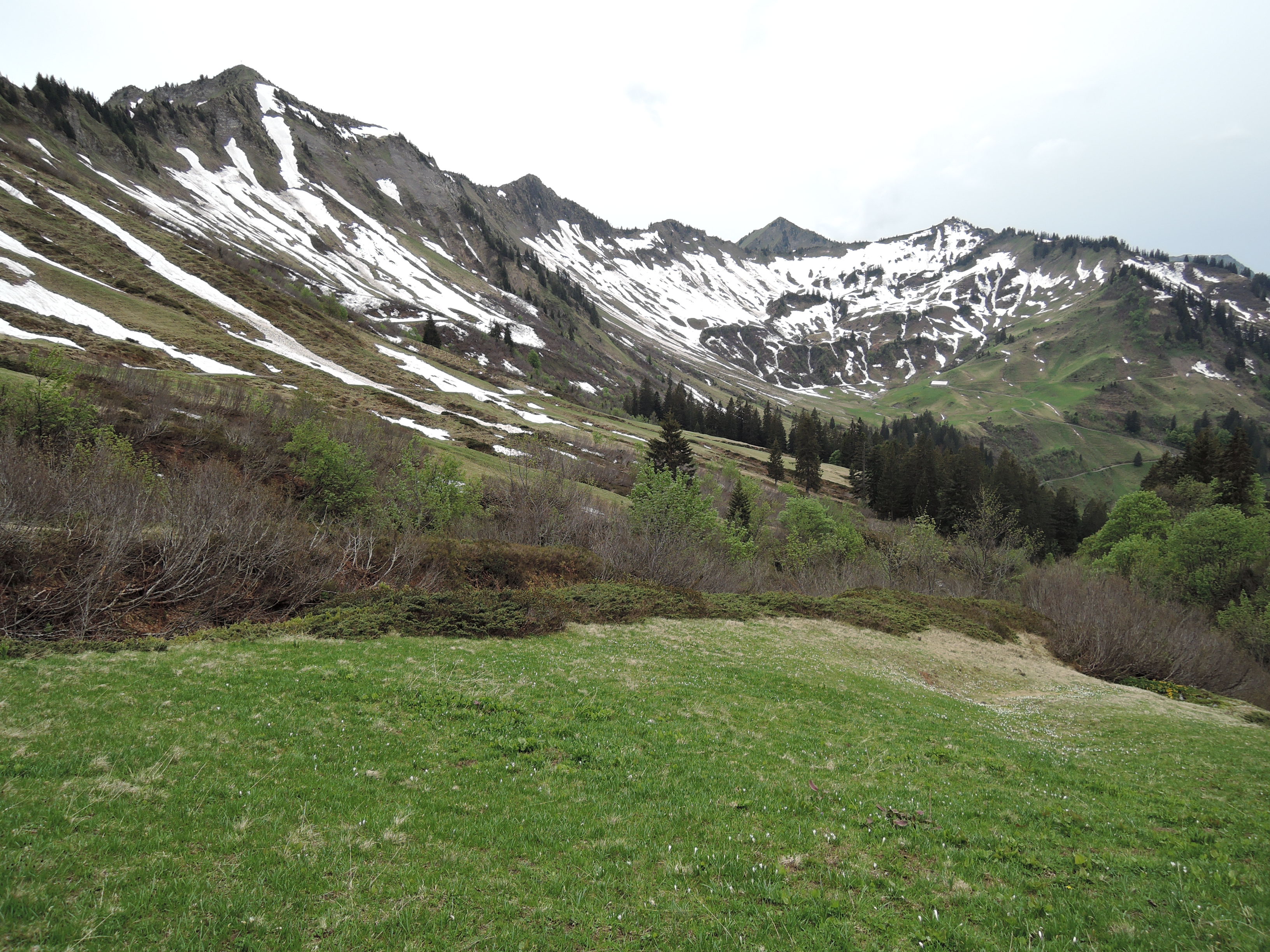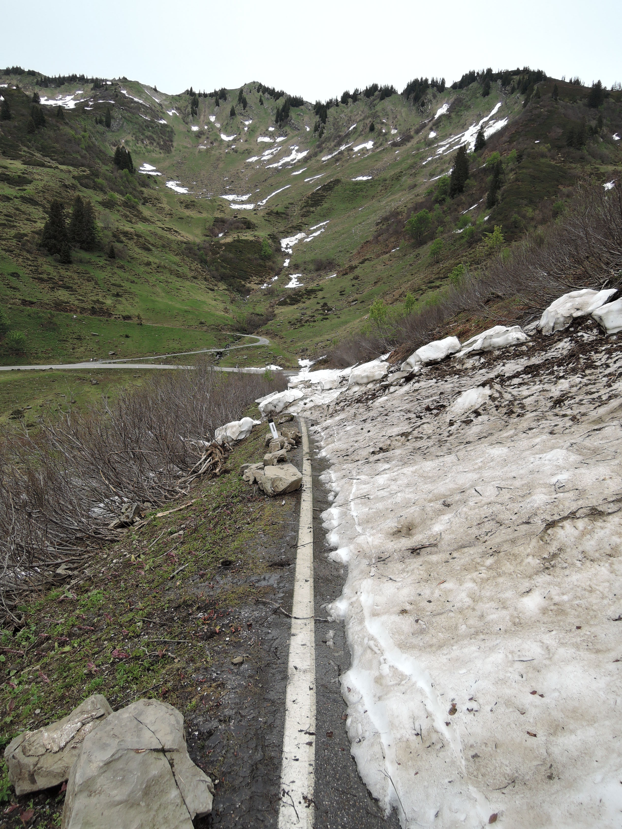 ) sind wir gleich am Ende des Laternesertals losgegangen. Ein Stück auf der gesperrten Straße dann rechts ab auf die Route zur Gehrenspitze (Skitour) und bei der ersten Alpe links durch den Wald auf gutem Pfad bergan. Unterhalb der Passhöhe trifft man auf eine weitere Alpe. Hier die frischen Wiesen voll mit Krokussen und vereinzelten Bergblumen. Es ist noch früh im Bergsommer auf dieser Höhe. Nach gut 600hm erreicht man die Passhöhe. Hier oben noch viel Schnee ringsum und vor allem auf der Straße. Stellenweise auch Lawinenschnee. Die Straße muss wohl erst freigebaggert werden damit sie befahrbar wird. Wir hatten Wetterglück. Vormittags etwas Nebel und leichter Regen, später trocken und halbwegs aufgeheitert. Eine schöne Eingehtour am Pfingstsonntag!
