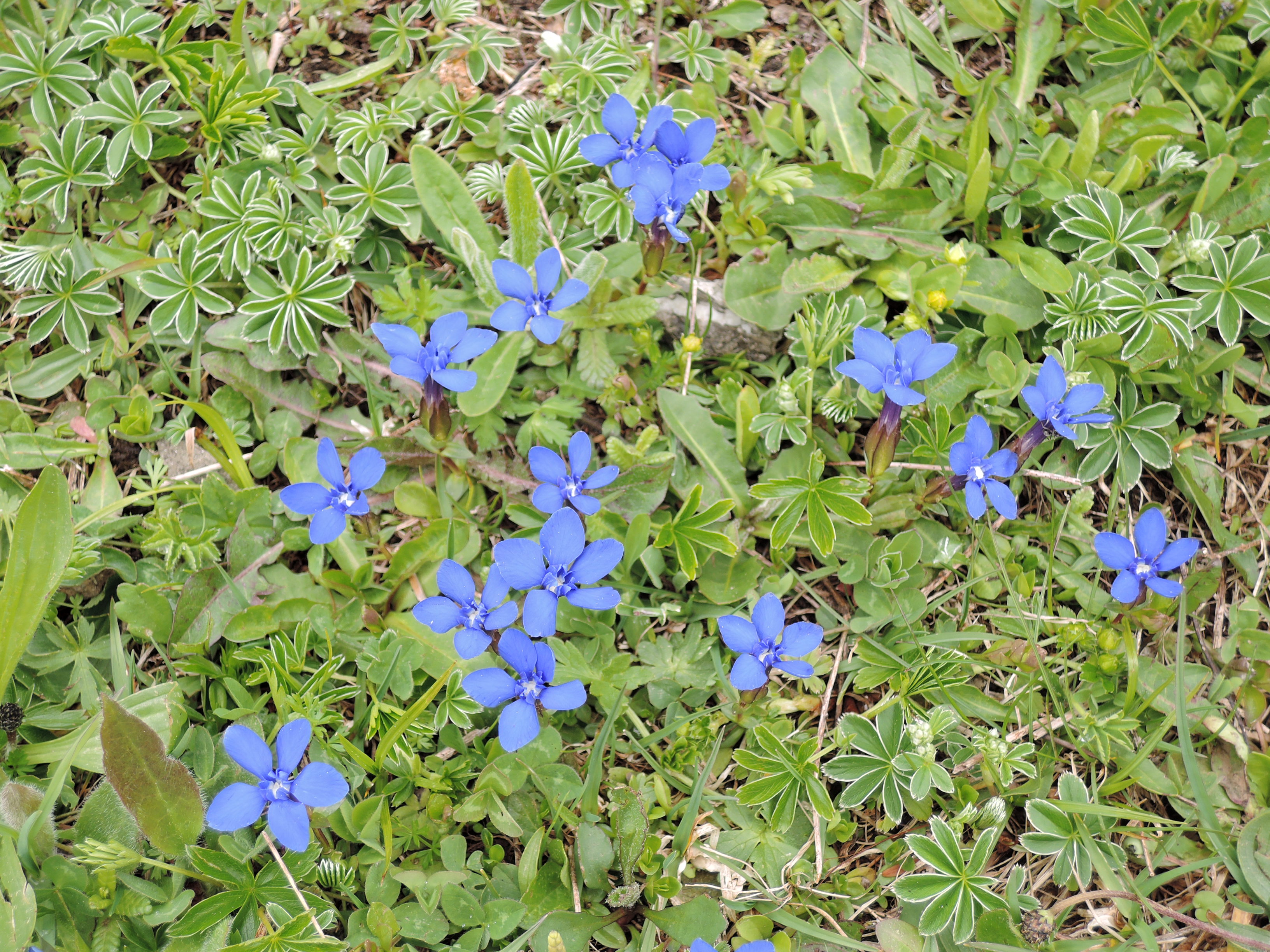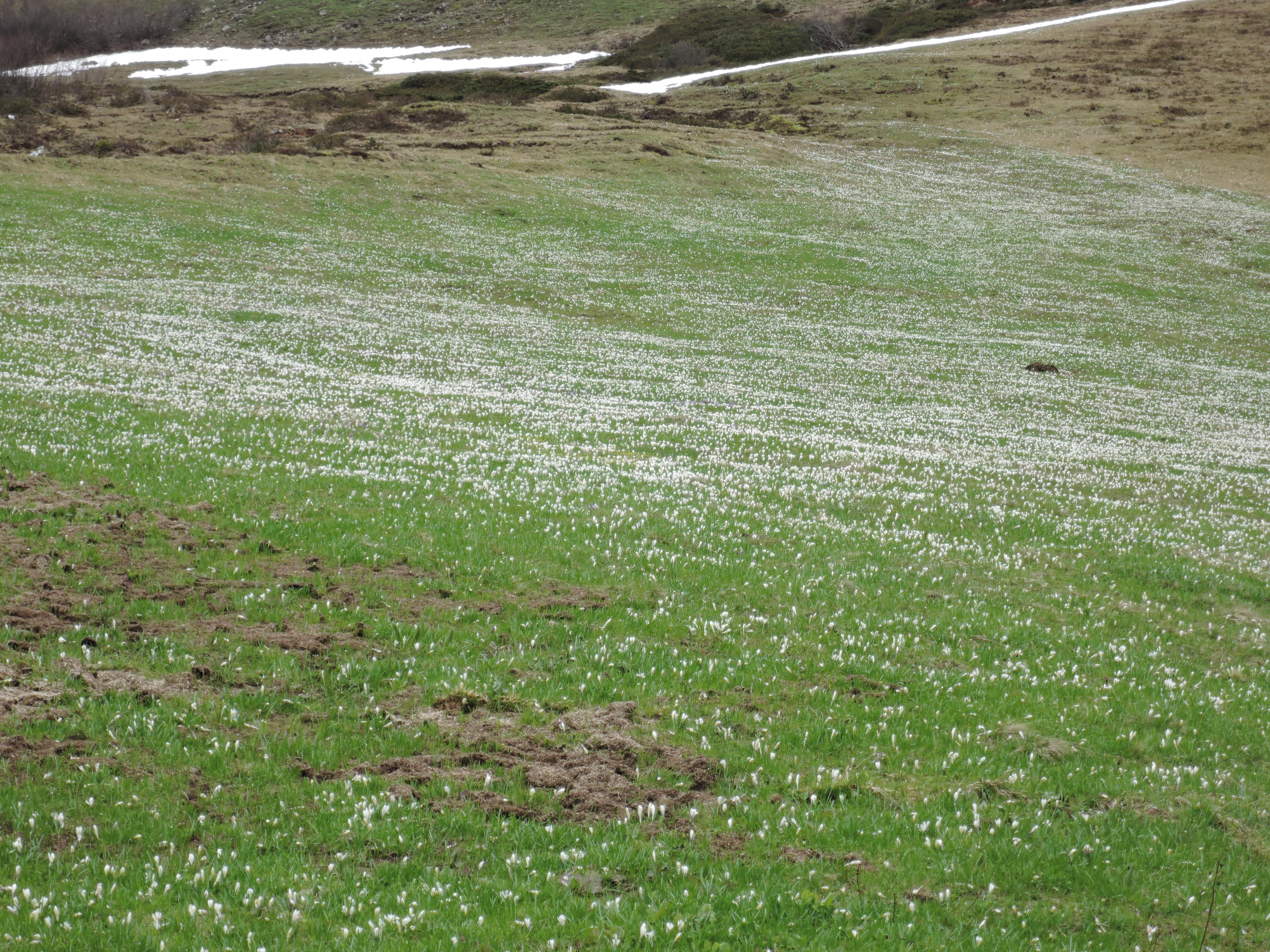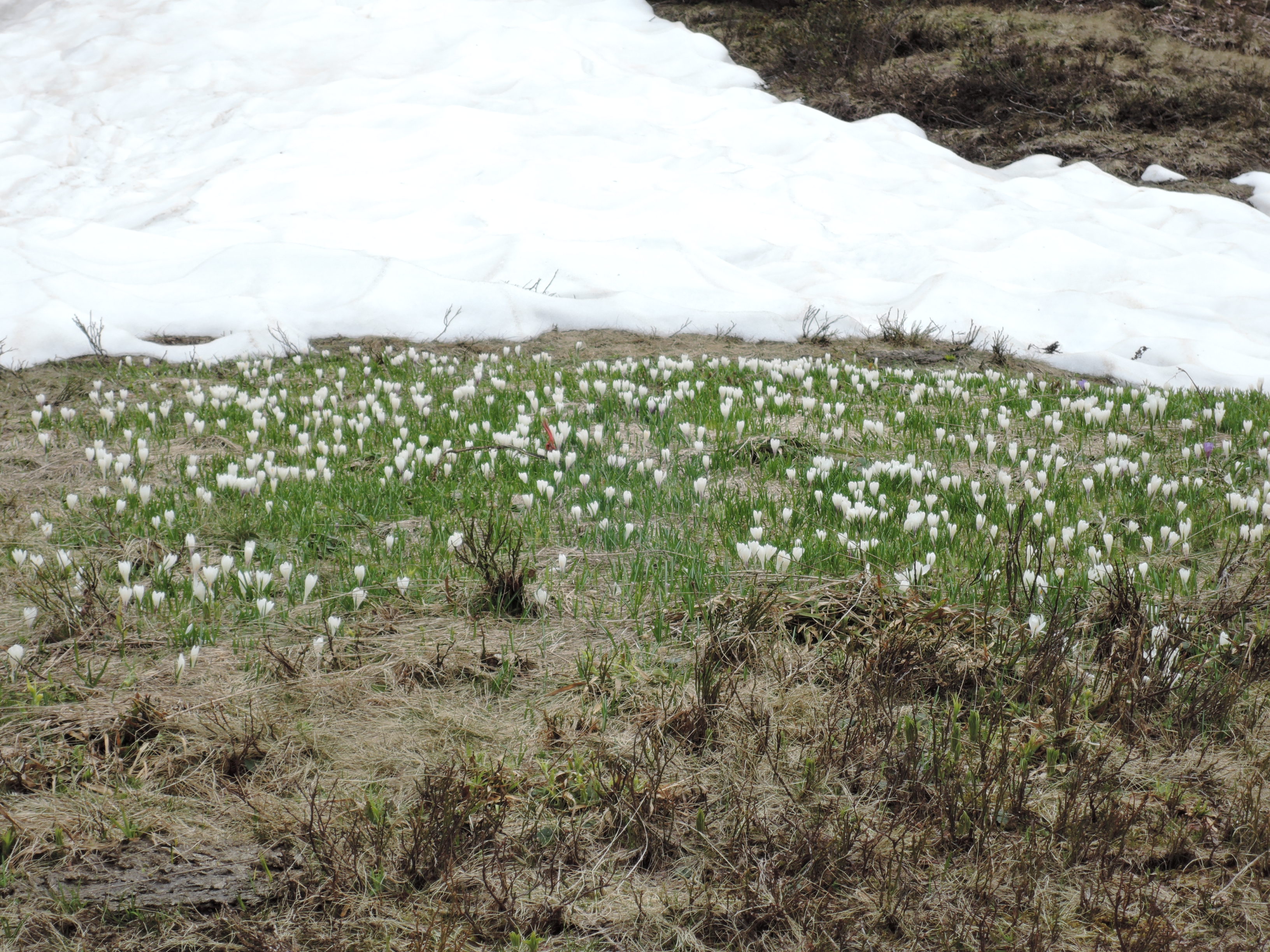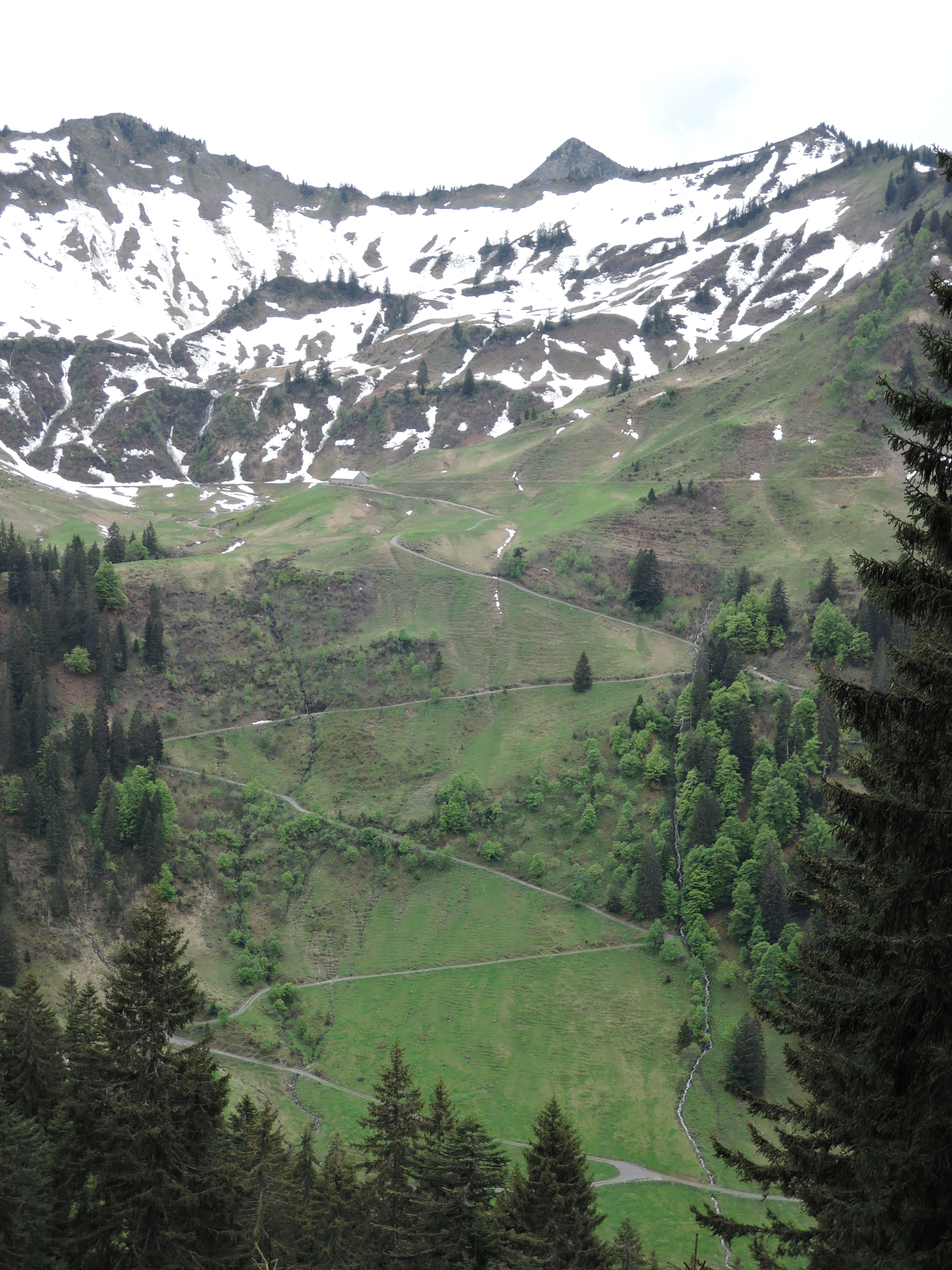 ) sind wir gleich am Ende des Laternesertals losgegangen. Ein Stück auf der gesperrten Straße dann rechts ab auf die Route zur Gehrenspitze (Skitour) und bei der ersten Alpe links durch den Wald auf gutem Pfad bergan. Unterhalb der Passhöhe trifft man auf eine weitere Alpe. Hier die frischen Wiesen voll mit Krokussen und vereinzelten Bergblumen. Es ist noch früh im Bergsommer auf dieser Höhe. Nach gut 600hm erreicht man die Passhöhe. Hier oben noch viel Schnee ringsum und vor allem auf der Straße. Stellenweise auch Lawinenschnee. Die Straße muss wohl erst freigebaggert werden damit sie befahrbar wird. Wir hatten Wetterglück. Vormittags etwas Nebel und leichter Regen, später trocken und halbwegs aufgeheitert. Eine schöne Eingehtour am Pfingstsonntag!