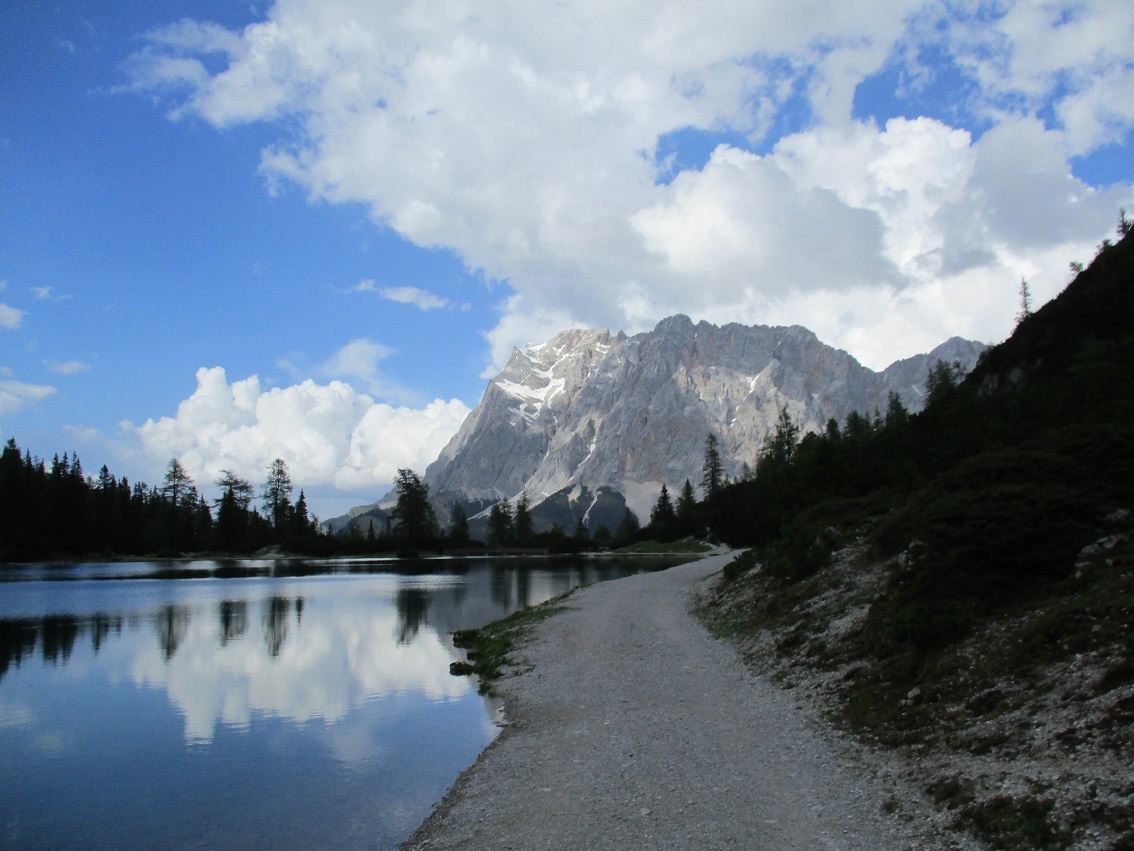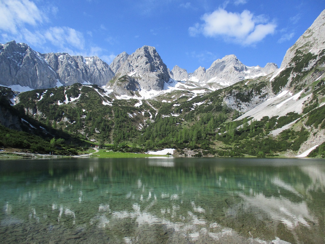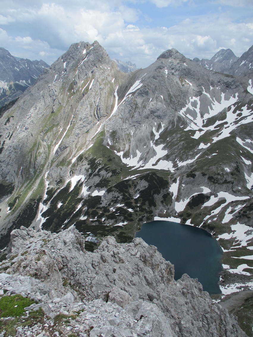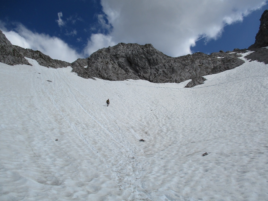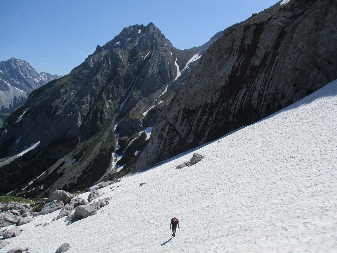 Tourenverhältnisse: Sehr gut / Schöne nicht zu steile Auffahrt durch's Gaistal zum Seebensee / Zustieg zur Coburger Hütte schneefrei / Im weiten Kar beim Zustieg + Abstieg noch gut gehbare Schneefelder / Felsen komplett trocken und schneefrei / Abstieg am Südgrat ebenfalls schneefrei