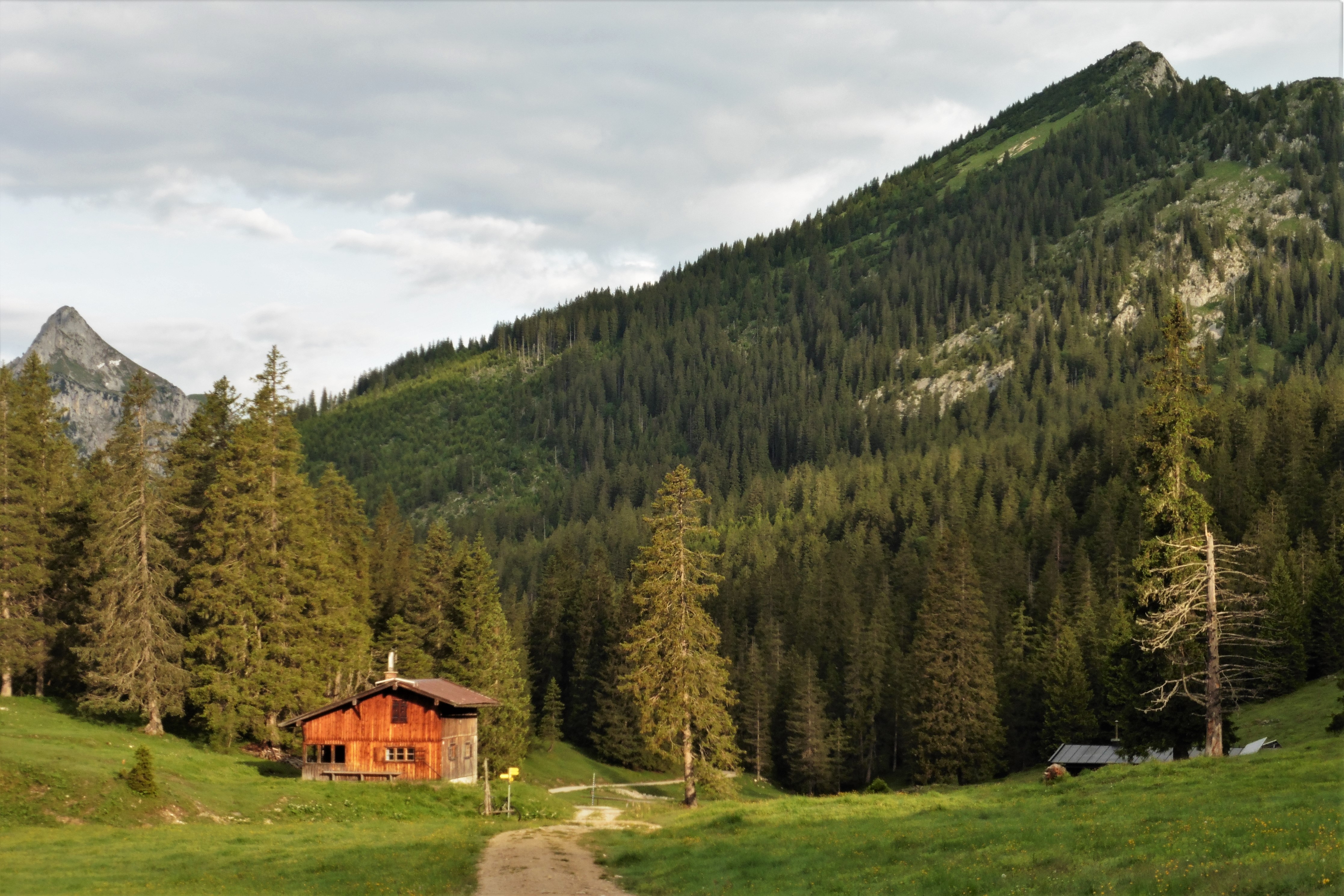 Bild 1: die Jägerhütte mit Säuling und Hohen Straußberg;