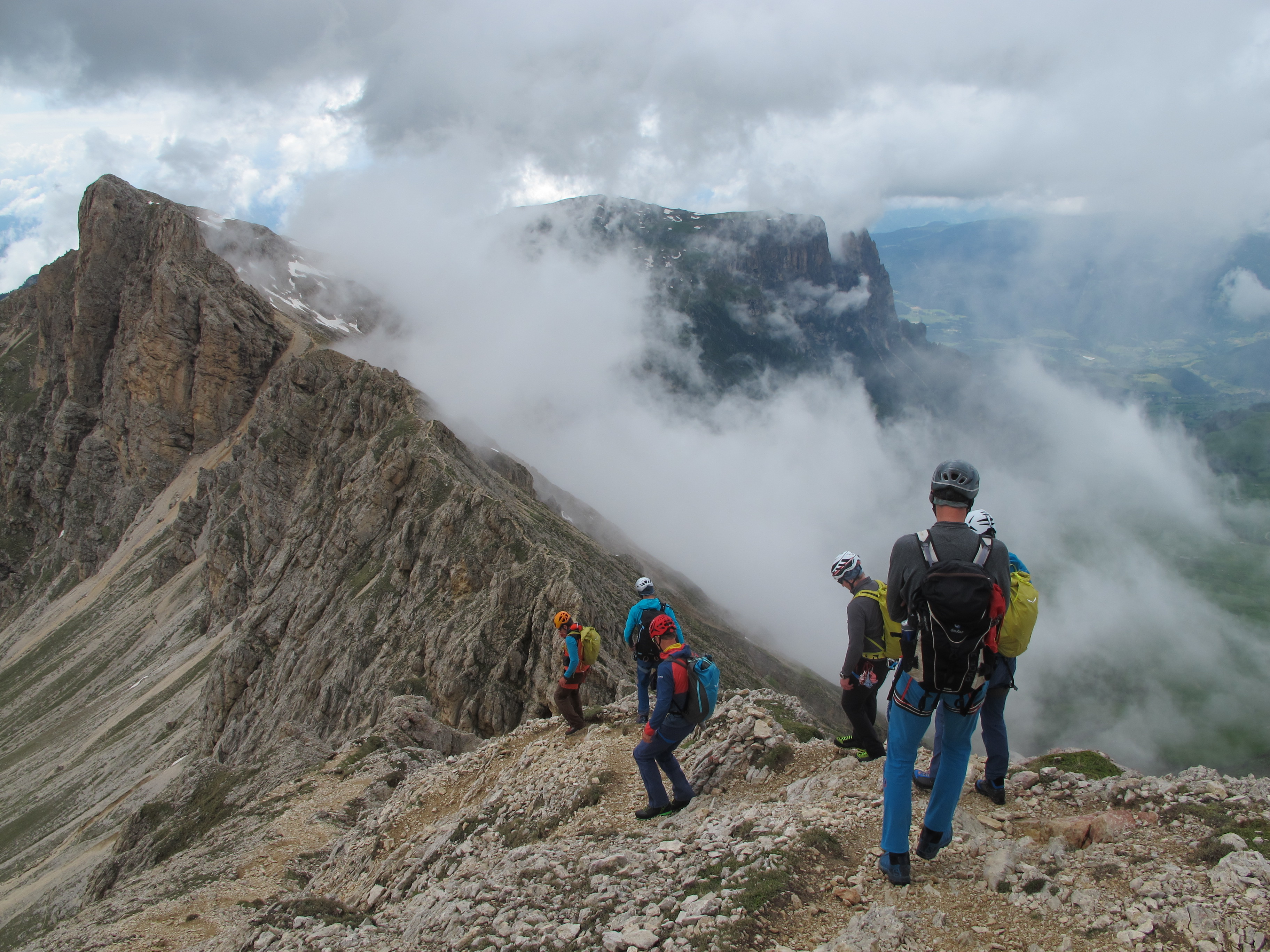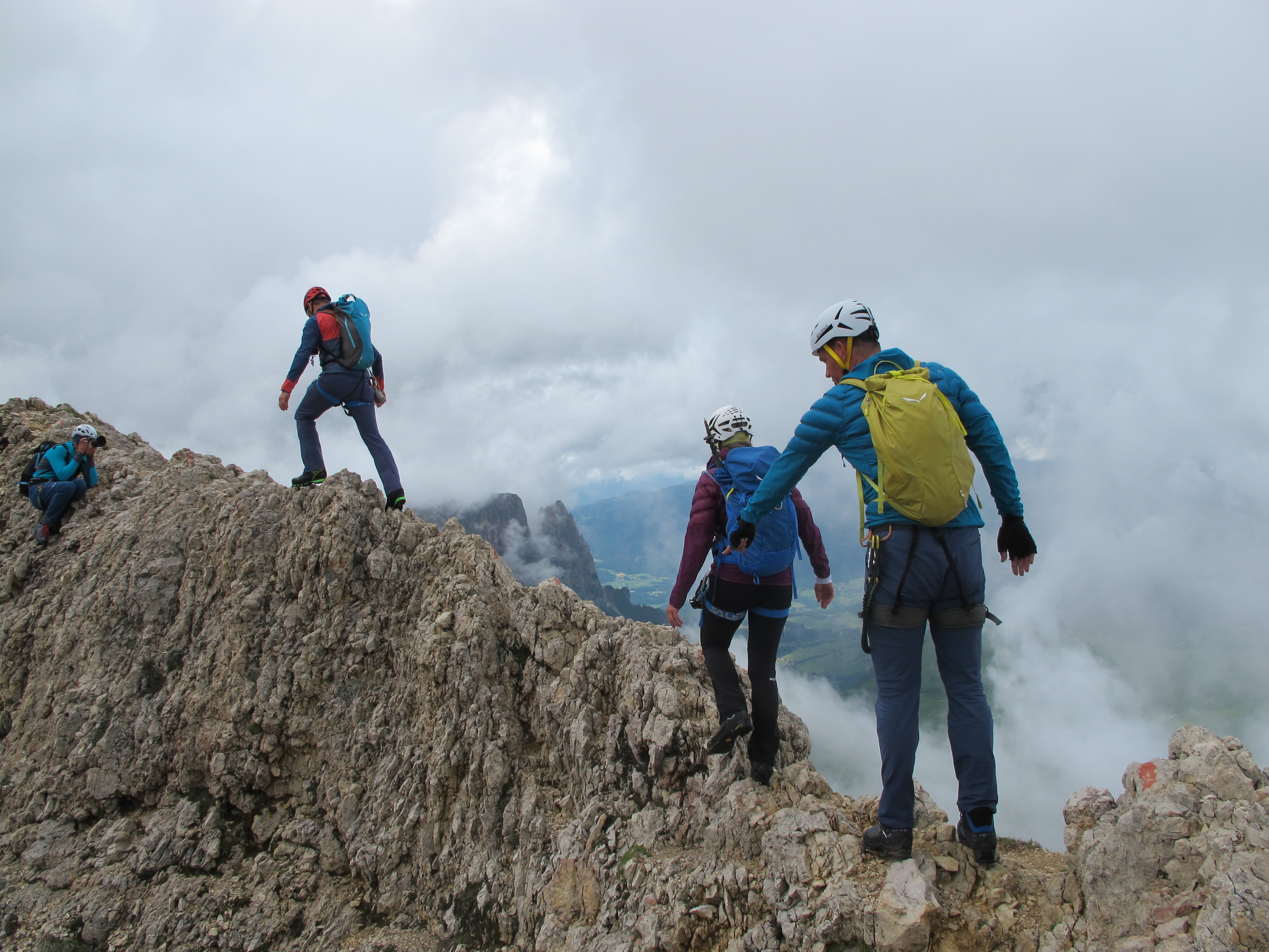Tourenverhältnisse: Bei strömendem Regen am Donnerstagnachmittag auf die Grasleitenhütte. sie ist seit heute offiziell geöffnet. auch der Freitag begann regnersich, bot aber am Nachmittag ein kurzes Schönwetterfenster, um die Tour fast trocken und teilweise bei Sonne durchzuführen. Die Route hinauf zur Tierser Alpe (sehr schönes neues Schutzhaus!) und auch der Maximilian-Klettersteig waren schneefrei, ebenso die Überschreitung der Roßzähne sowie der Roterdspitze. Der Abstieg über den Molignon-Pass war schneebedeckt, auch die steile Rinne. Am Nachmittag war der Schnee aber weich und gut zu gehen. Sommerschnee.