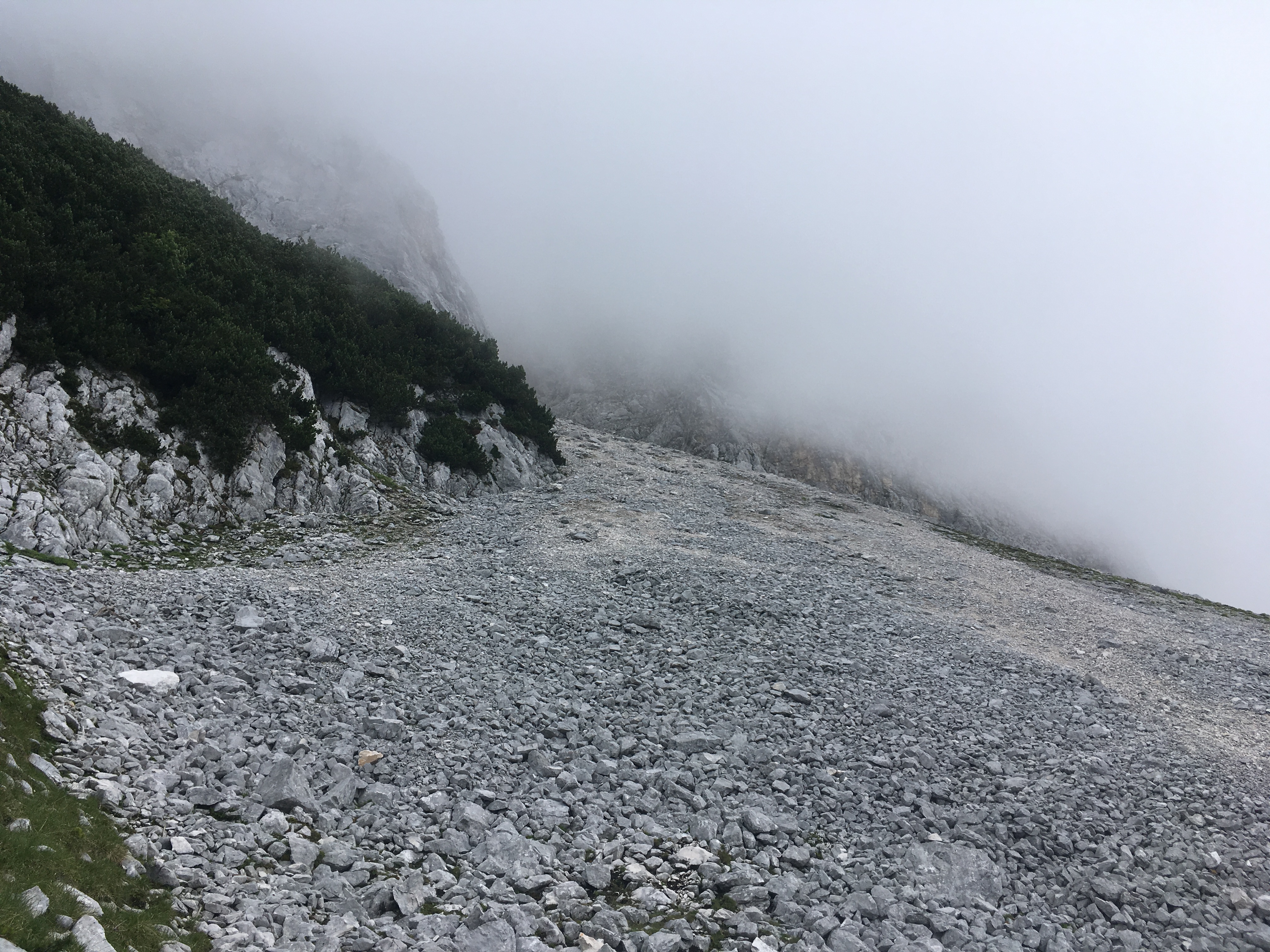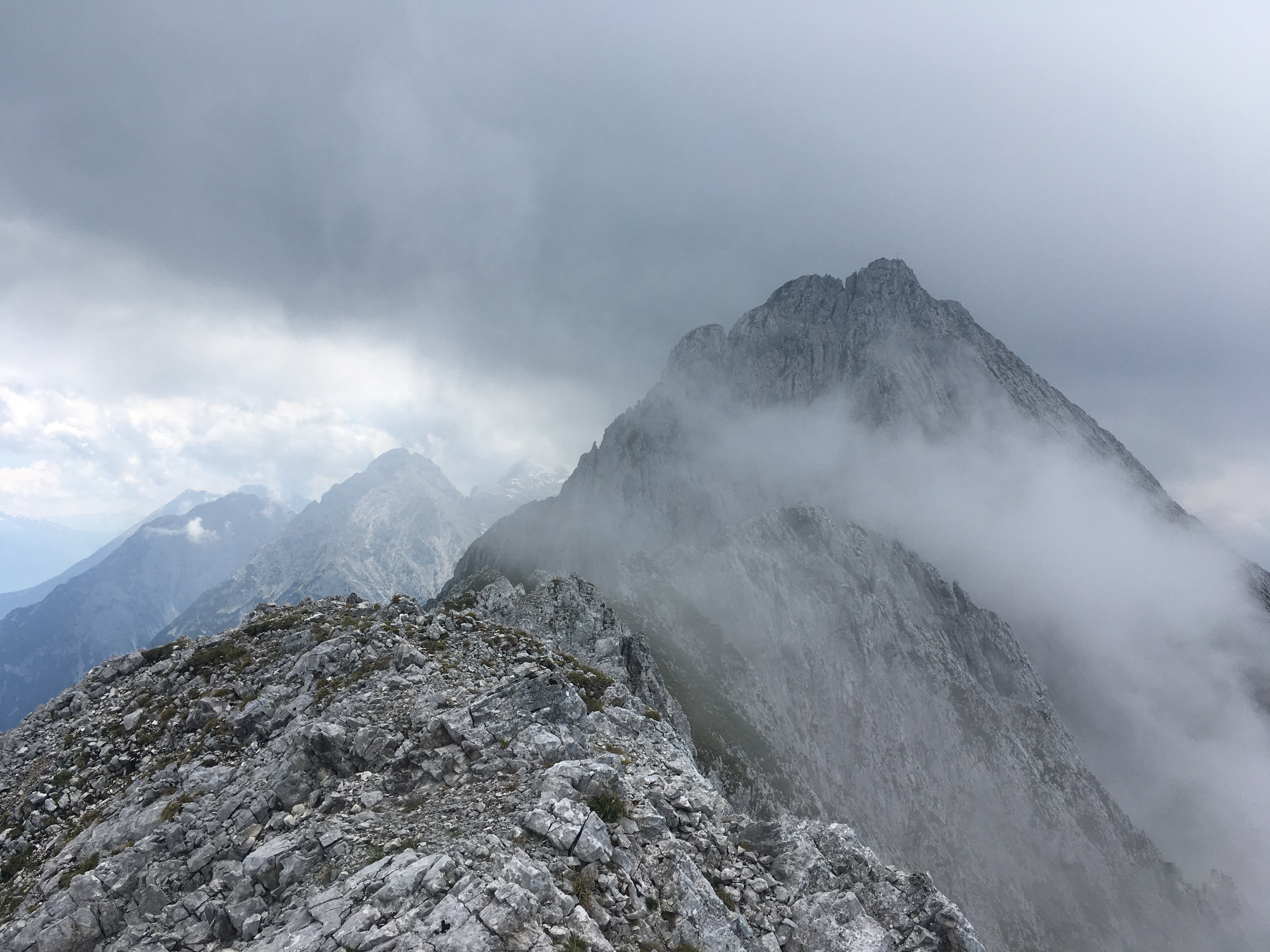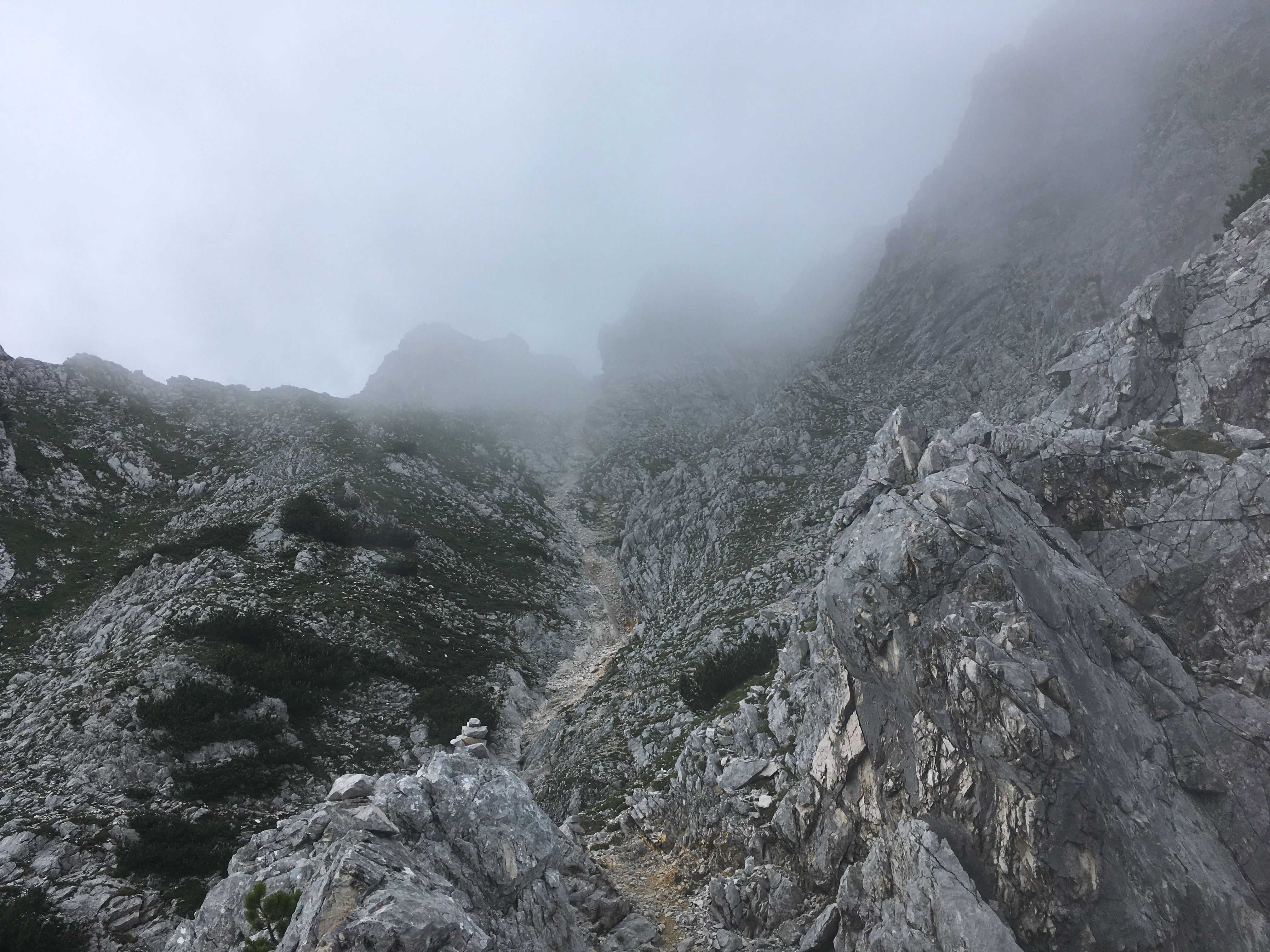 Sonstiges: Am Sonntag gab es als Ausweichtour nach einer großen Bahnstörung am Morgen die schon lange auf meinem alpinen Wunschzettel stehende Untere Wettersteinspitze - ein vor allem von Mittenwald sehr beeindruckender Berg. Nach Zustieg über den Franzosensteig zum Sattel zwischen Grünkopf und der Unteren Wettersteinspitze geht es noch ein bißchen Richtung Leutasch, ehe bei einem jetzt wieder aufgeschichteten Steinmann nach rechts der anfangs sehr undeutliche Steig abzweigt. Gut auf die vereinzelten Steinmänner und verblasste grüne Punkte achten - die Route mit ihren vielen Wendungen ist nicht immer selbsterklärend. Auf ca. 1.630 m kommt man schließlich zu einem kleinen Hütterl. Nach kurzer, flacher Querung geht es dann tendenziell leicht rechts haltend hoch. Bei Nebel wie bei mir im Aufstieg hat das Potential, falsch zu gehen, insbesondere sich zu sehr Richtung Südwände zu halten - dahin führen auch Steigspuren. Ab Erreichen des Schuttfelds auf gut 1.800 m ist die Route dann aber klar: Hoch zur Ostrinne und dann diese hoch. Ich rate, schon unten am Schuttfeld den unbedingt empfehlenswerten Helm aufzusetzen, nicht erst am Beginn der Rinne. In der Rinne kommen gleich am Anfang zwei schwierigere Stellen, dann noch einmal nach ca. 50 Hm eine schwierigere, weil glatte Stelle. Danach wird es deutlich leichter, es ist auch viel alpines Gehgelände dabei. Die Bewertung für die beiden oberen schwierigeren Stellen schwankt offenbar zwischen den Führern und verschiedenen Beschreibungen im Internet: II / III. Die Schwierigkeit ist aber eher, dass im Gelände viel Schutt auf den Felsen liegt und insbesondere nach oben es sehr brüchig wird, als dass die beiden Stellen für sich genommen so schwierig wären. Die beiden glatten Stellen kann man wohl auch ungehen, aber das ist sicher auch ausgesetzt. Notfalls halt die beiden Stellen wenig elegant hoch-/runterrutschen im Stemmschritt. Oben wird die Rinne breiter, ehe bei einer auffälligen höhlenartigen Wandstelle mit gelblichem Fels die Rinne extrem brüchig und eng nach oben sehr steil weiter zieht. Das ist aber falsch, wie ich nach kurzer Zeit feststellte. Richtig geht es nach links hoch zum Grat und den Steinmännern folgend, bis man von oben in die besagte Rinne hinunterschauen kann.